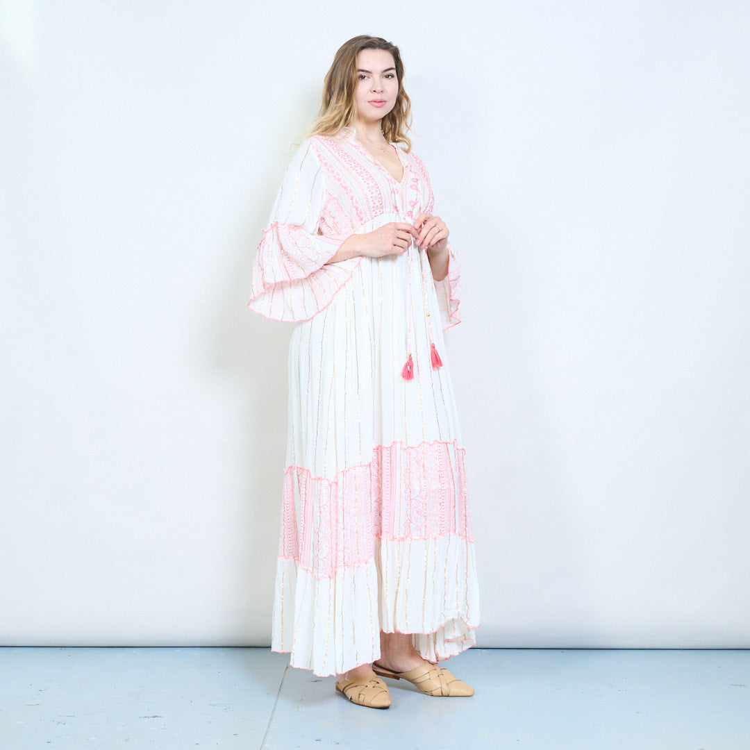 فستان ماكسي مطرز مع تفاصيل شريط عمودي وربطة عنق شرابة بالجملة