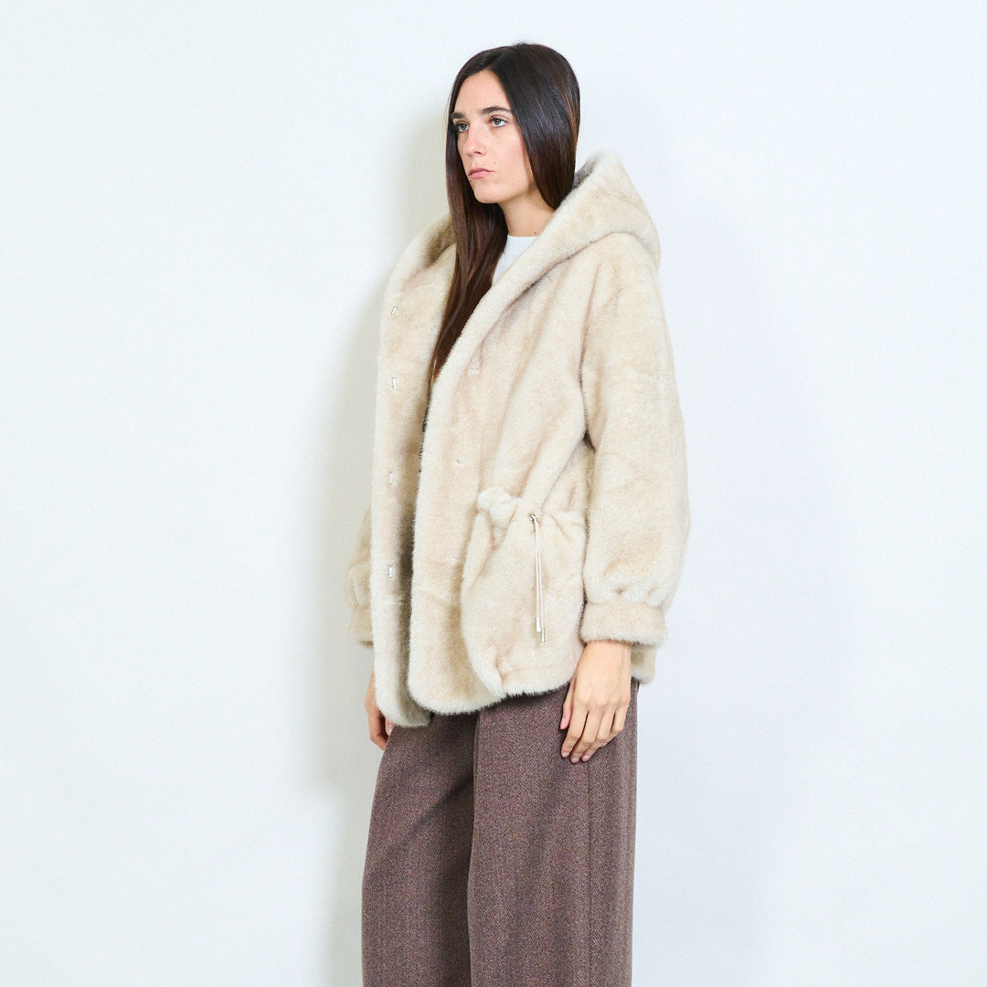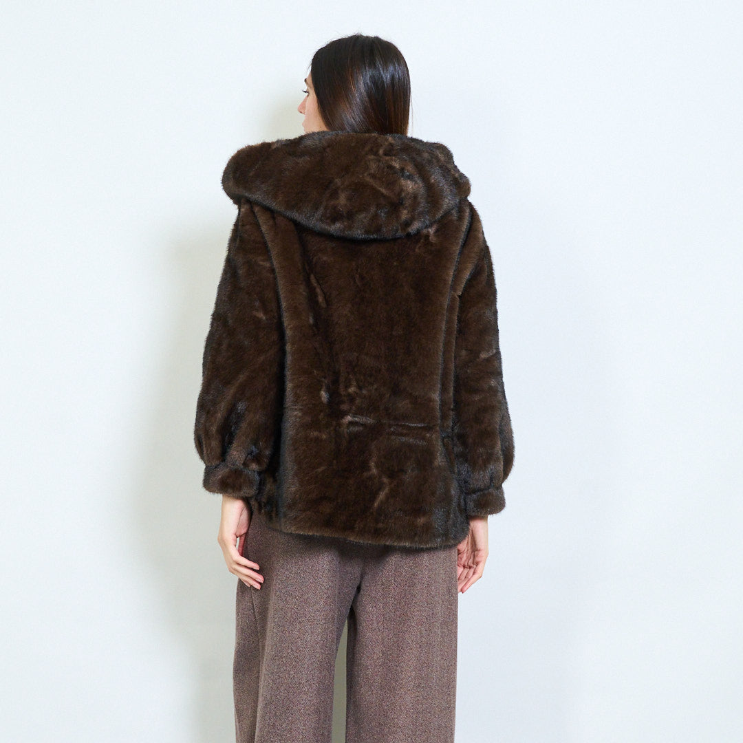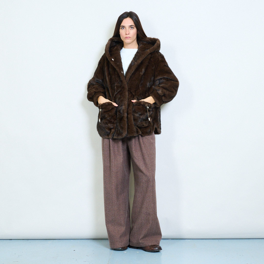 سترة بغطاء للرأس من الفرو الصناعي الفاخر مع تفاصيل جيب مكشكشة بالجملة