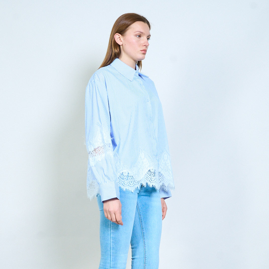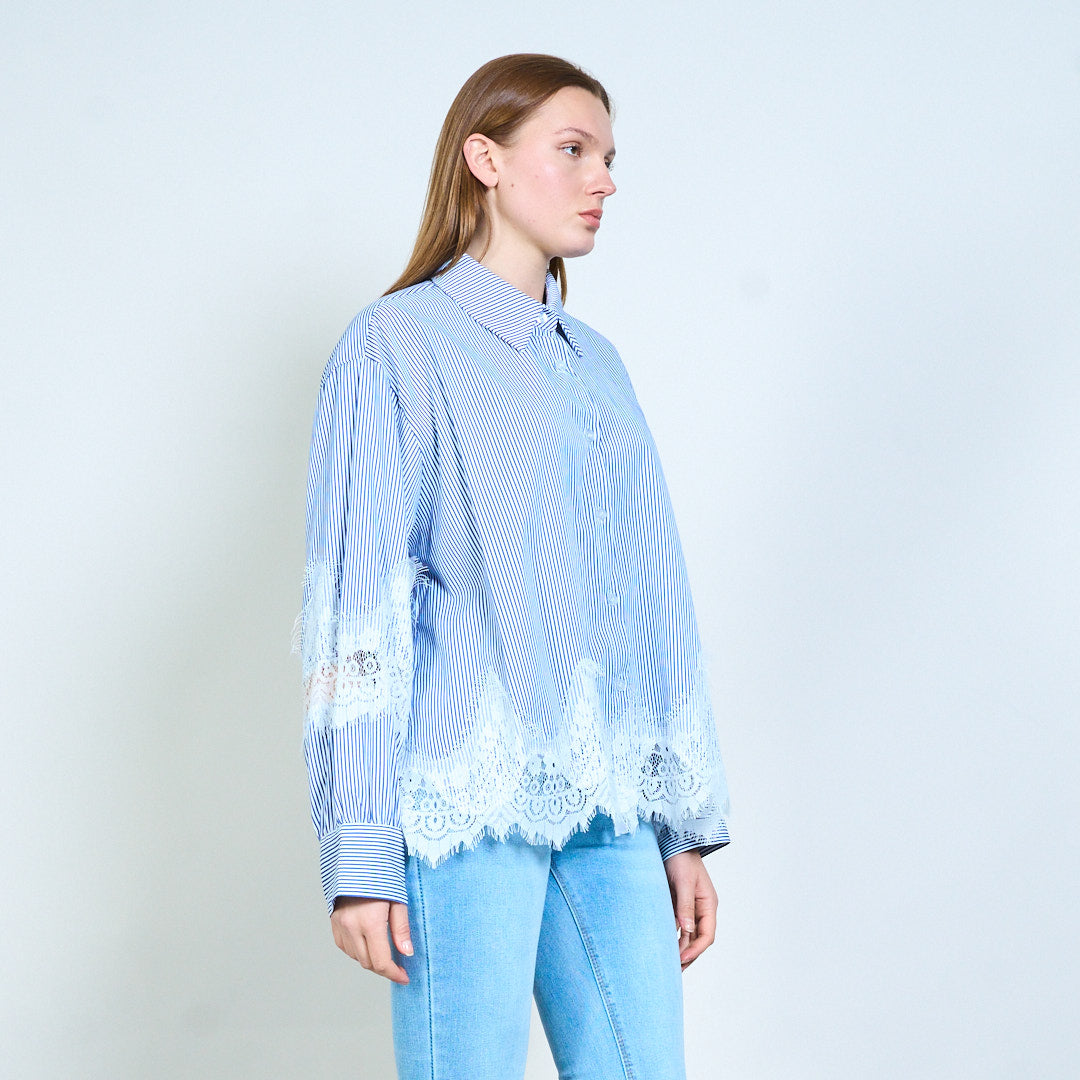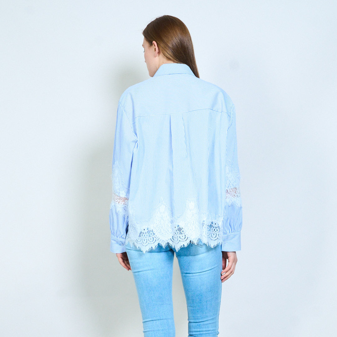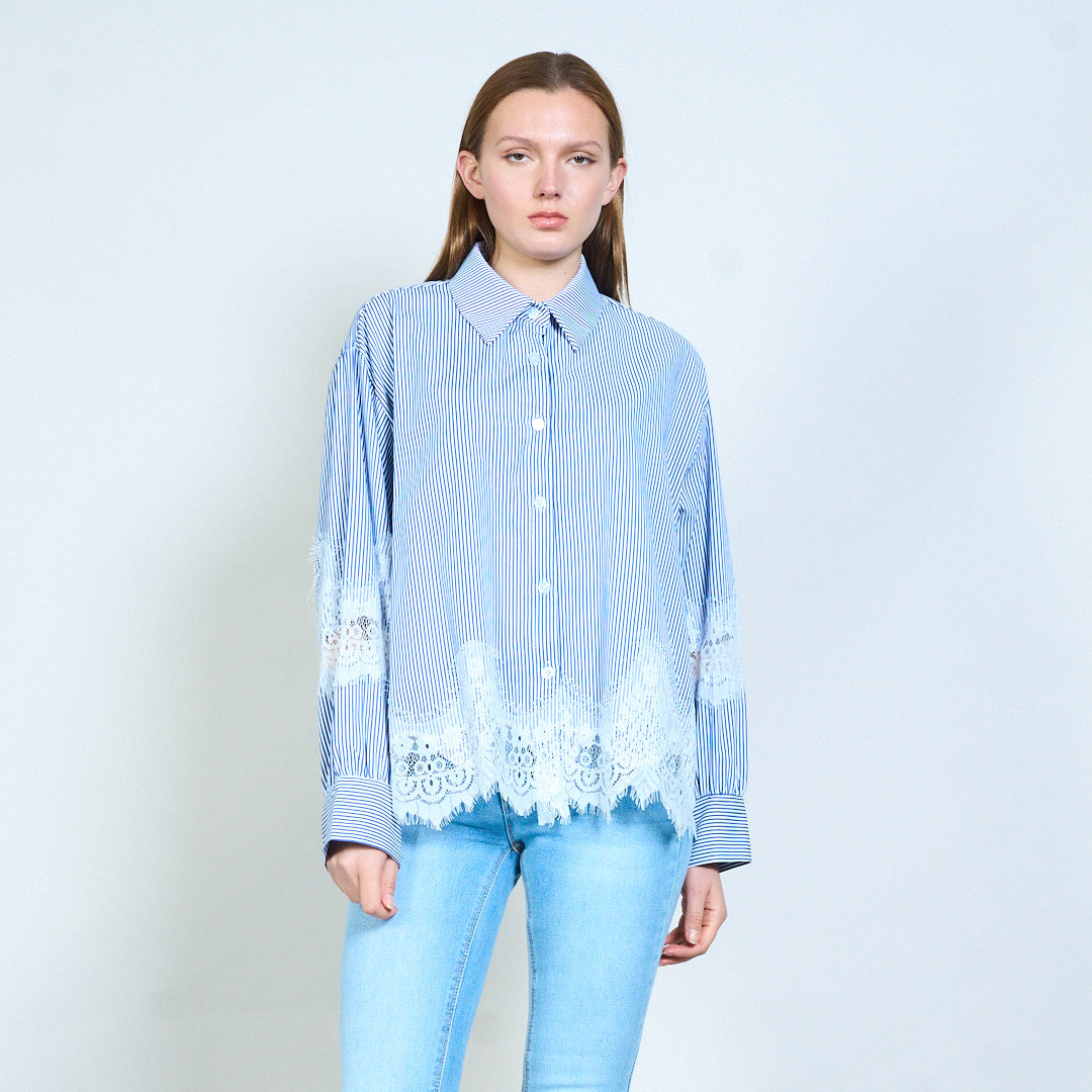 قميص مخطط بحاشية من الدانتيل مع ياقة كلاسيكية بالجملة