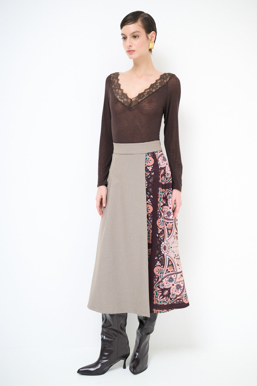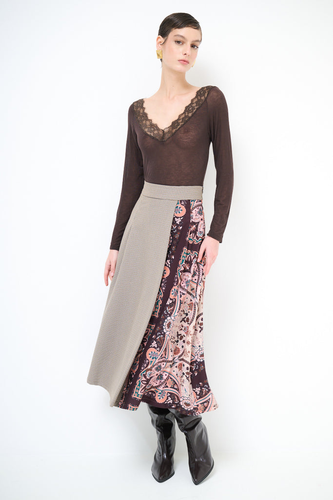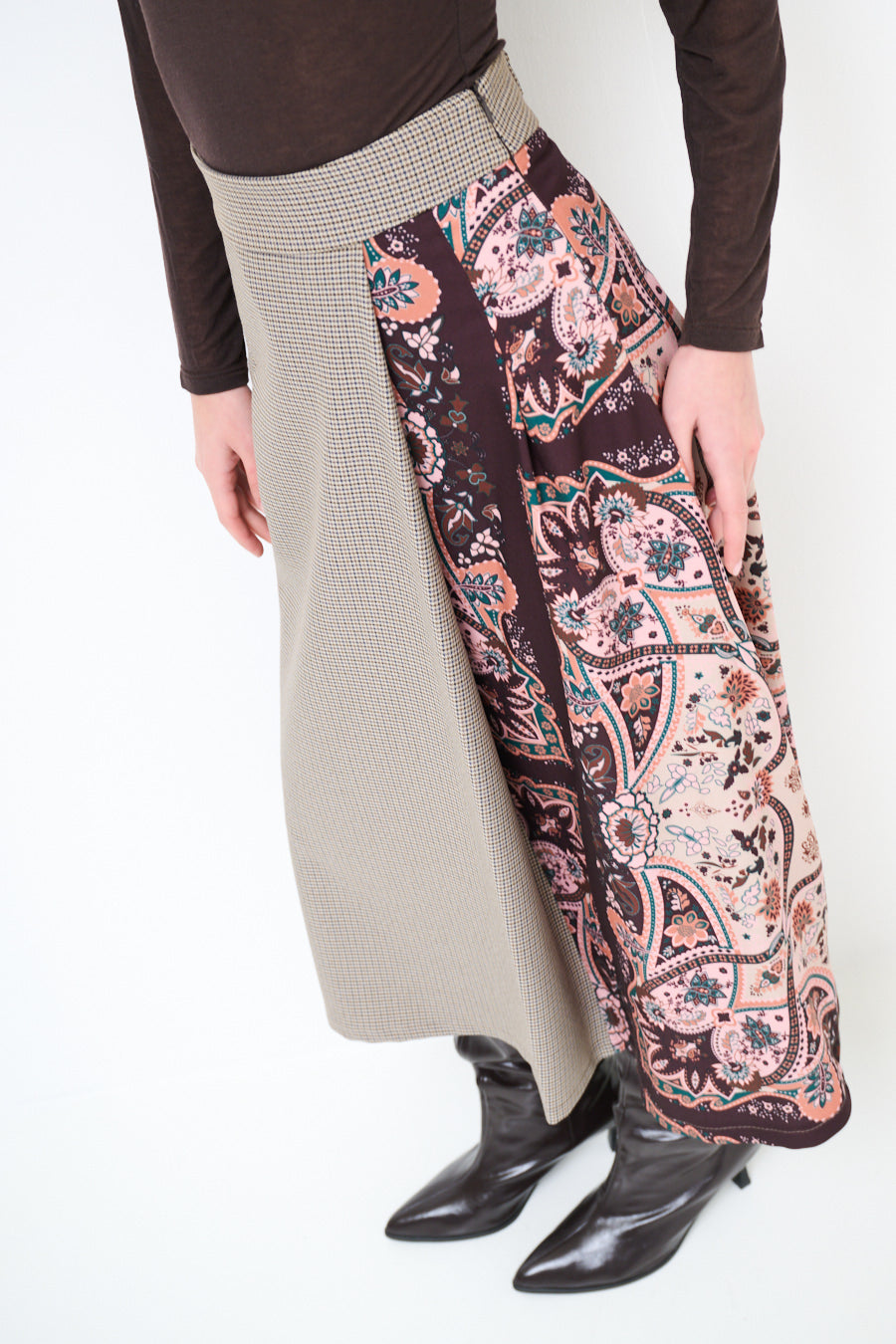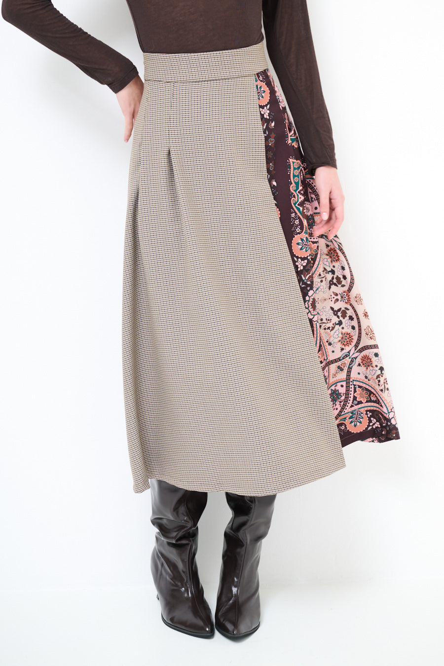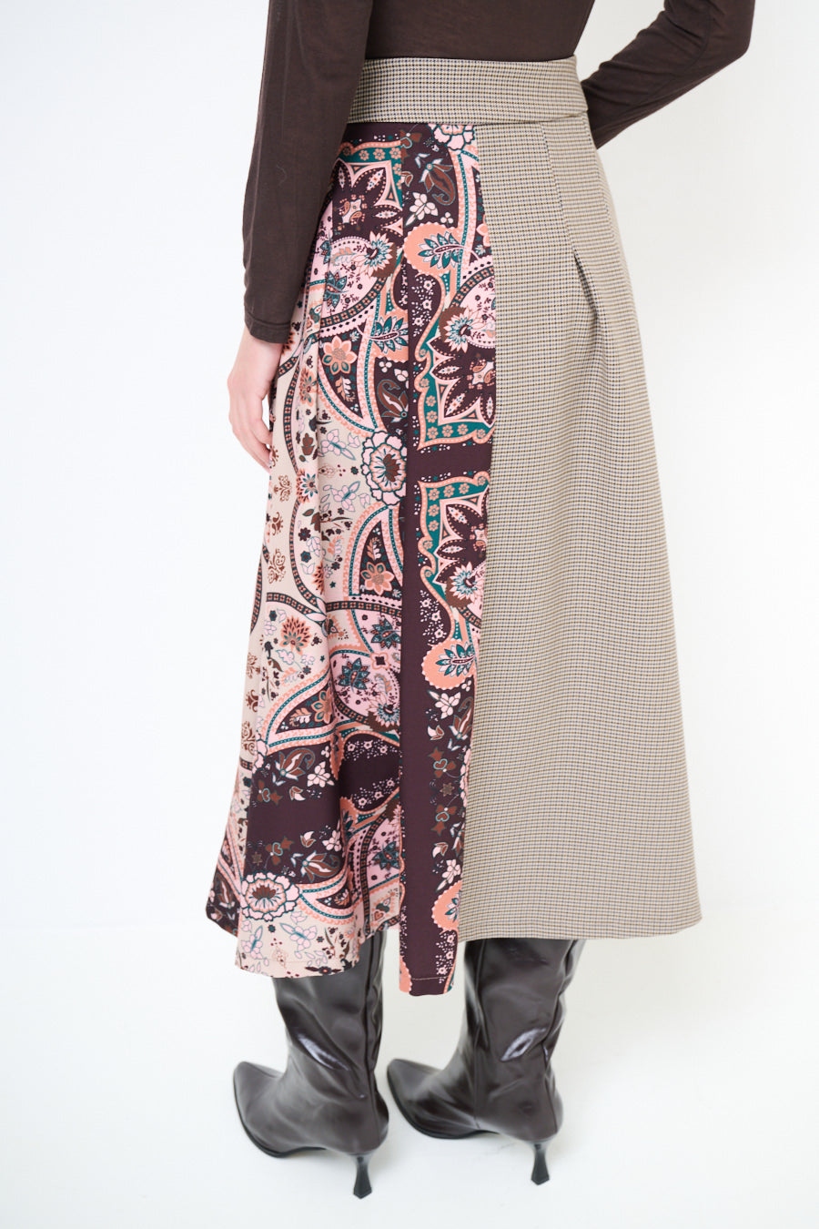 تنورة متوسطة الطول ذات تأثير ملتف ومرقعات مربعات وزهرية مع تفاصيل لوحة انسيابية بالجملة