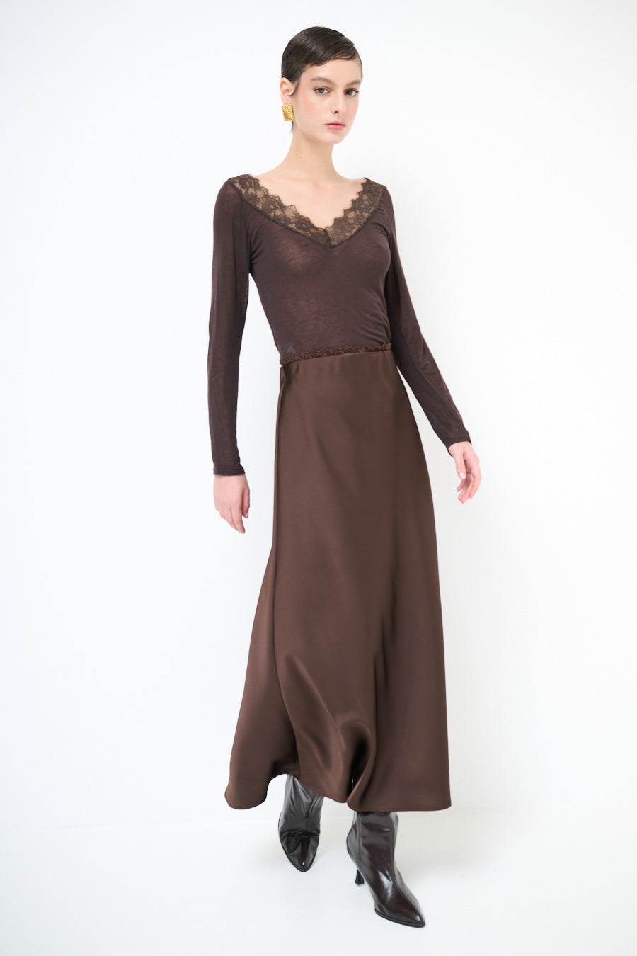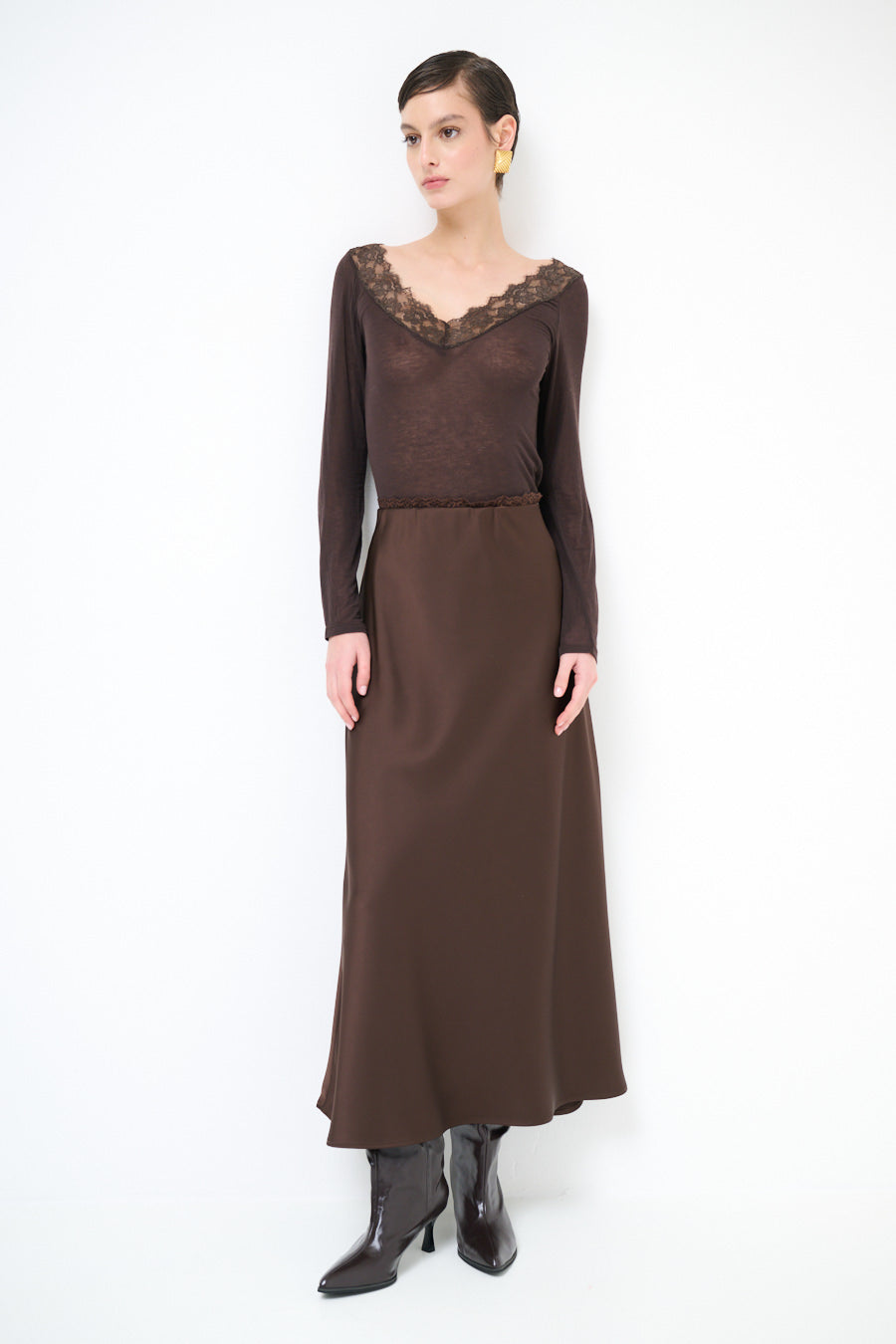 - تضيف تفاصيل خط العنق الدقيقة بنية راقية إلى الجزء العلوي من الصدرية