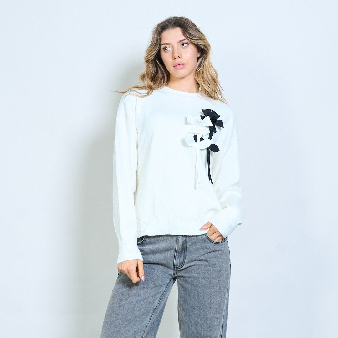 - سترة برقبة دائرية مزينة بفيونكة كبيرة الحجم بألوان متباينة