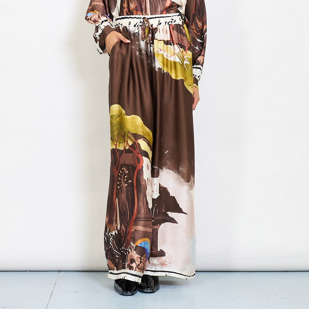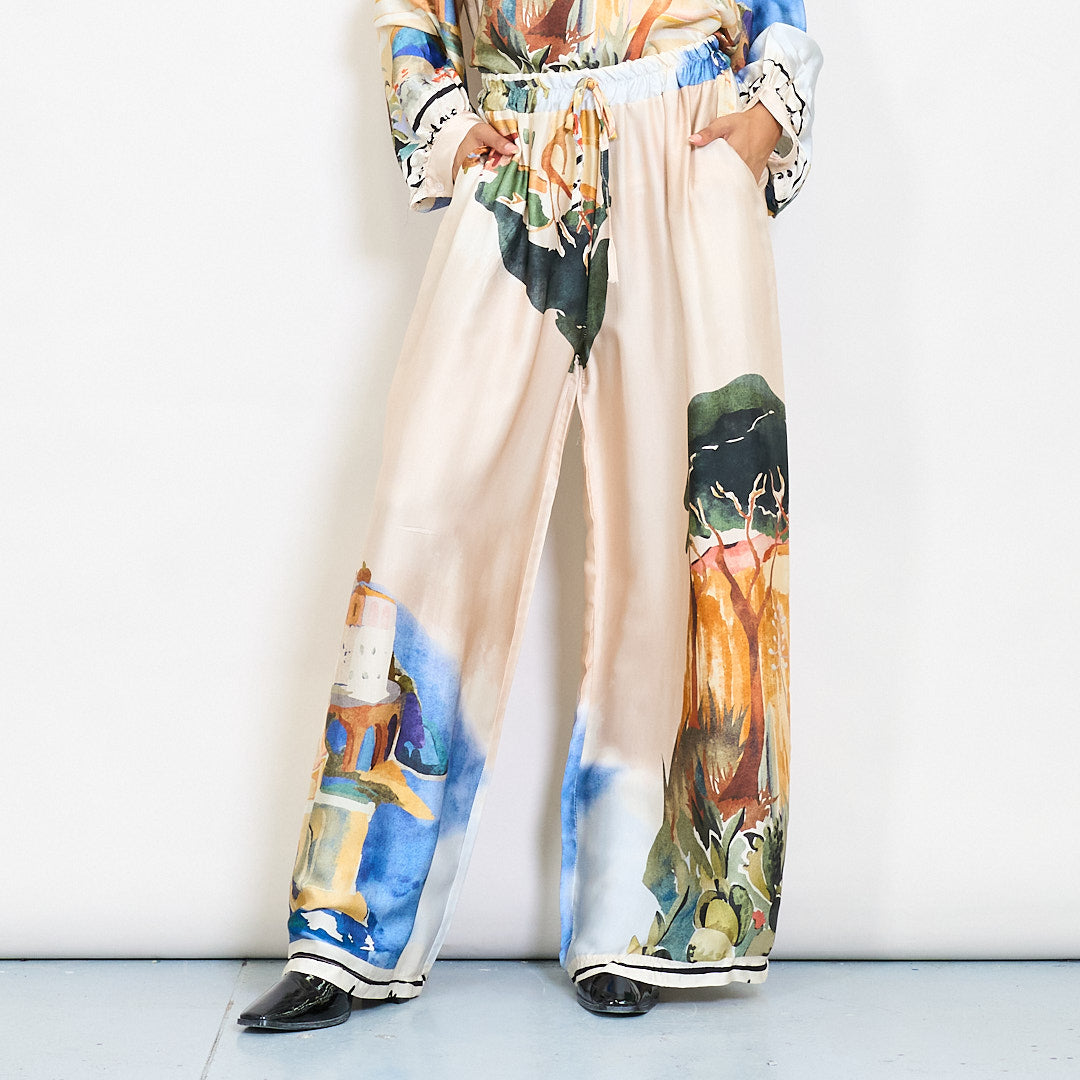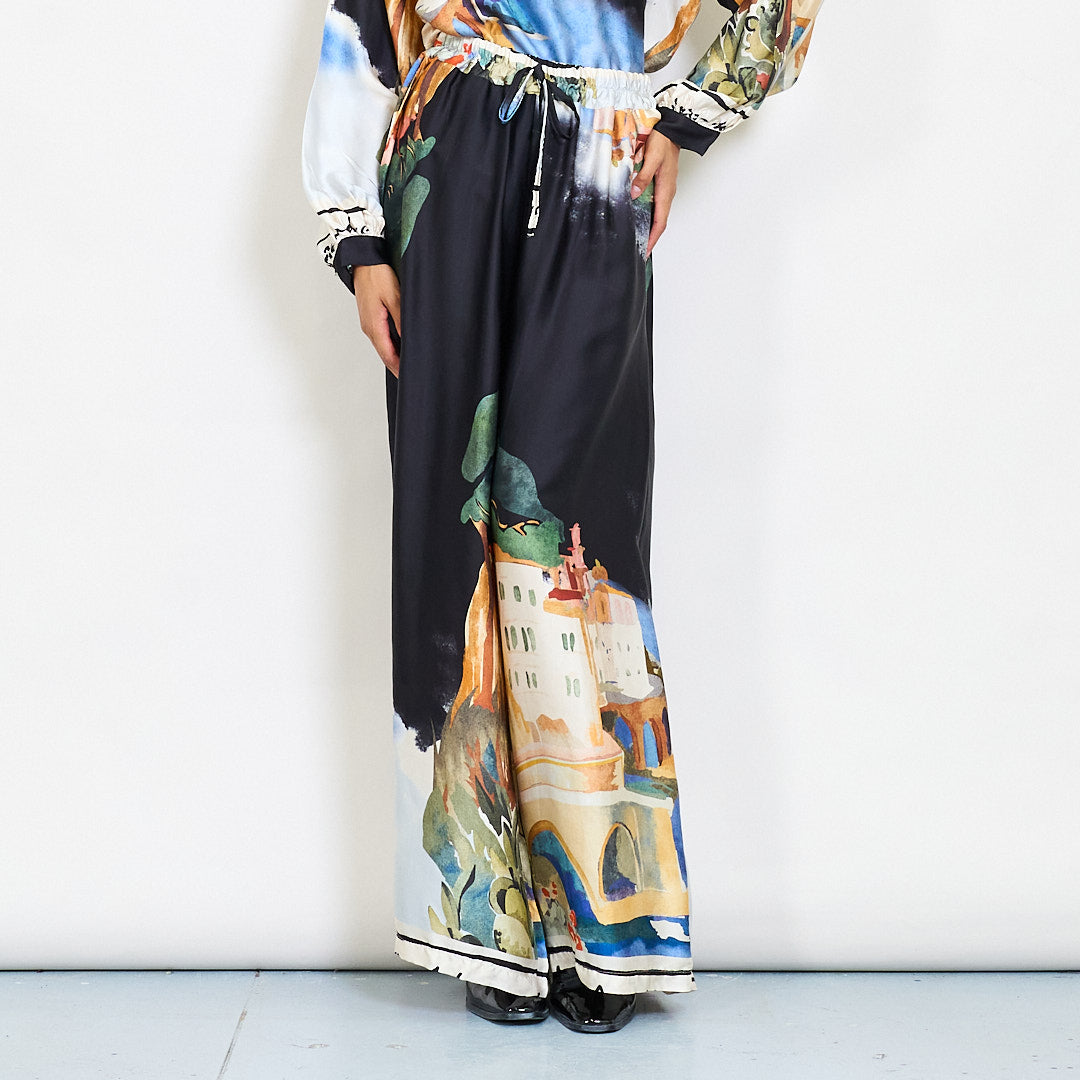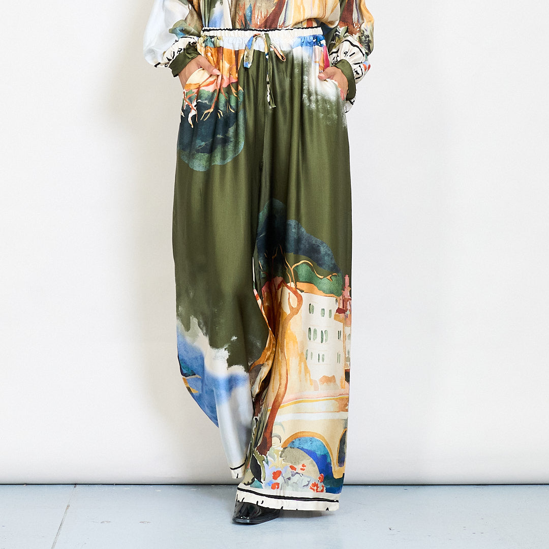 - سراويل واسعة الساق تتدفق تتميز بطباعة مشهد مائي نابض بالحياة