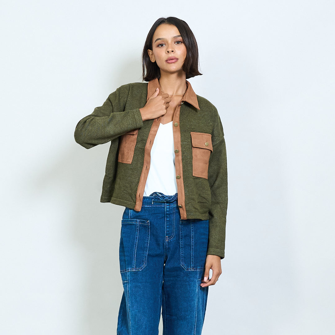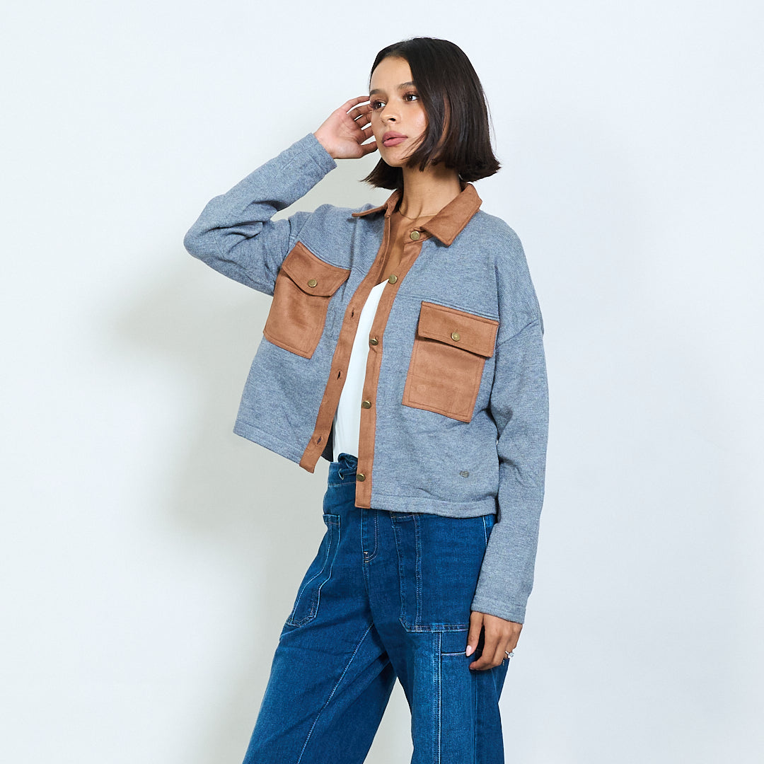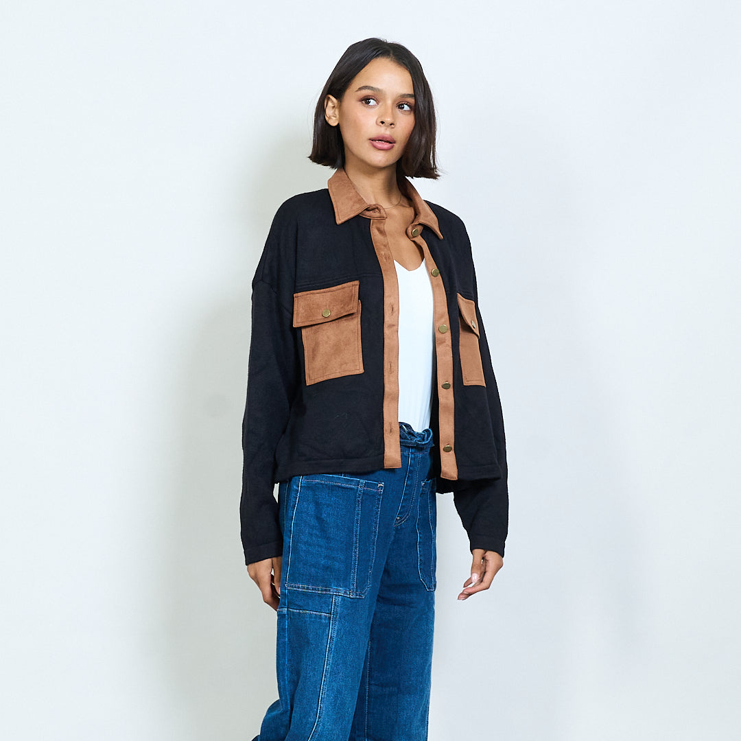 Knitted shirt jacket with contrast suede collar and pockets wholesale