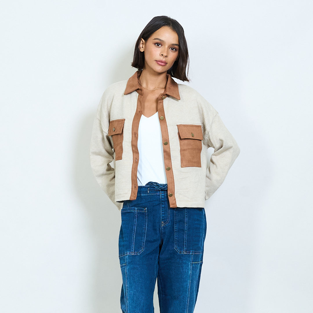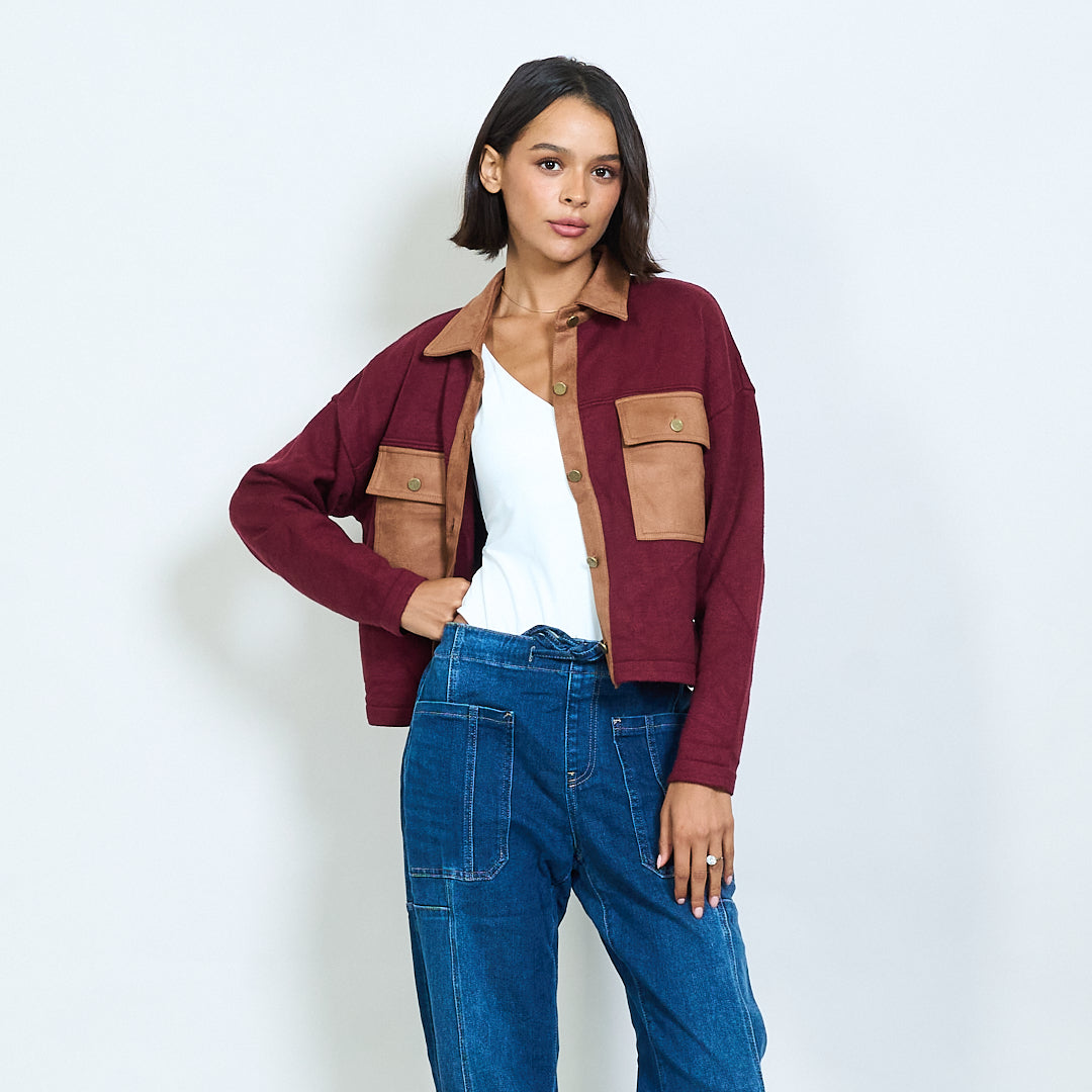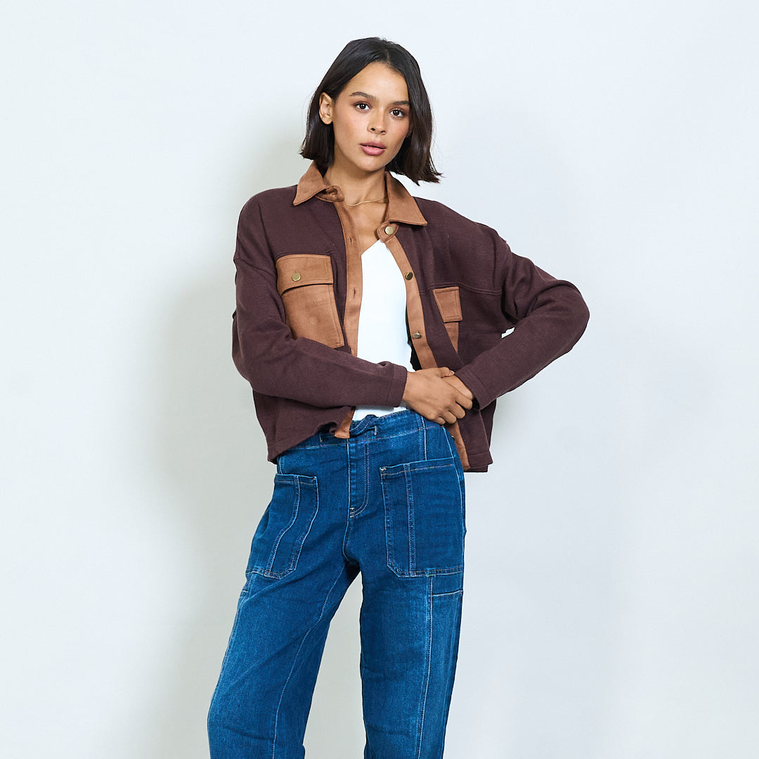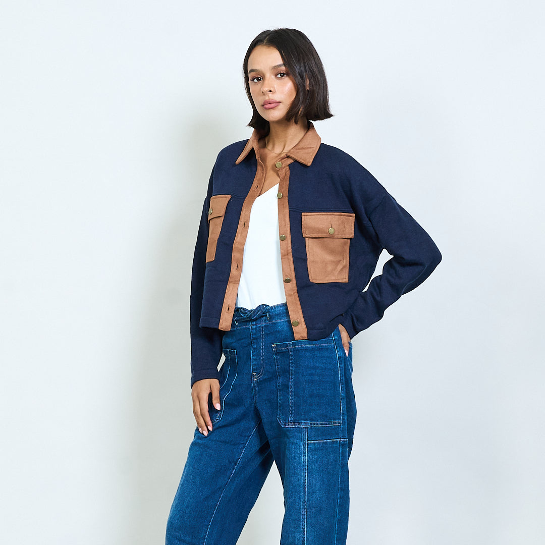 Knitted shirt jacket with contrast suede collar and pockets wholesale