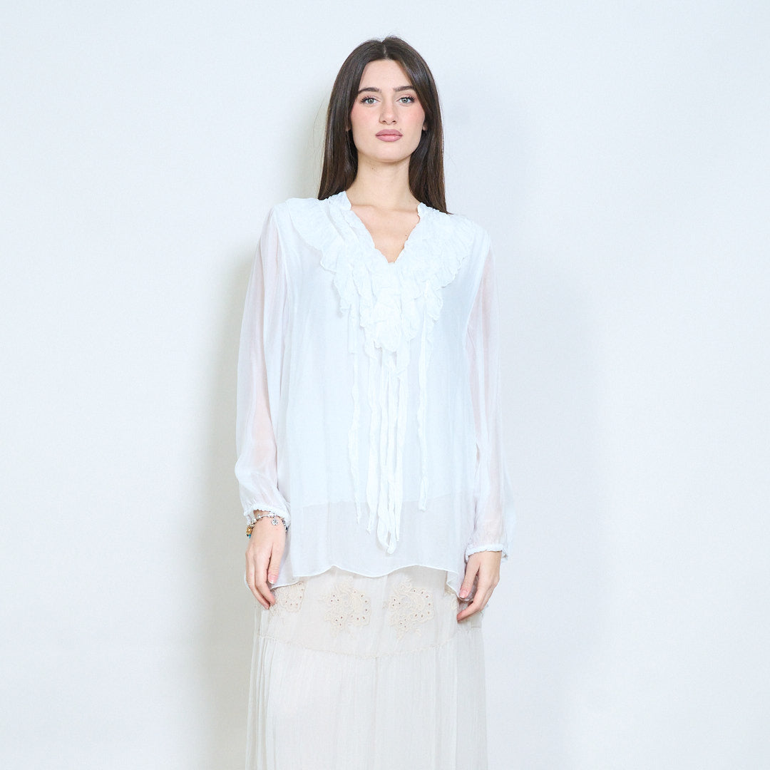 - تفاصيل مكشكشة على طول خط الرقبة تضيف طابعًا رومانسيًا