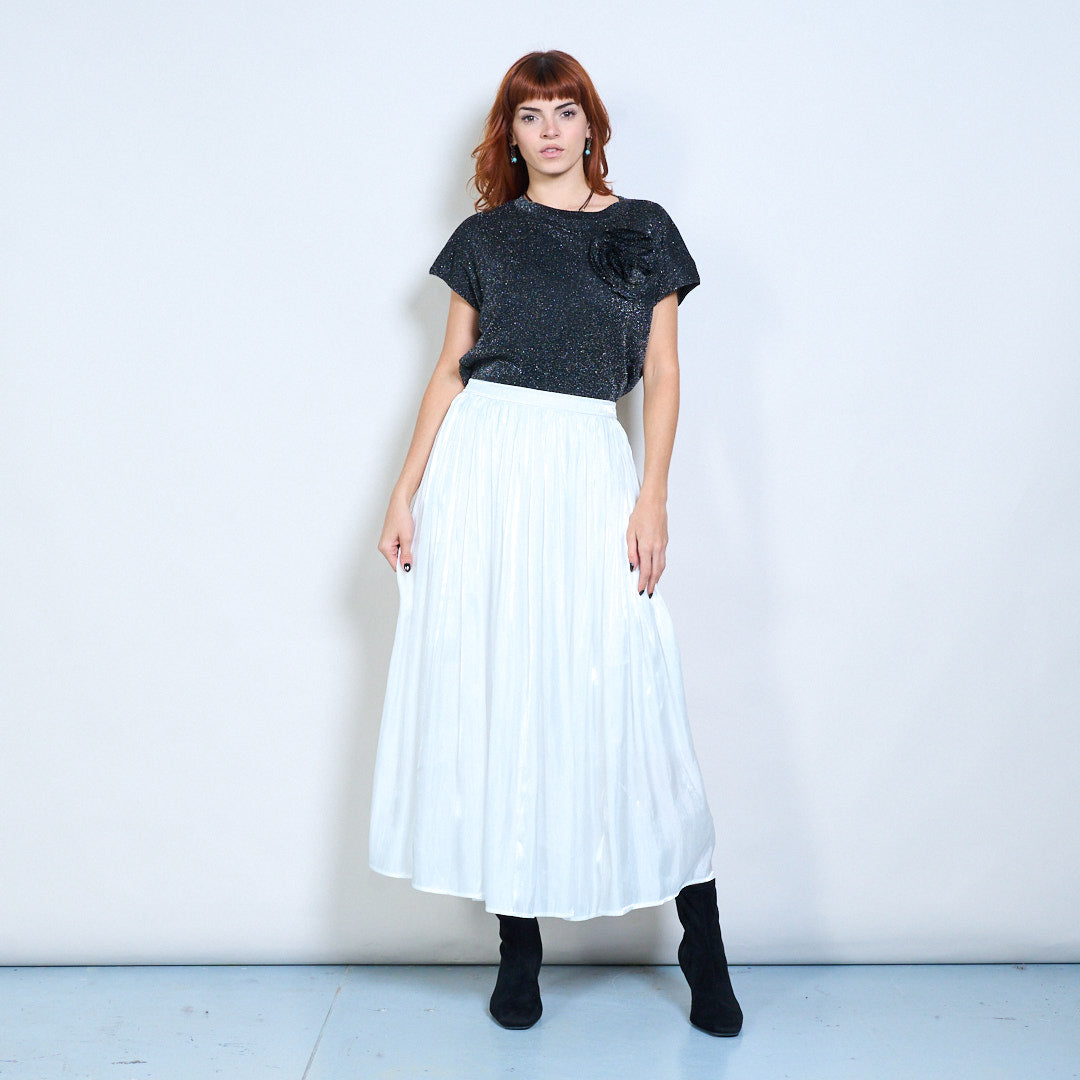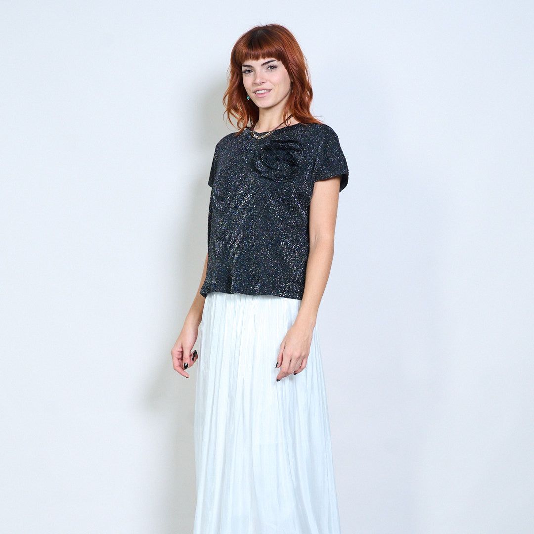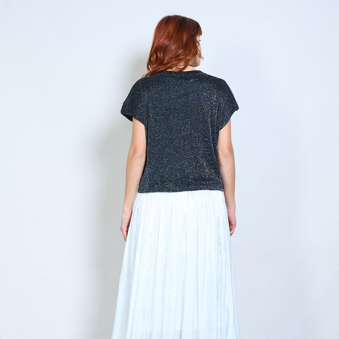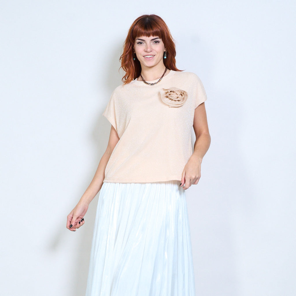 - بلوزة أنيقة بأكمام قصيرة مع لمسة نهائية لامعة رقيقة للحصول على لمسة راقية