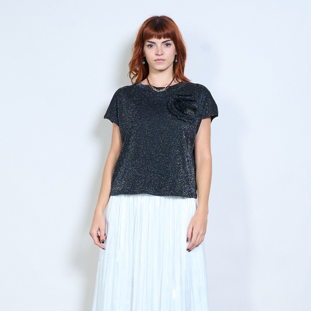 بلوزة بأكمام قصيرة لامعة ومزينة بالزهور للبيع بالجملة