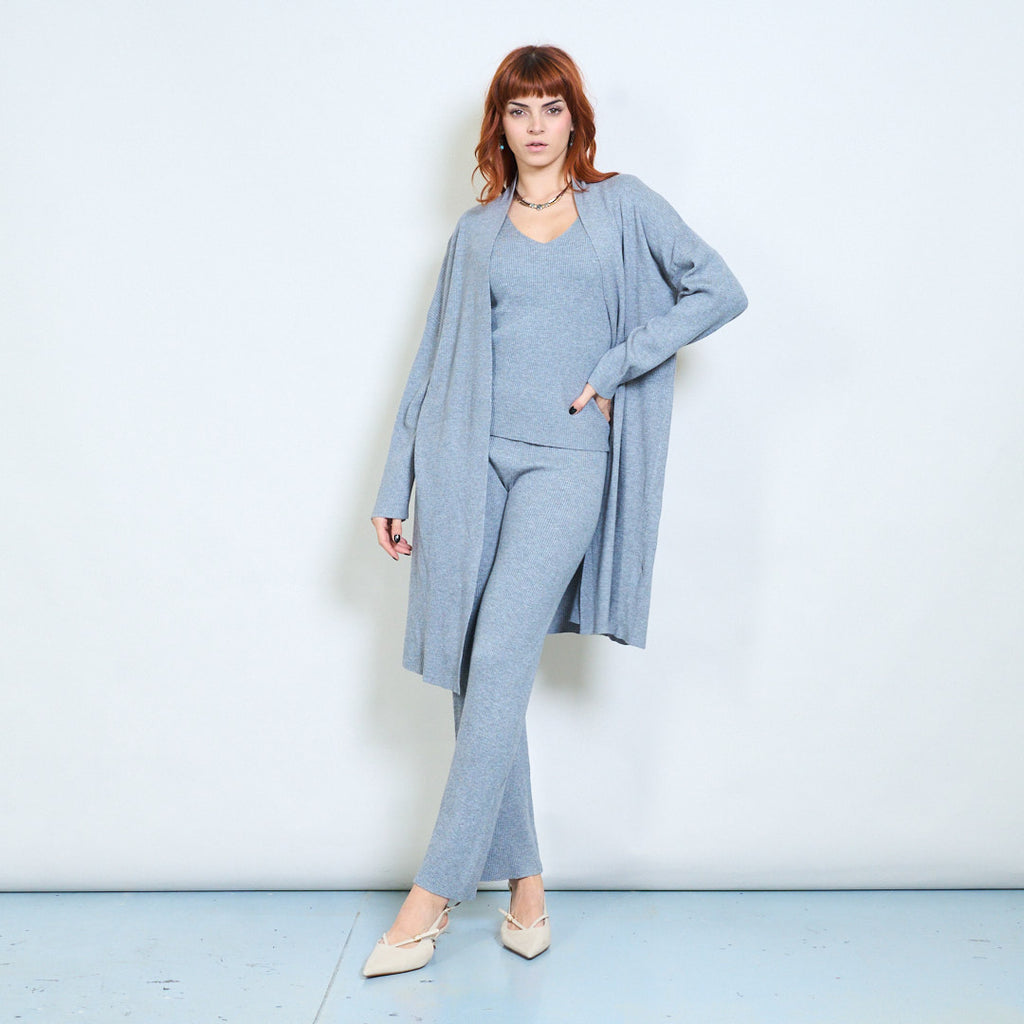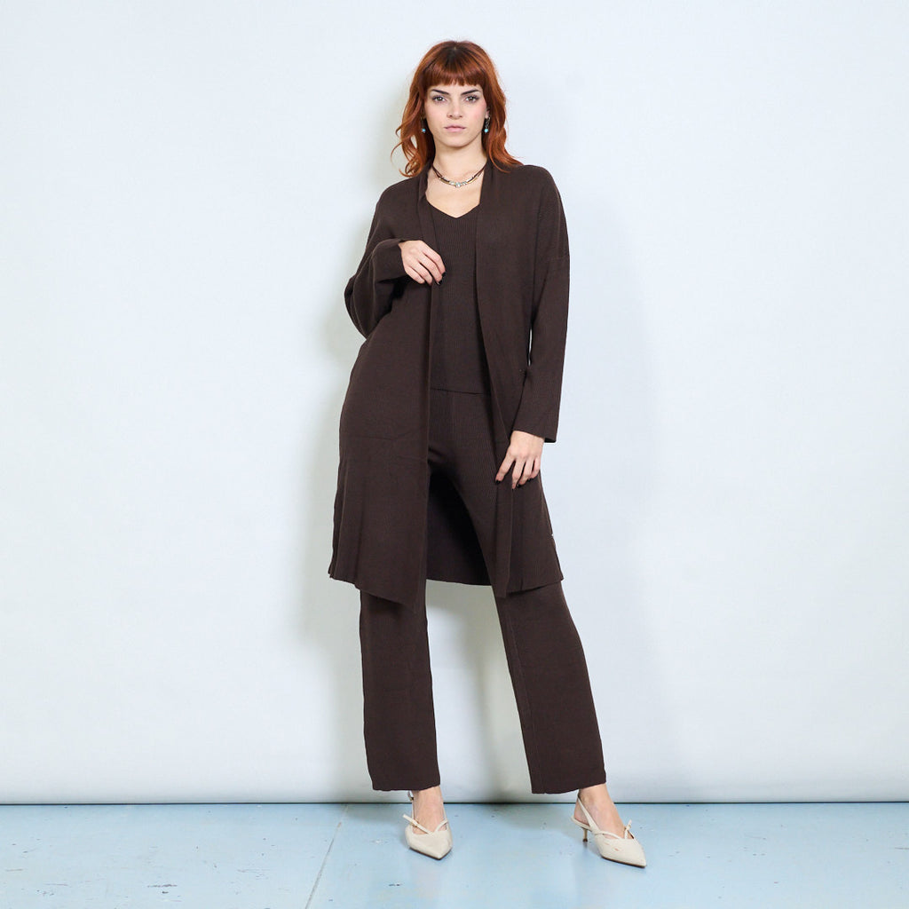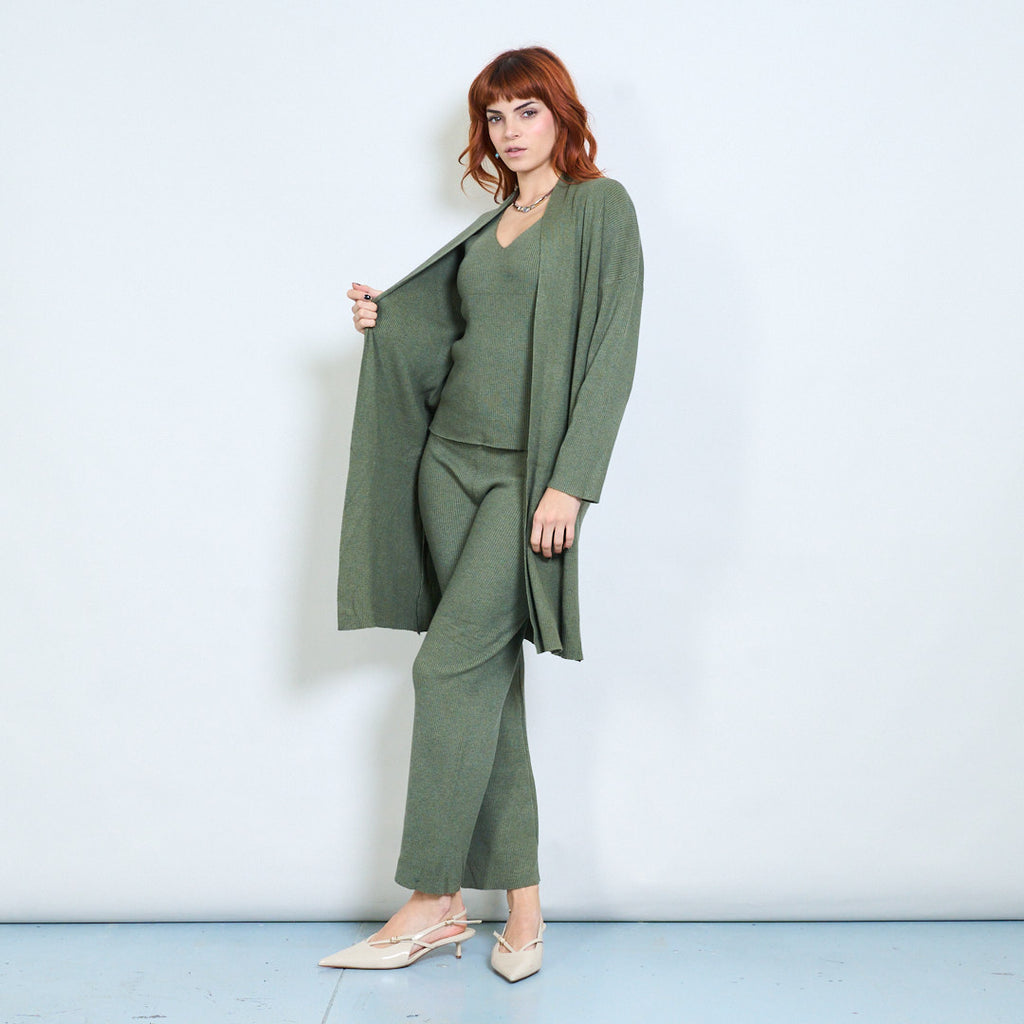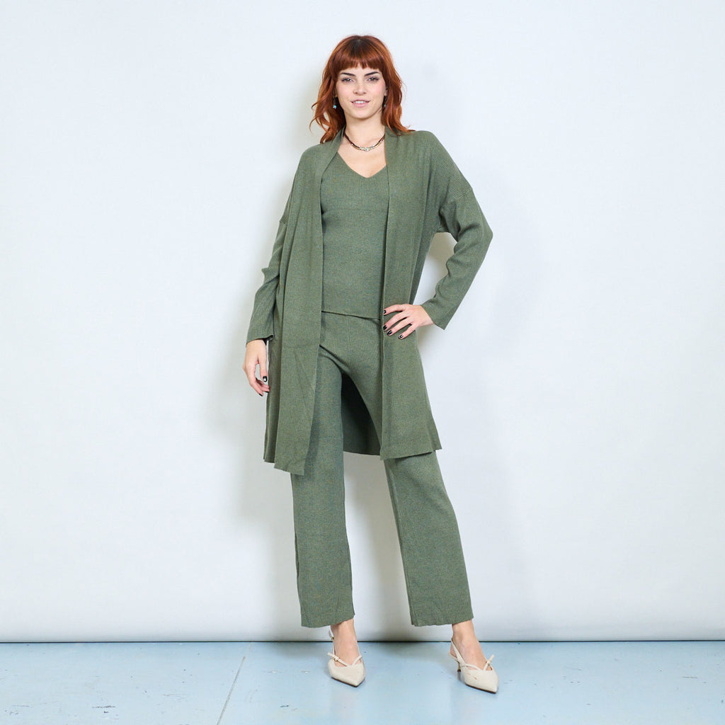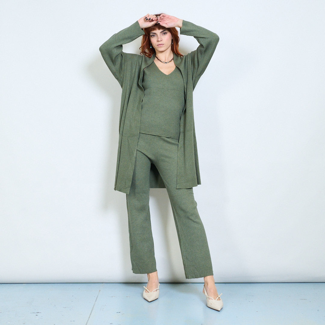 - طقم من ثلاث قطع متماسكة ومضلعة، يتميز بسترة صوفية، وبلوزة برقبة على شكل حرف V، وبنطلون بأرجل واسعة