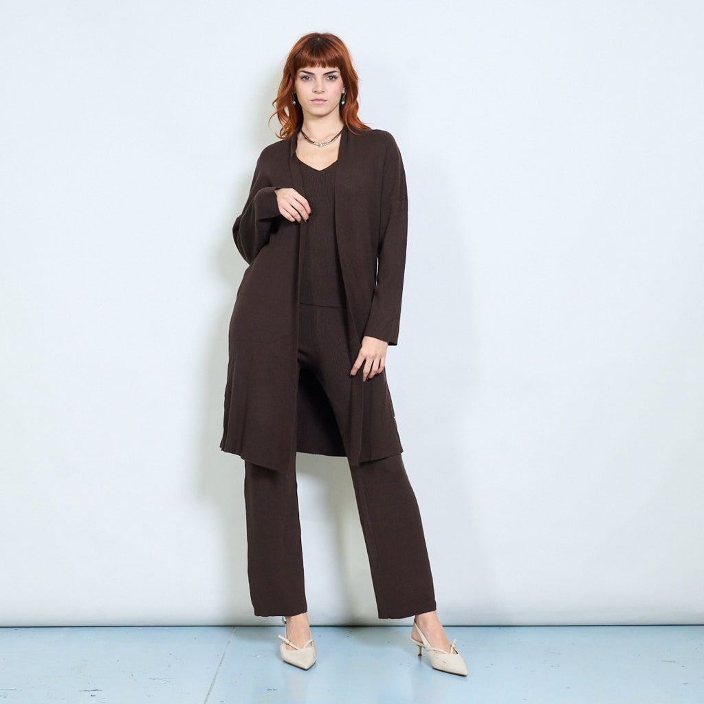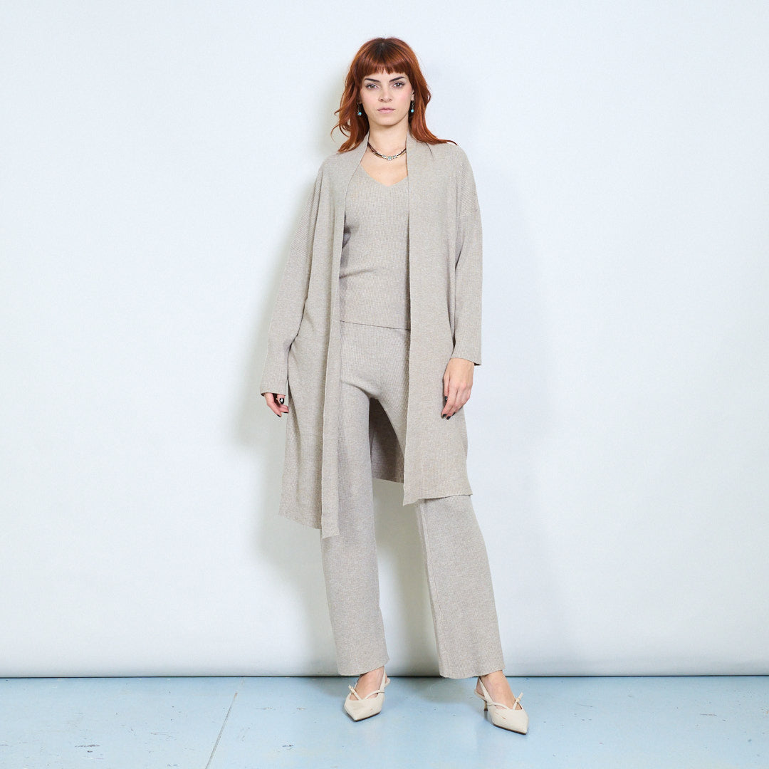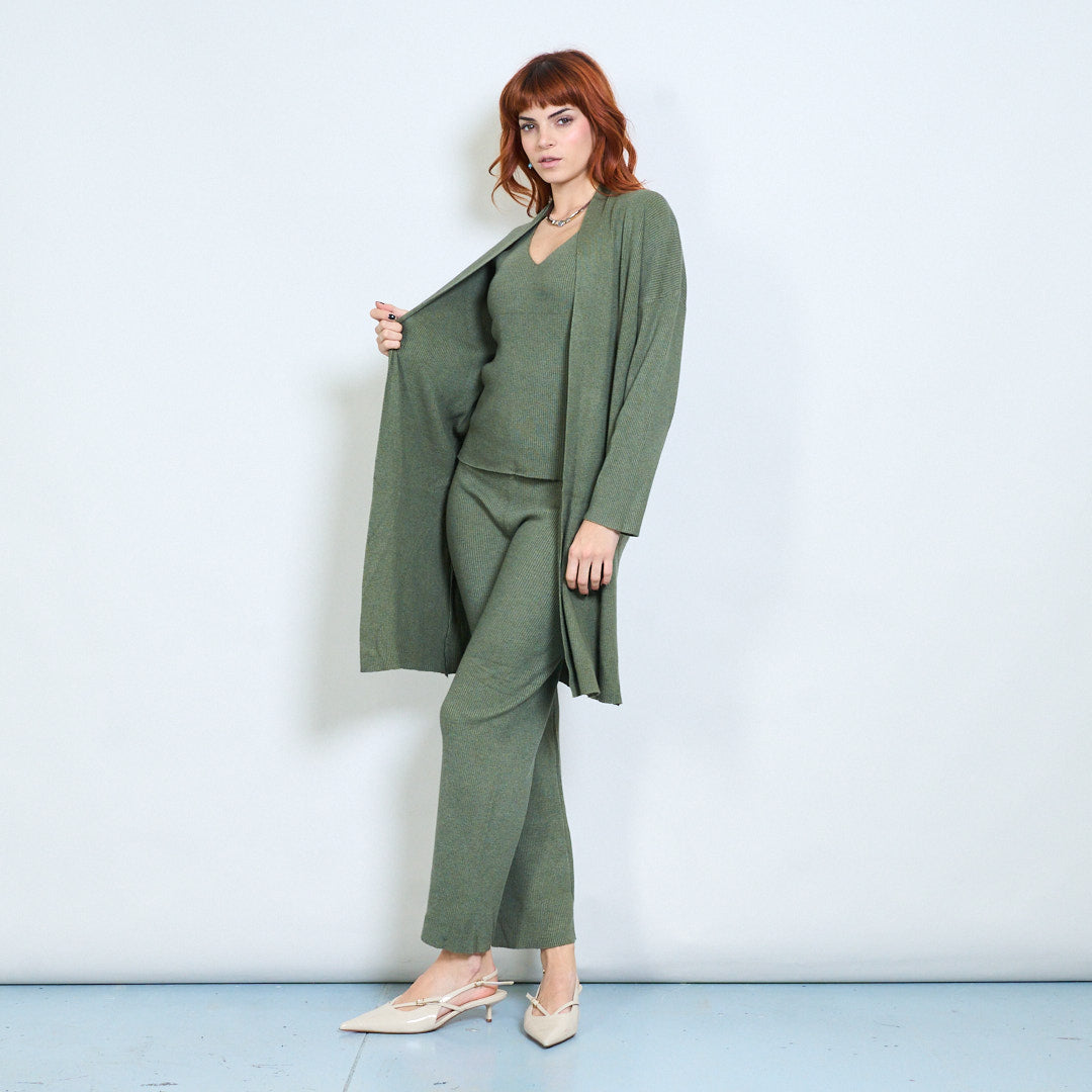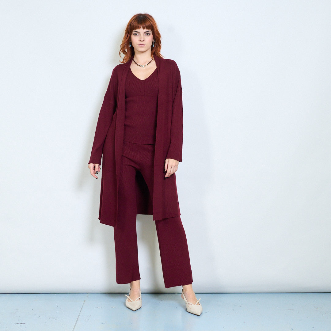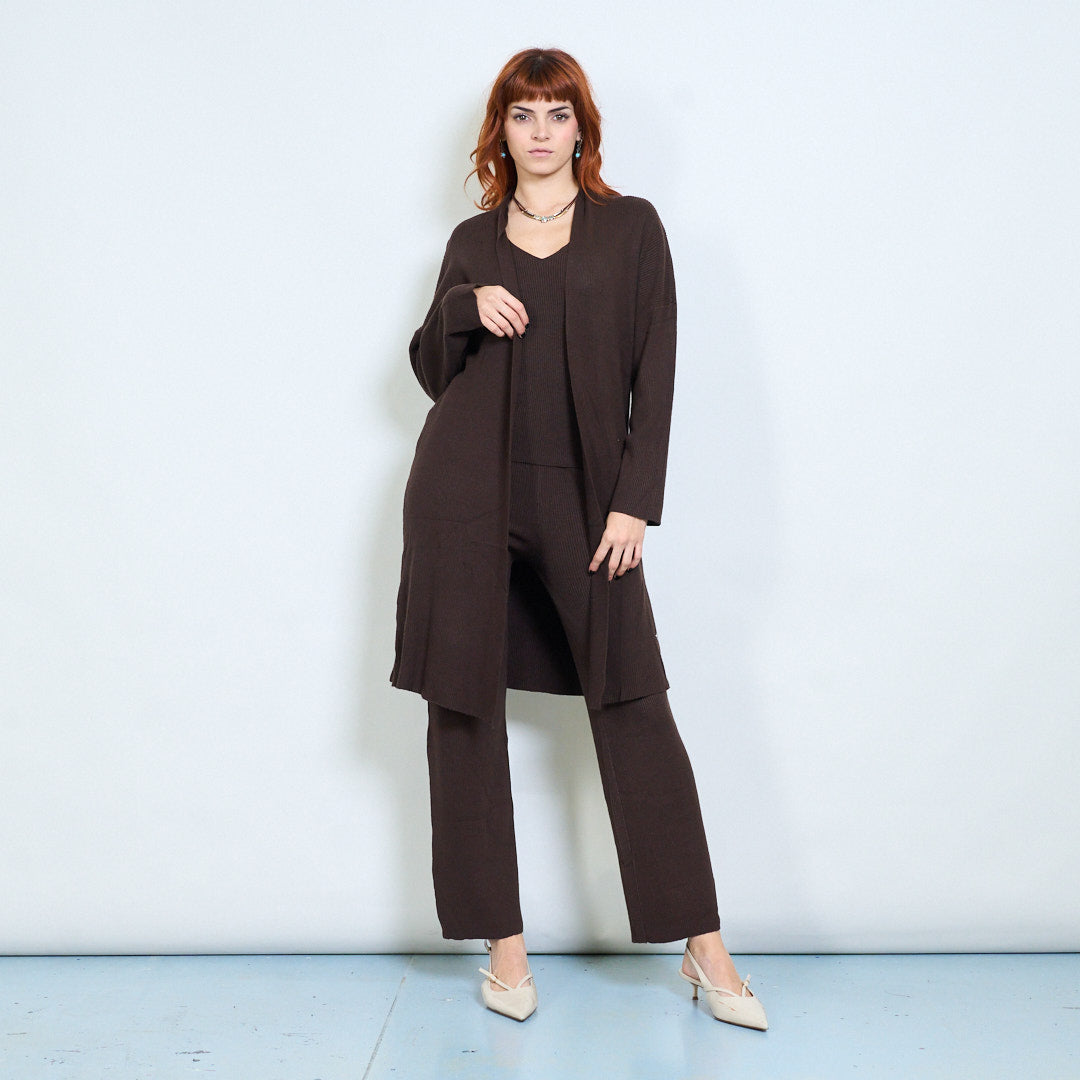 - طقم من ثلاث قطع متماسكة ومضلعة، يتميز بسترة صوفية، وبلوزة برقبة على شكل حرف V، وبنطلون بأرجل واسعة