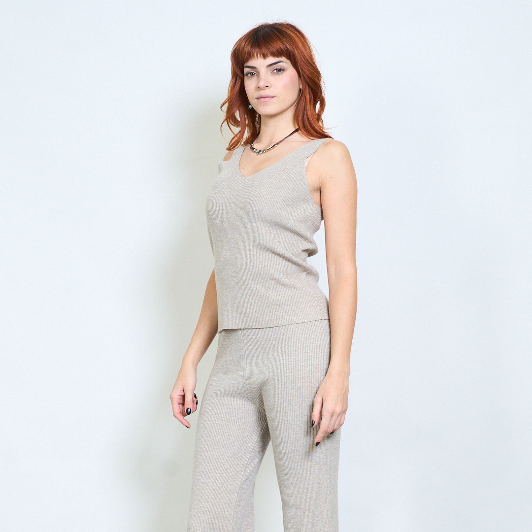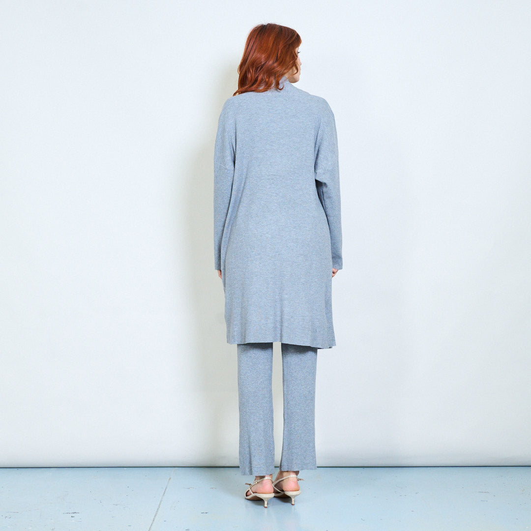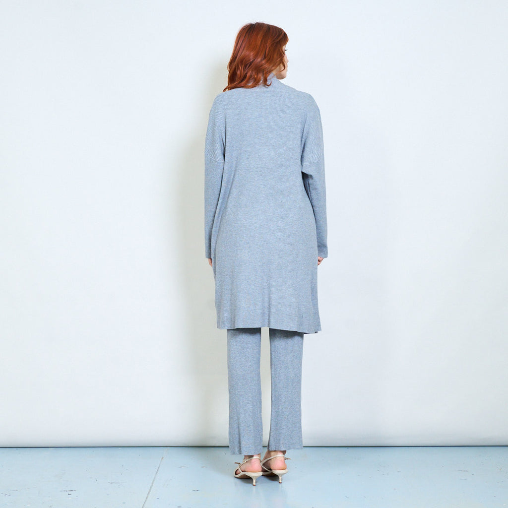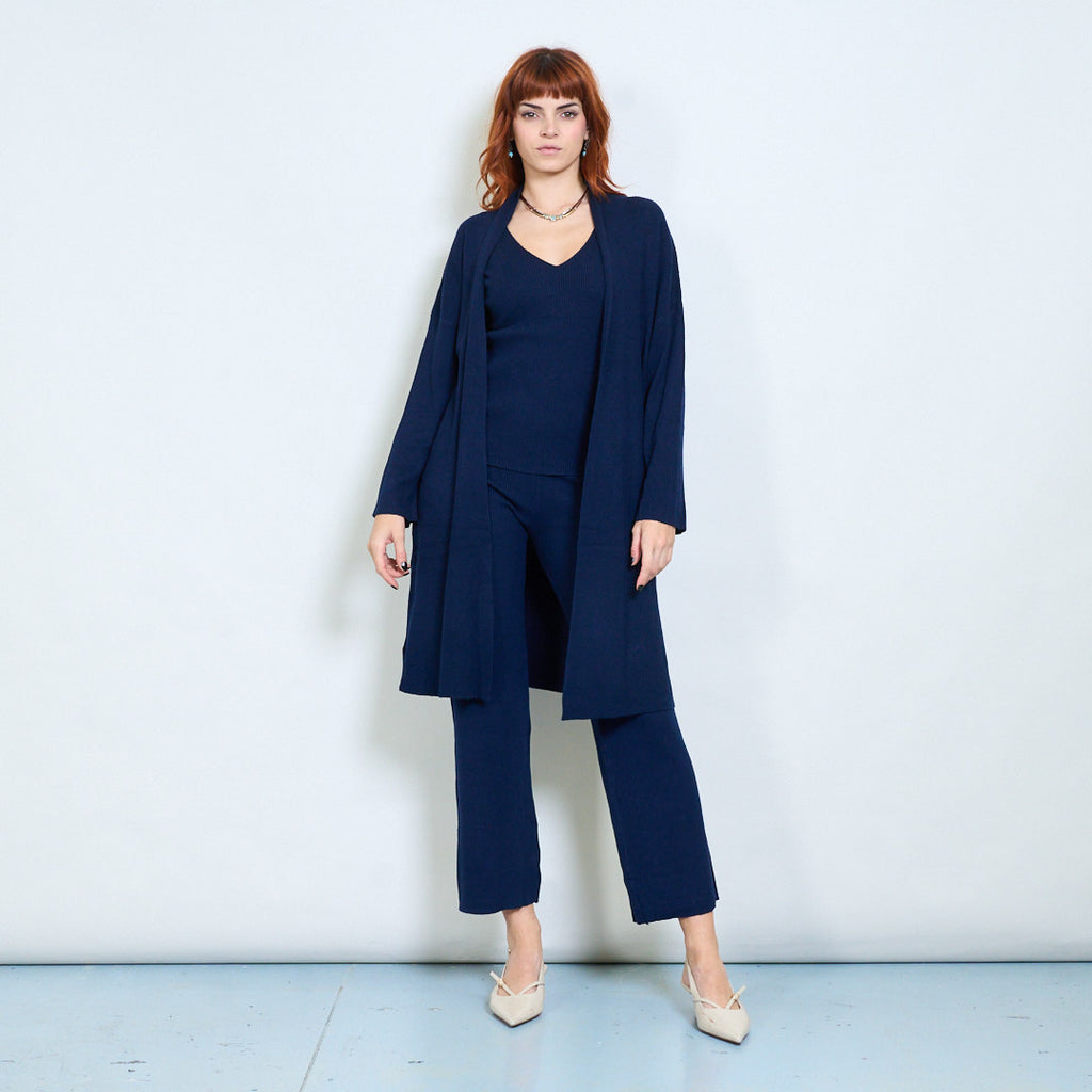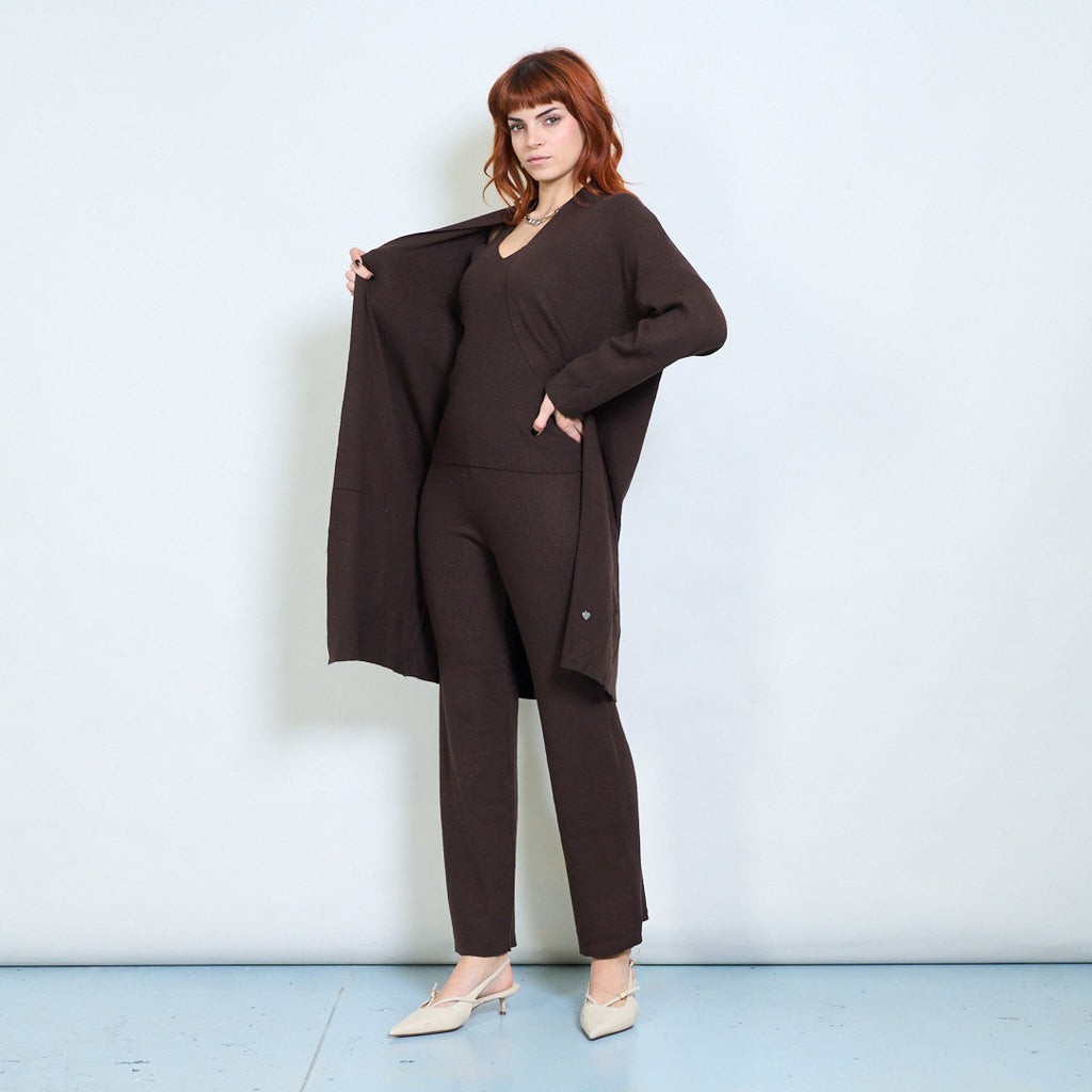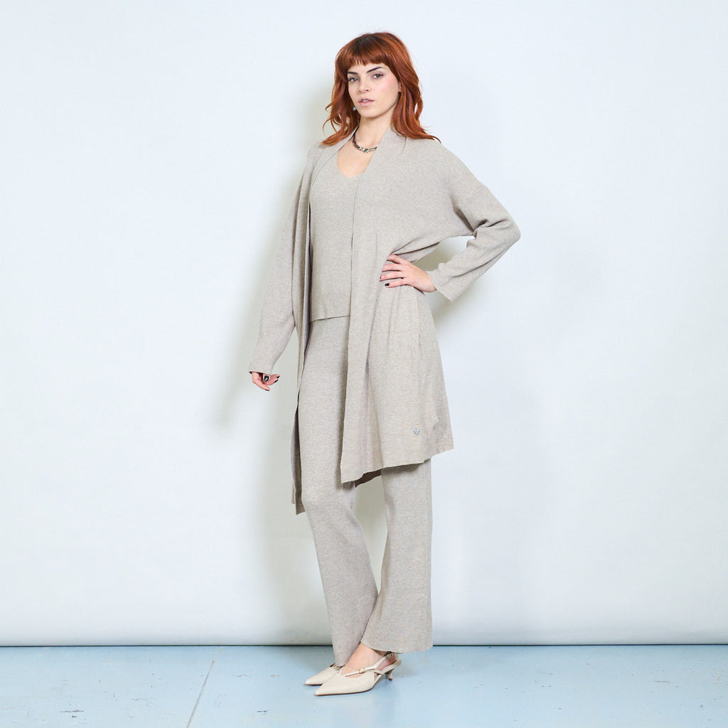 - طقم من ثلاث قطع متماسكة ومضلعة، يتميز بسترة صوفية، وبلوزة برقبة على شكل حرف V، وبنطلون بأرجل واسعة