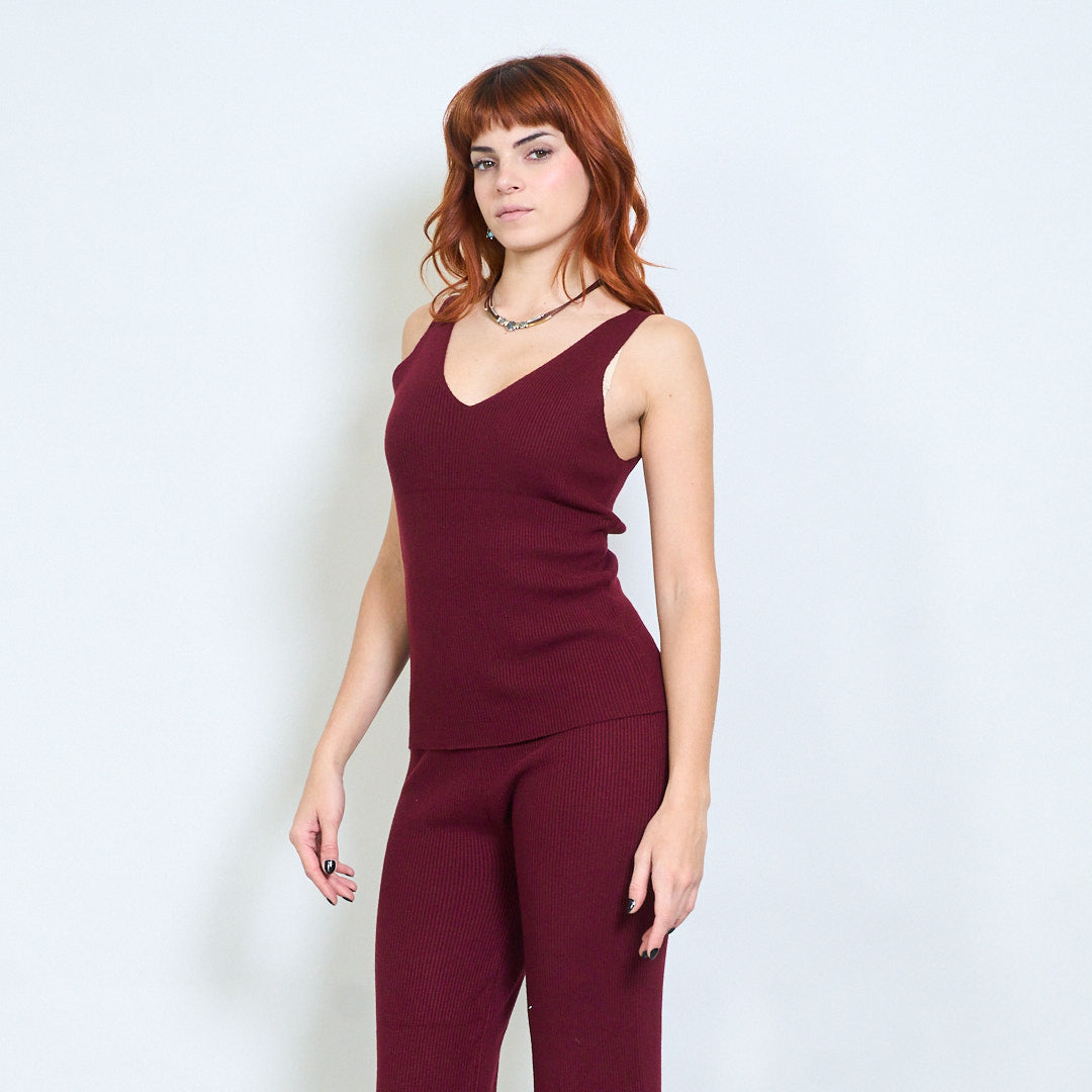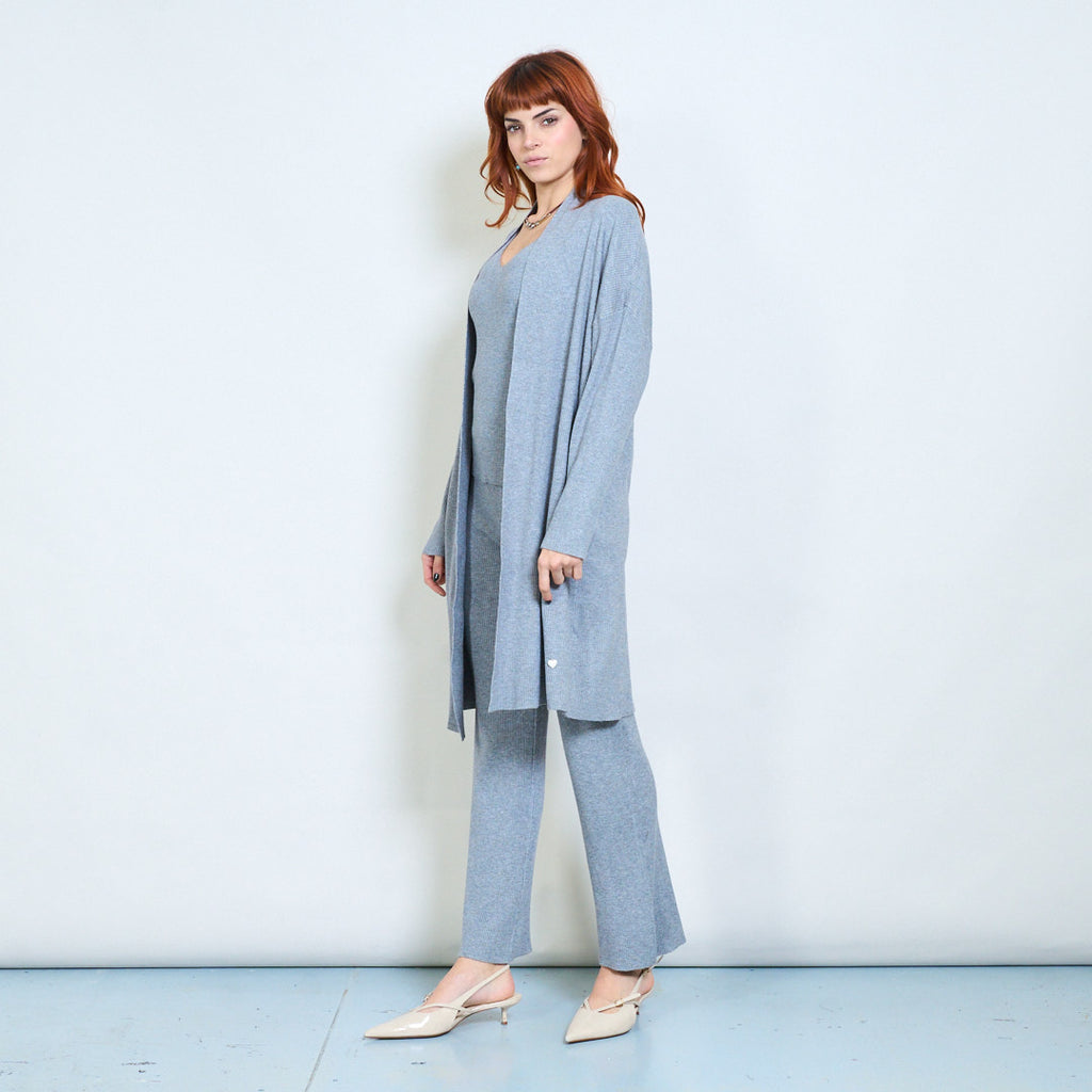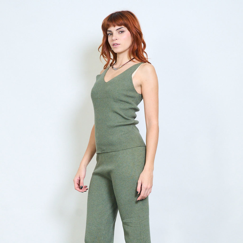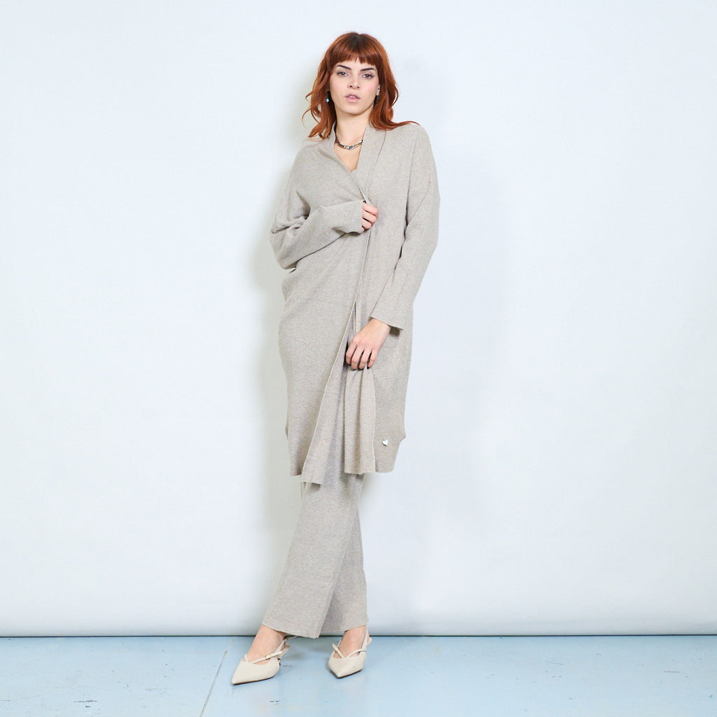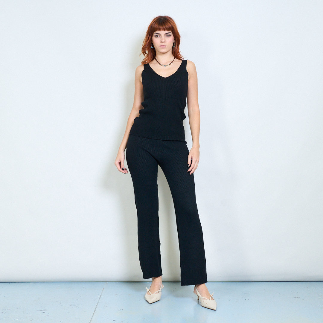 - طقم من ثلاث قطع متماسكة ومضلعة، يتميز بسترة صوفية، وبلوزة برقبة على شكل حرف V، وبنطلون بأرجل واسعة