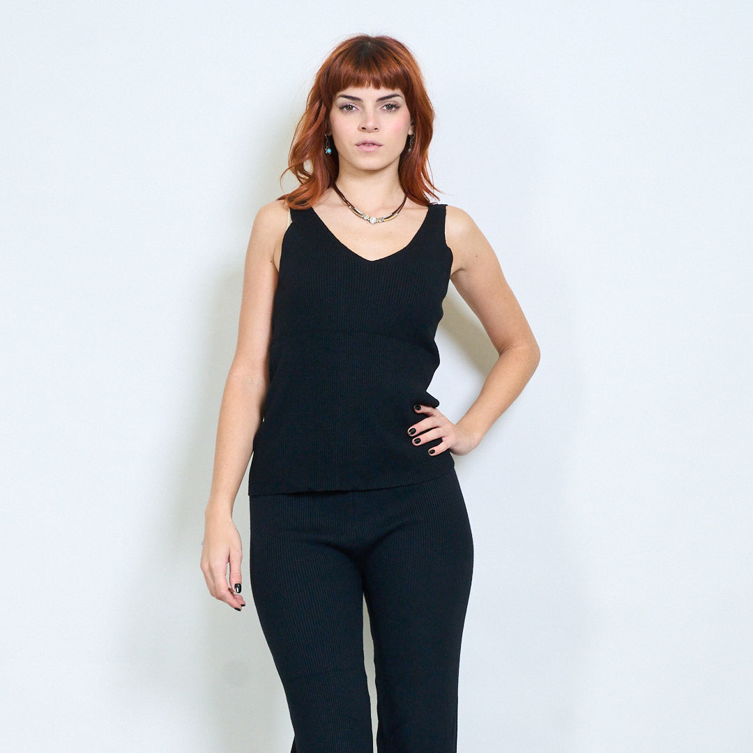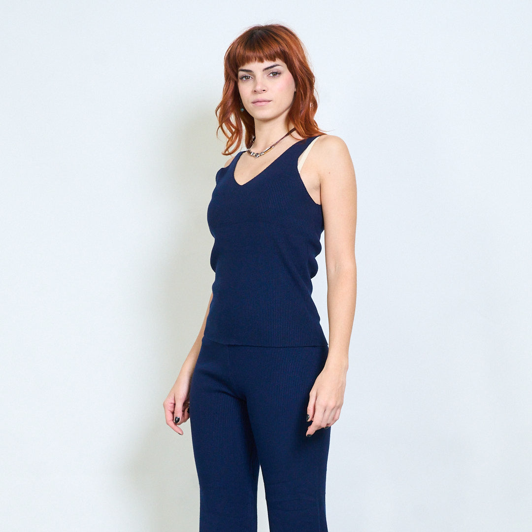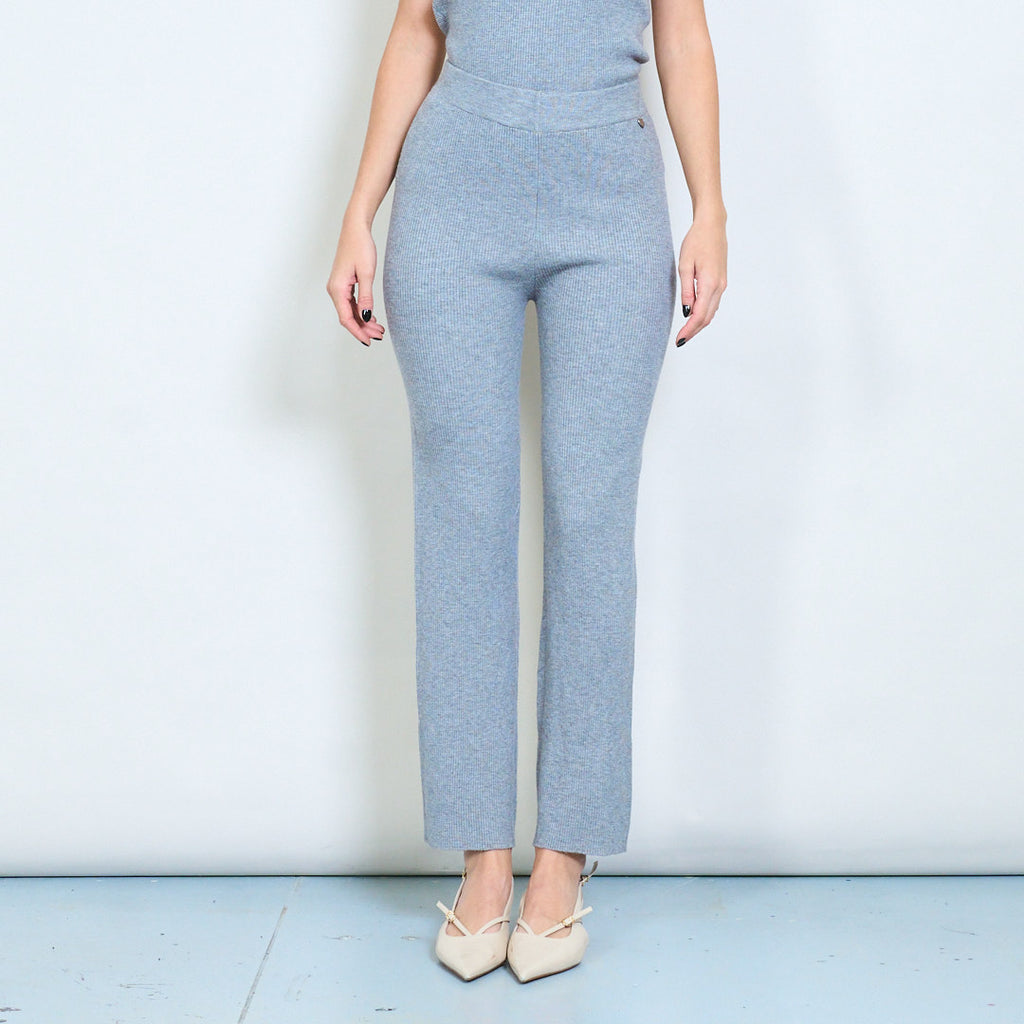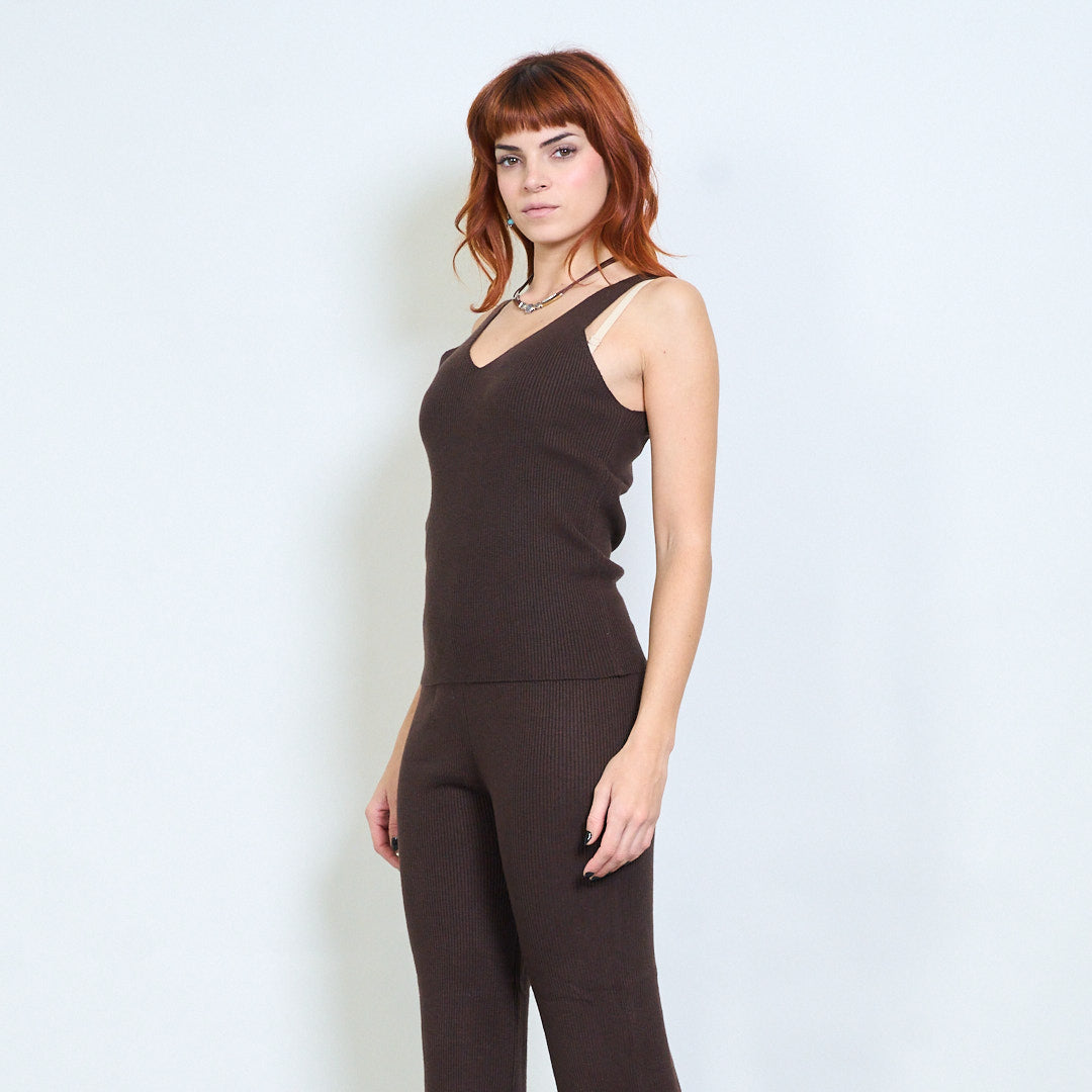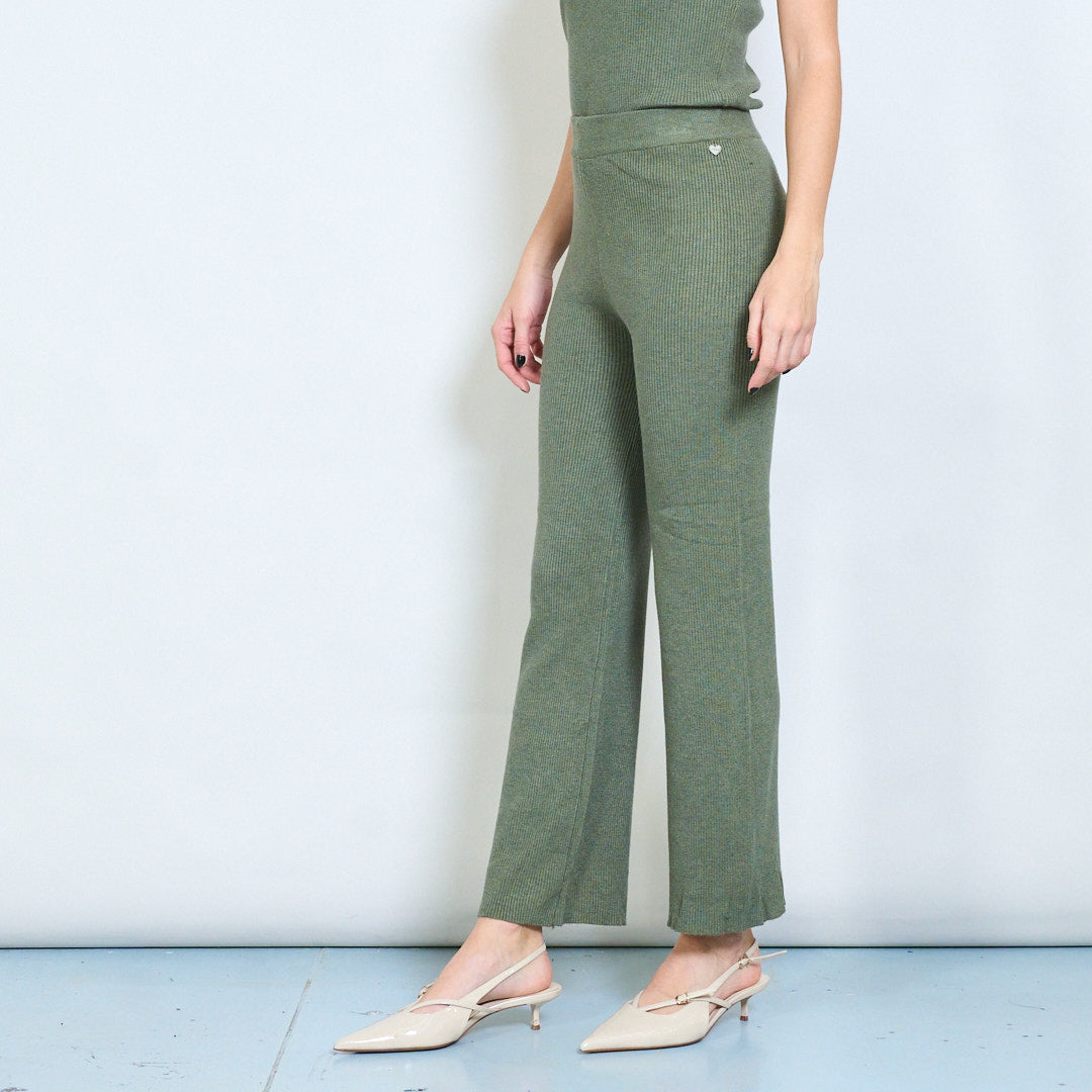 - طقم من ثلاث قطع متماسكة ومضلعة، يتميز بسترة صوفية، وبلوزة برقبة على شكل حرف V، وبنطلون بأرجل واسعة