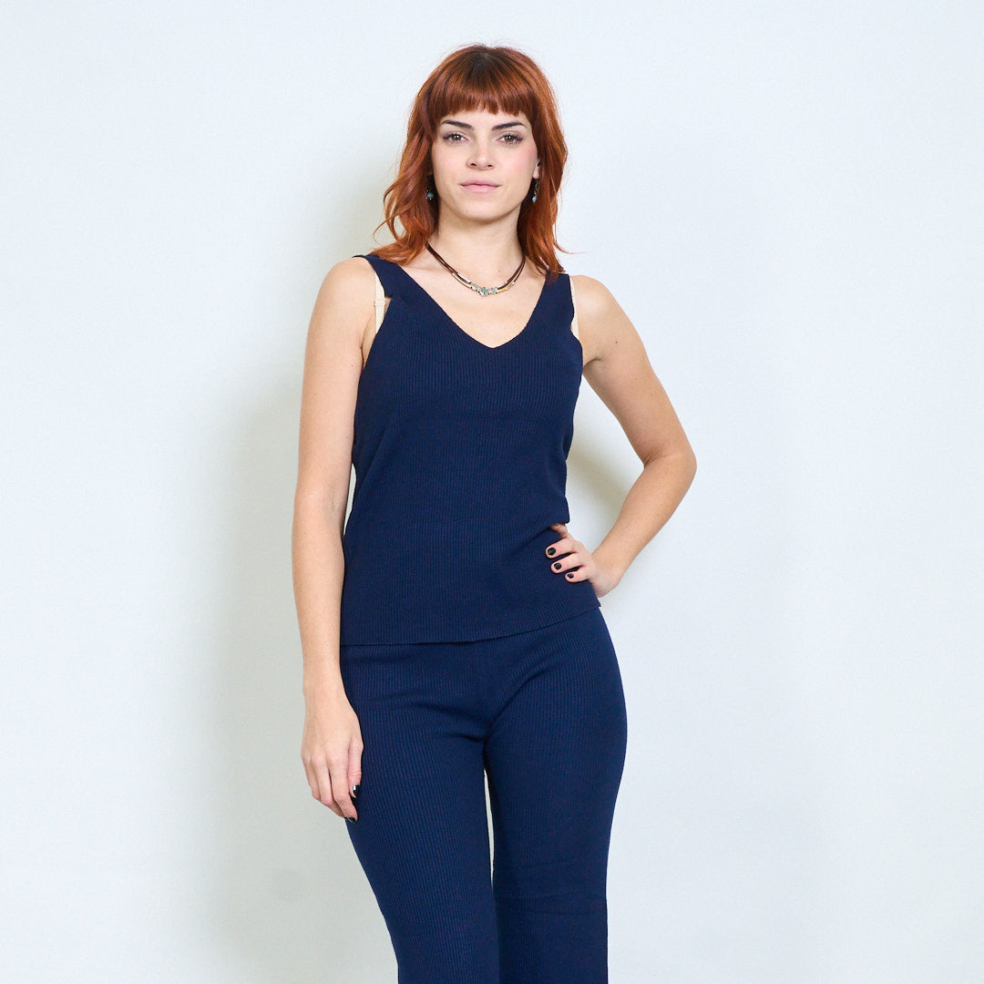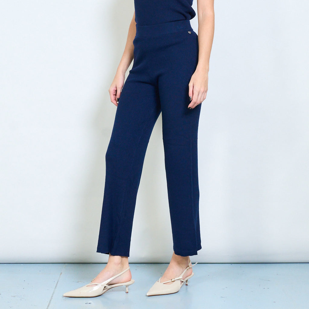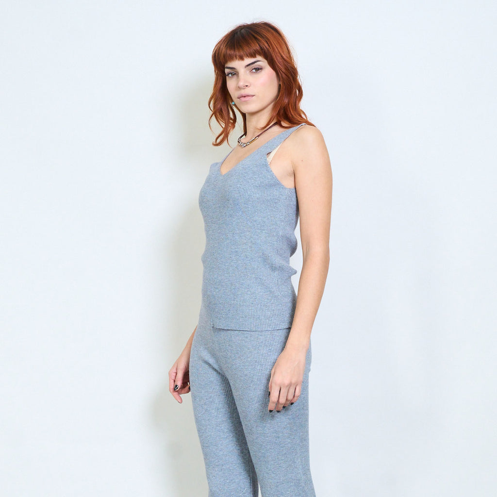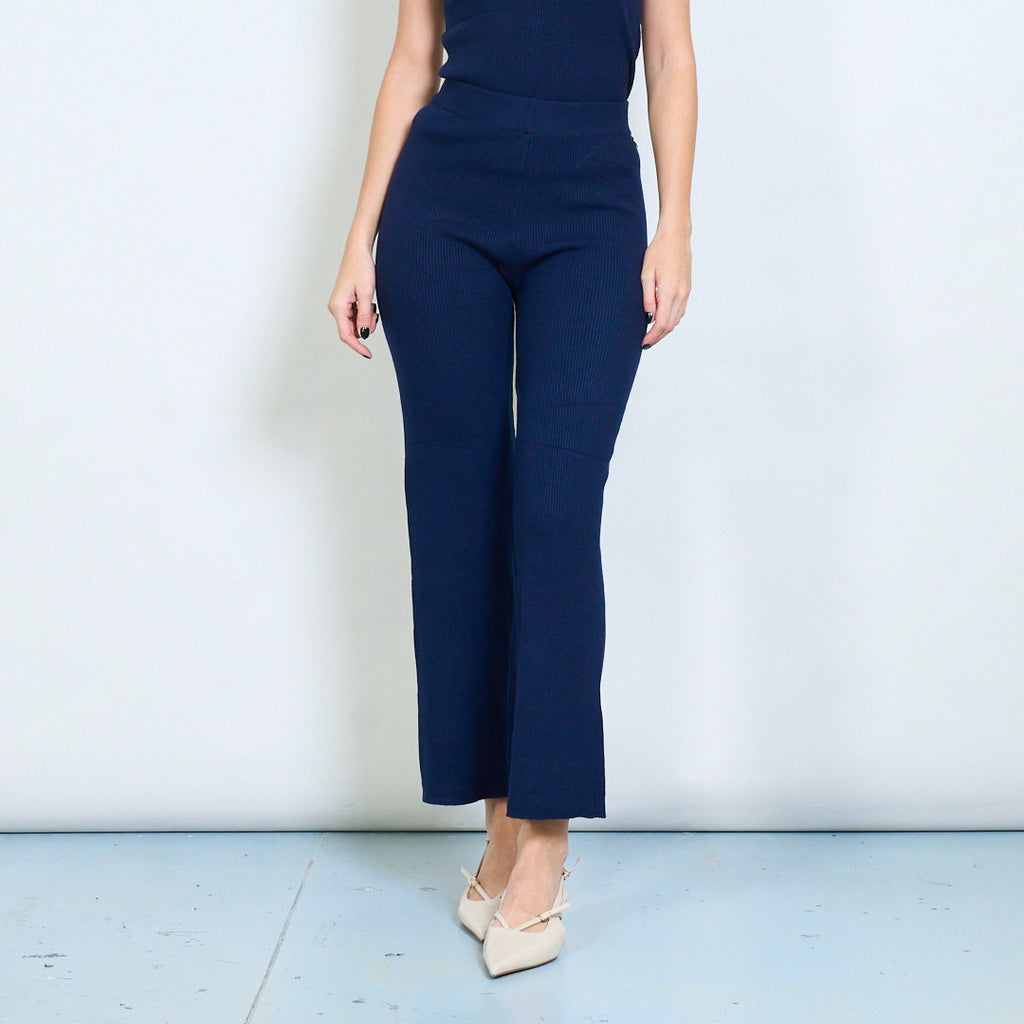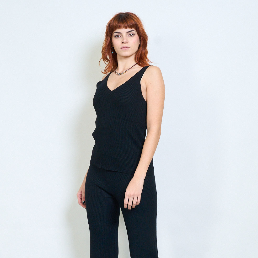 - طقم من ثلاث قطع متماسكة ومضلعة، يتميز بسترة صوفية، وبلوزة برقبة على شكل حرف V، وبنطلون بأرجل واسعة