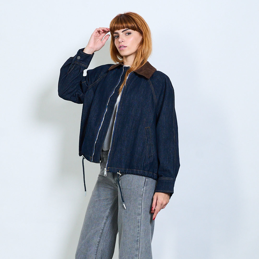 سترة الدنيم بسحاب مع ذوي الياقات البيضاء على النقيض