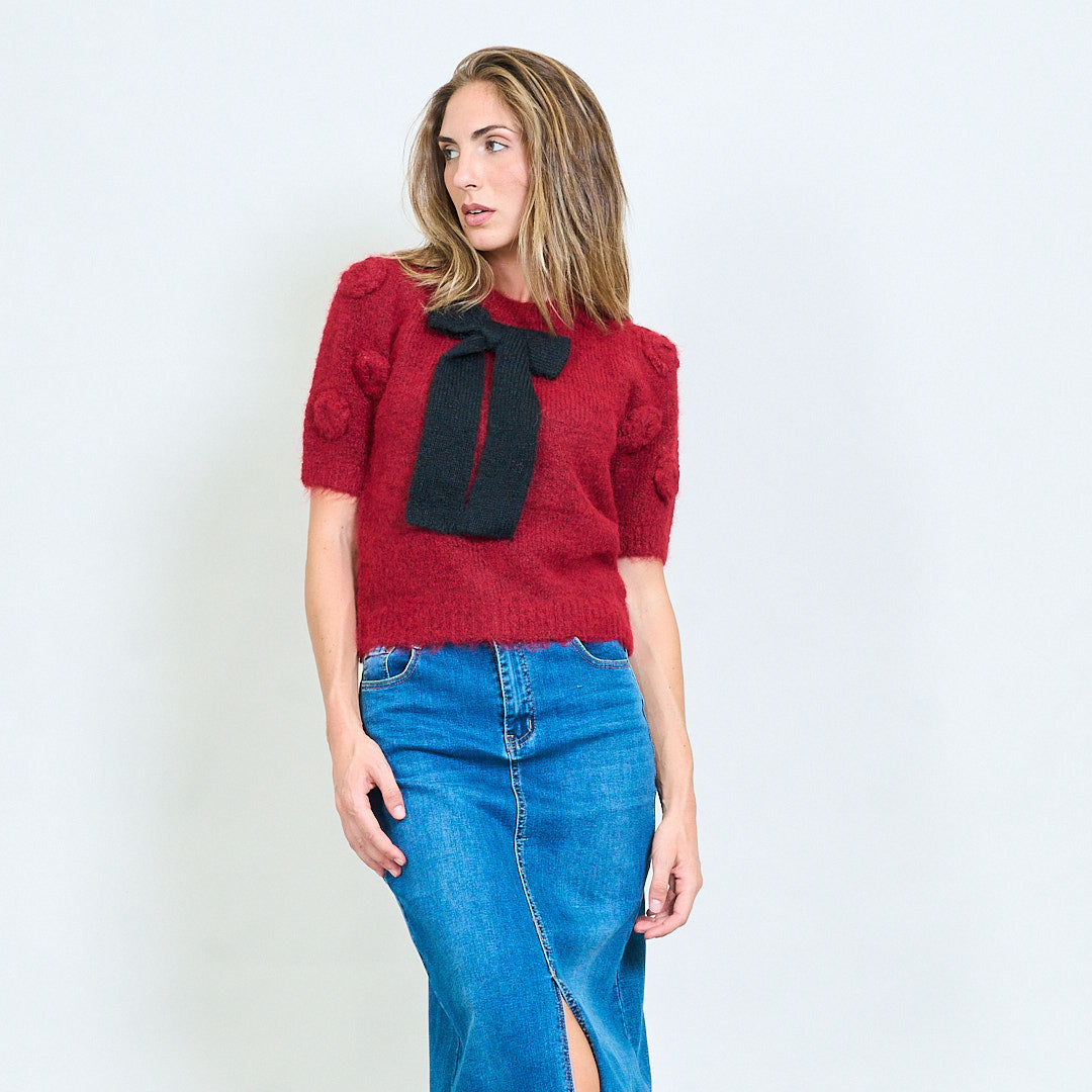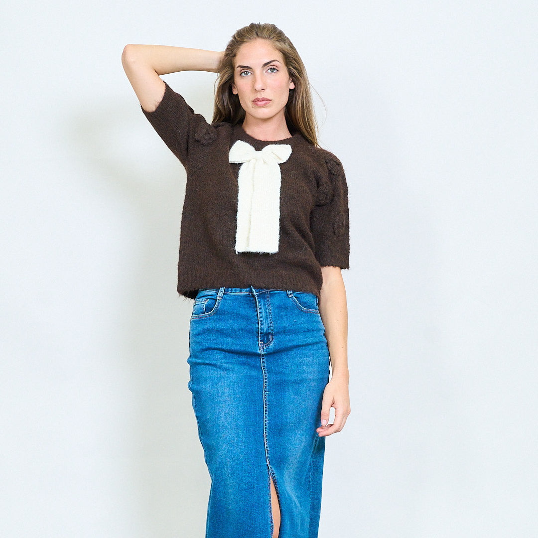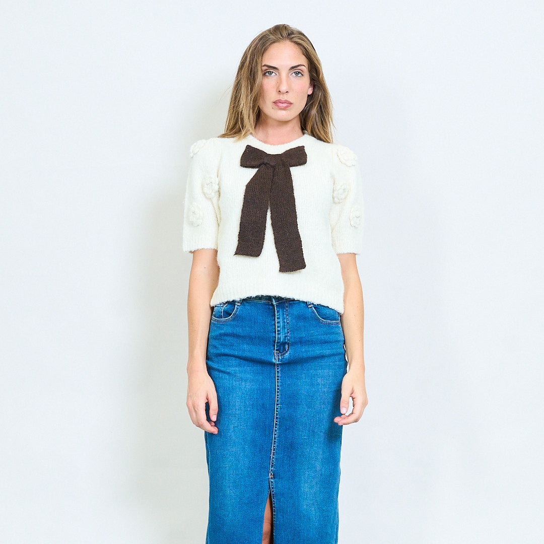 سترة قصيرة غامضة من الأكمام القصيرة مع تفاصيل القوس المحبوكة كبيرة الحجم