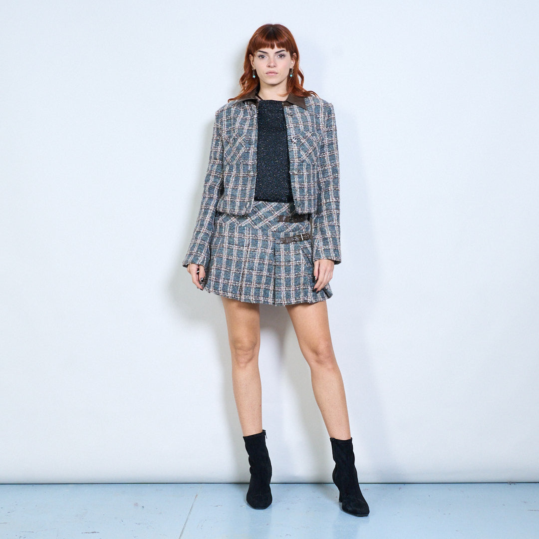 - سترة قصيرة أنيقة تتميز بنسيج تويد كلاسيكي منقوش مع ملمس وبنية راقية