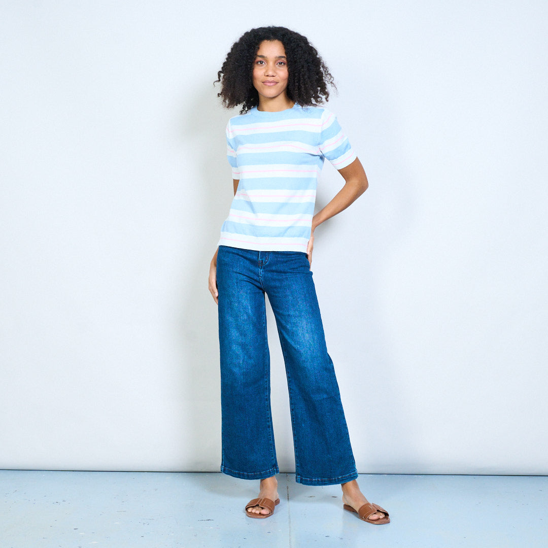 بلوزة متماسكة بأكمام قصيرة ورقبة دائرية متباينة للبيع بالجملة