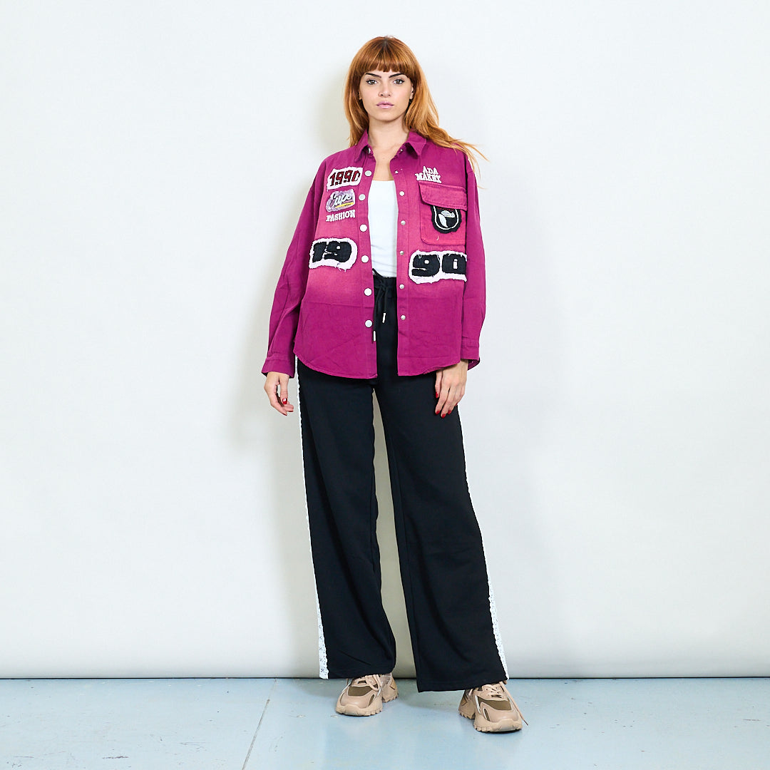 - قميص الدنيم المتضخم مع تفاصيل الرسم الجريء