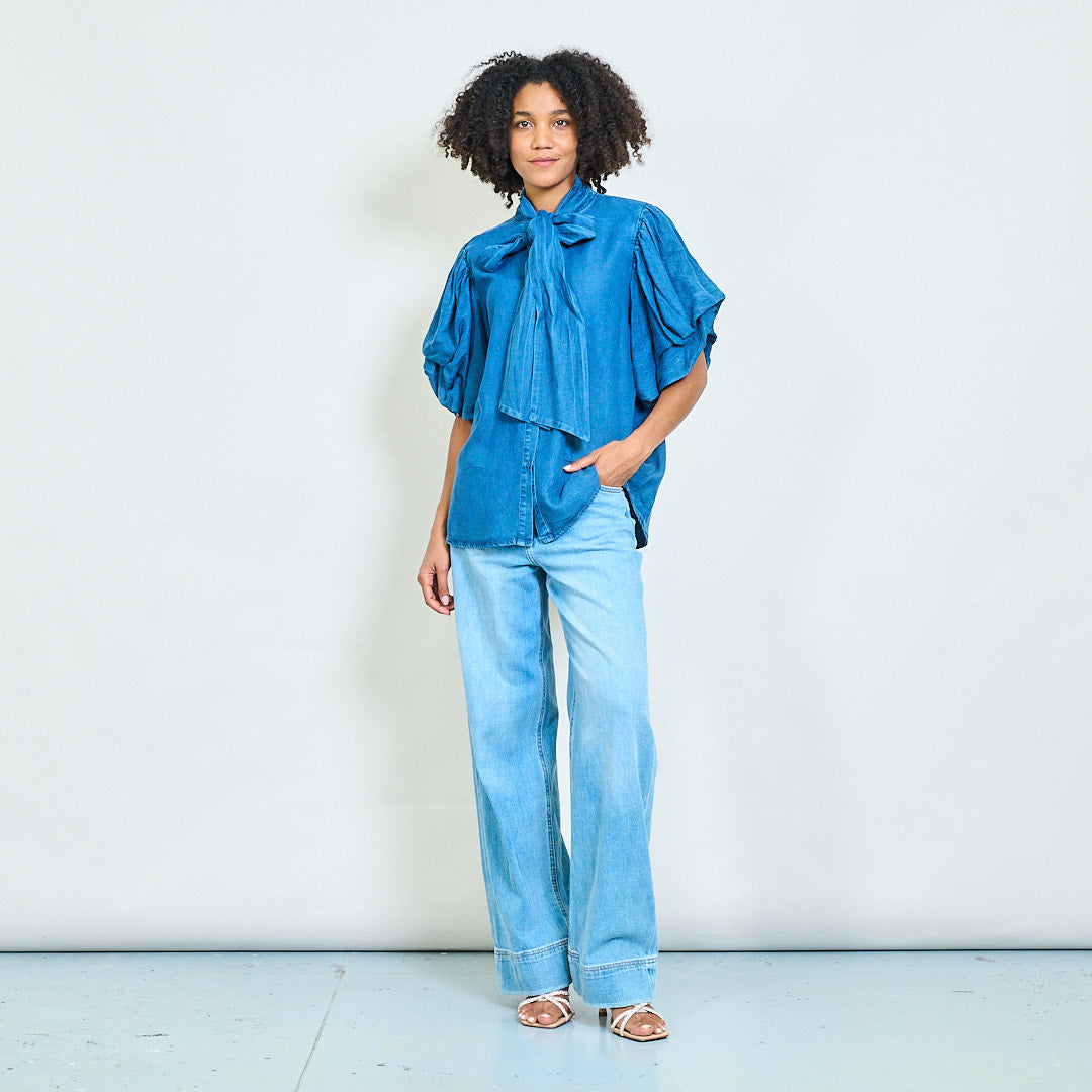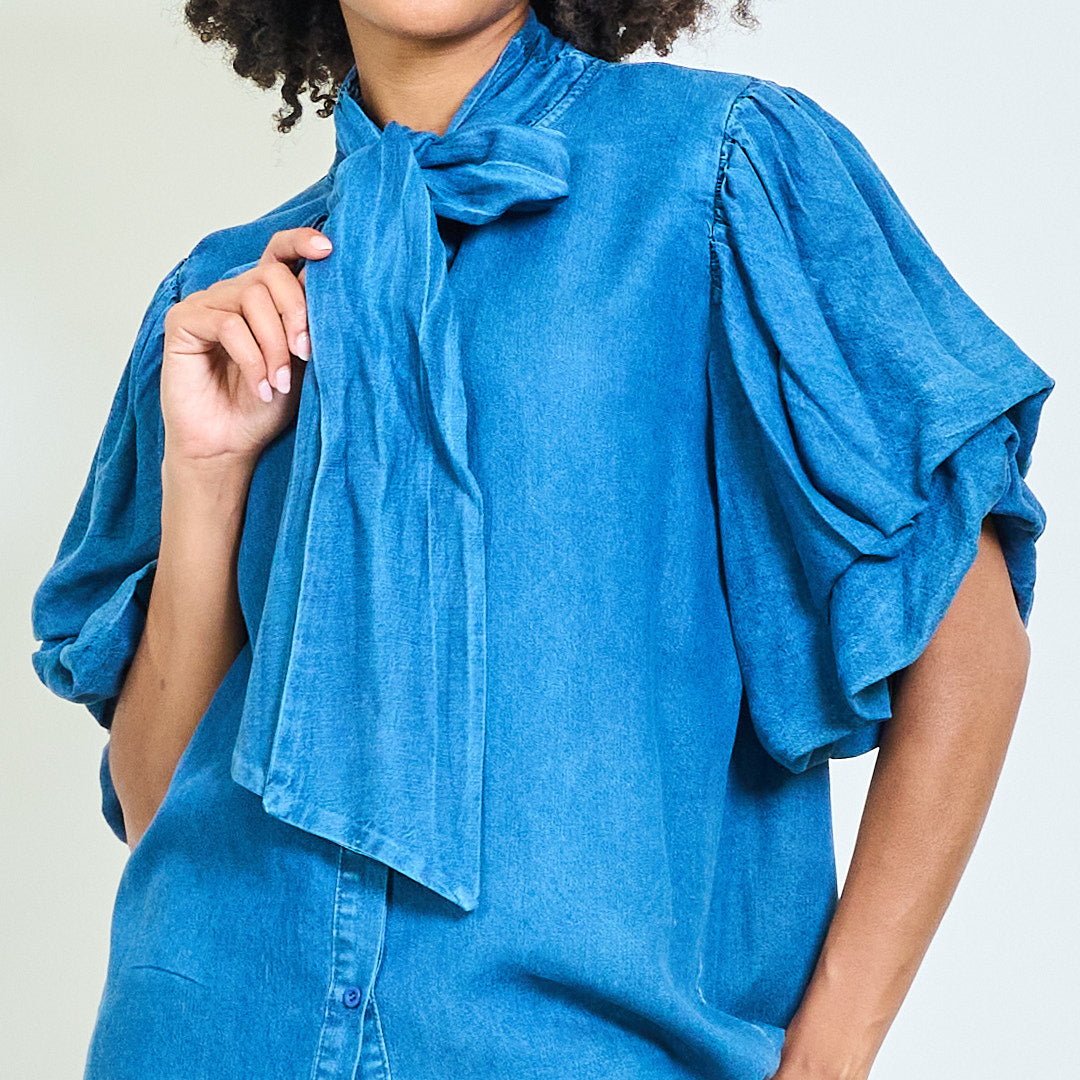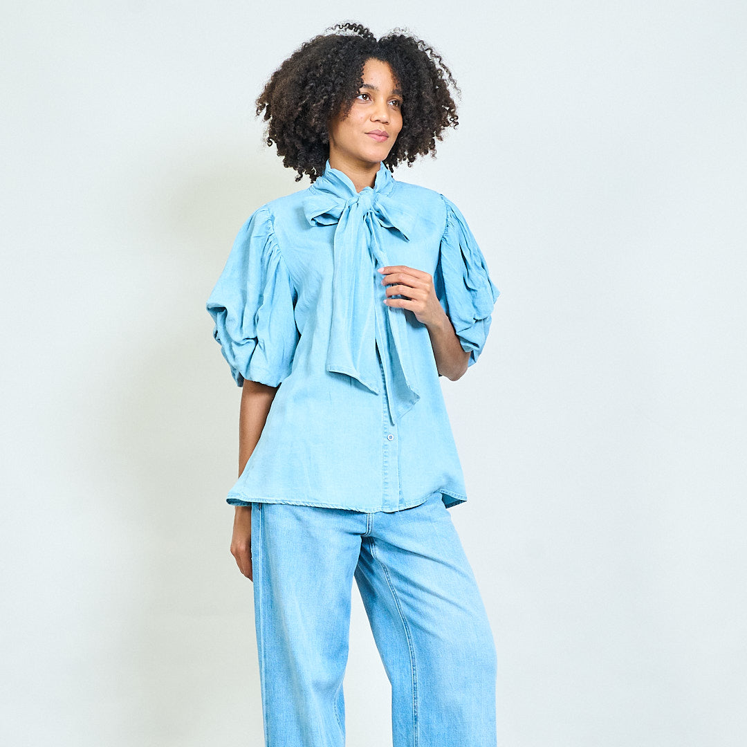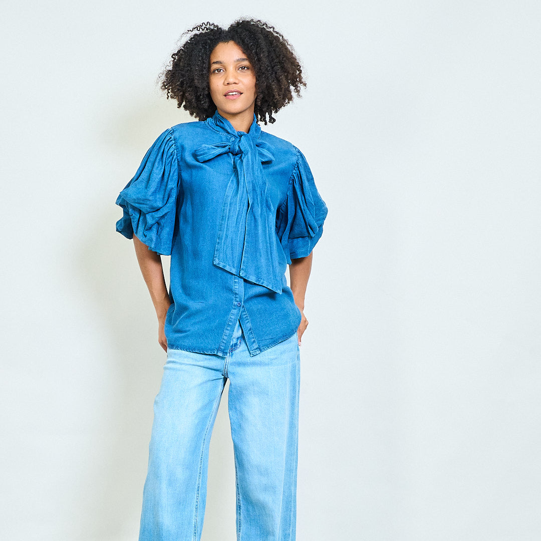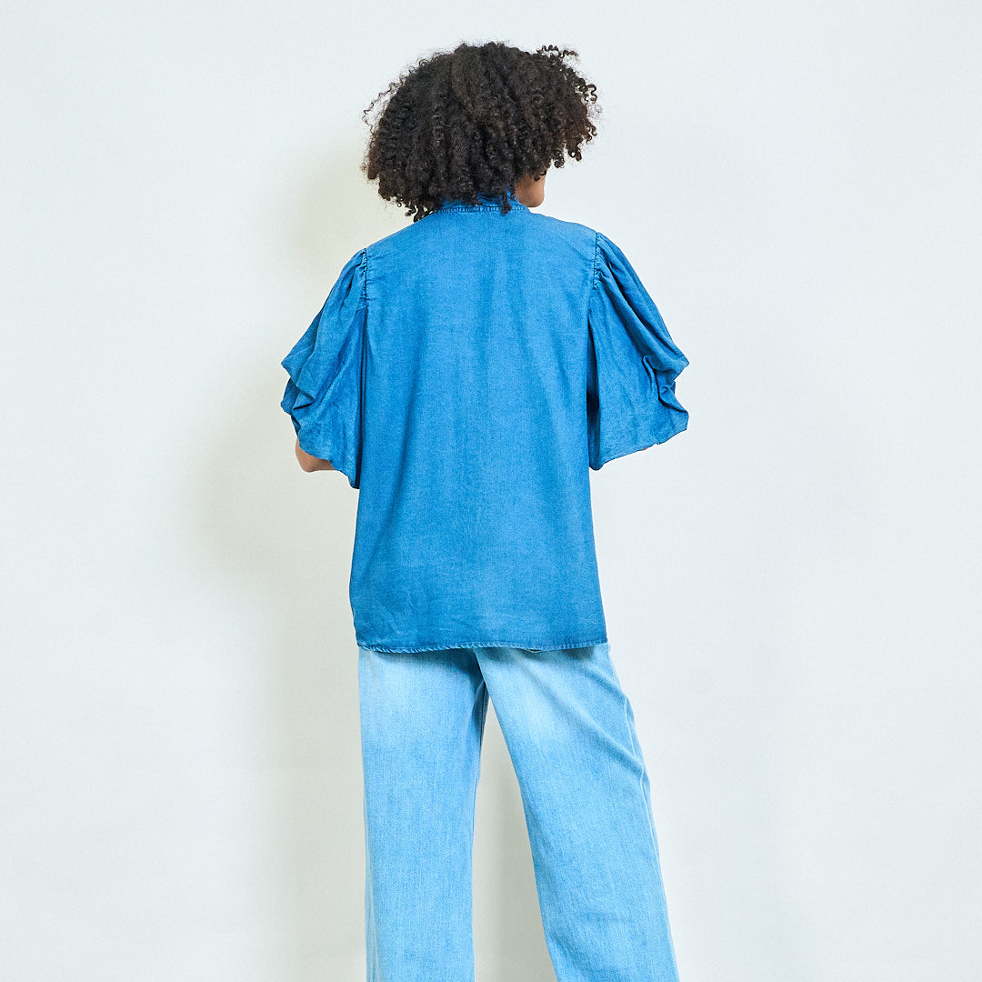 - بلوزة أنثوية مع أكتاف روتش وأكمام ضخمة