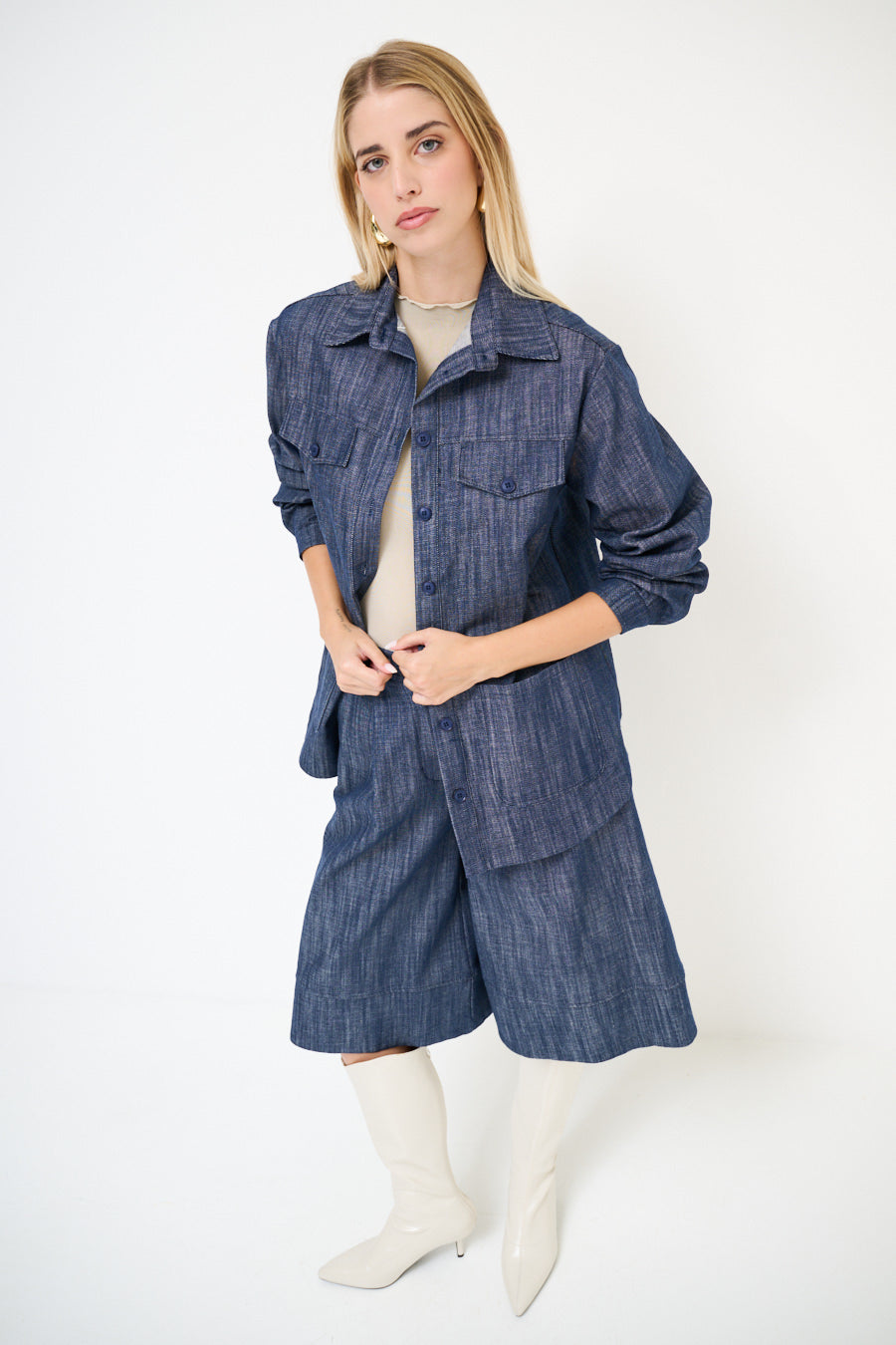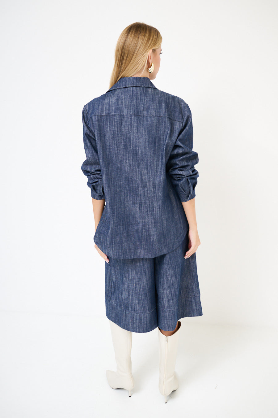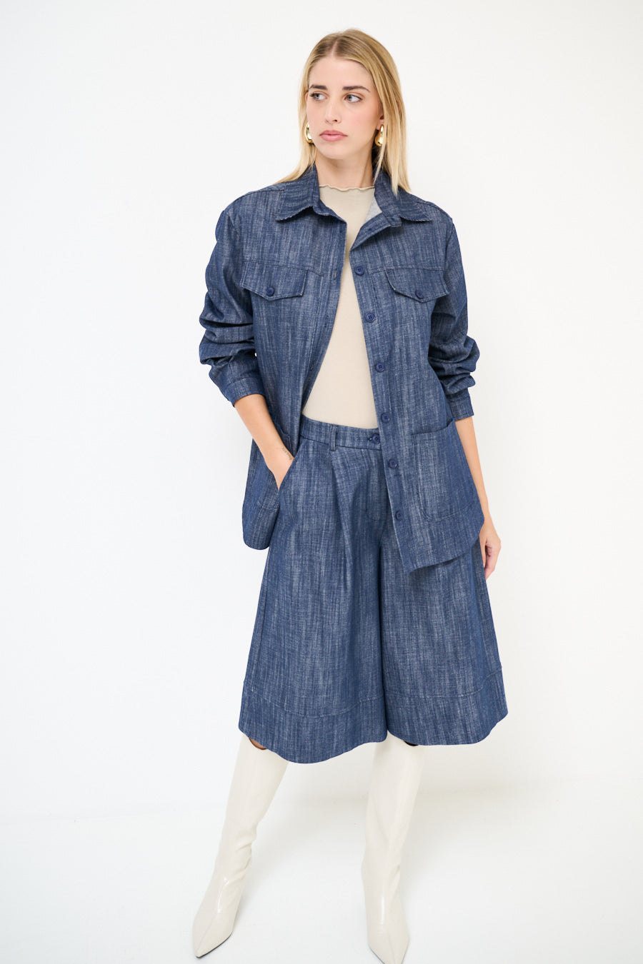 سترة قميص من الدنيم ذي الآثار المليئة مع جيوب رفرف الجملة