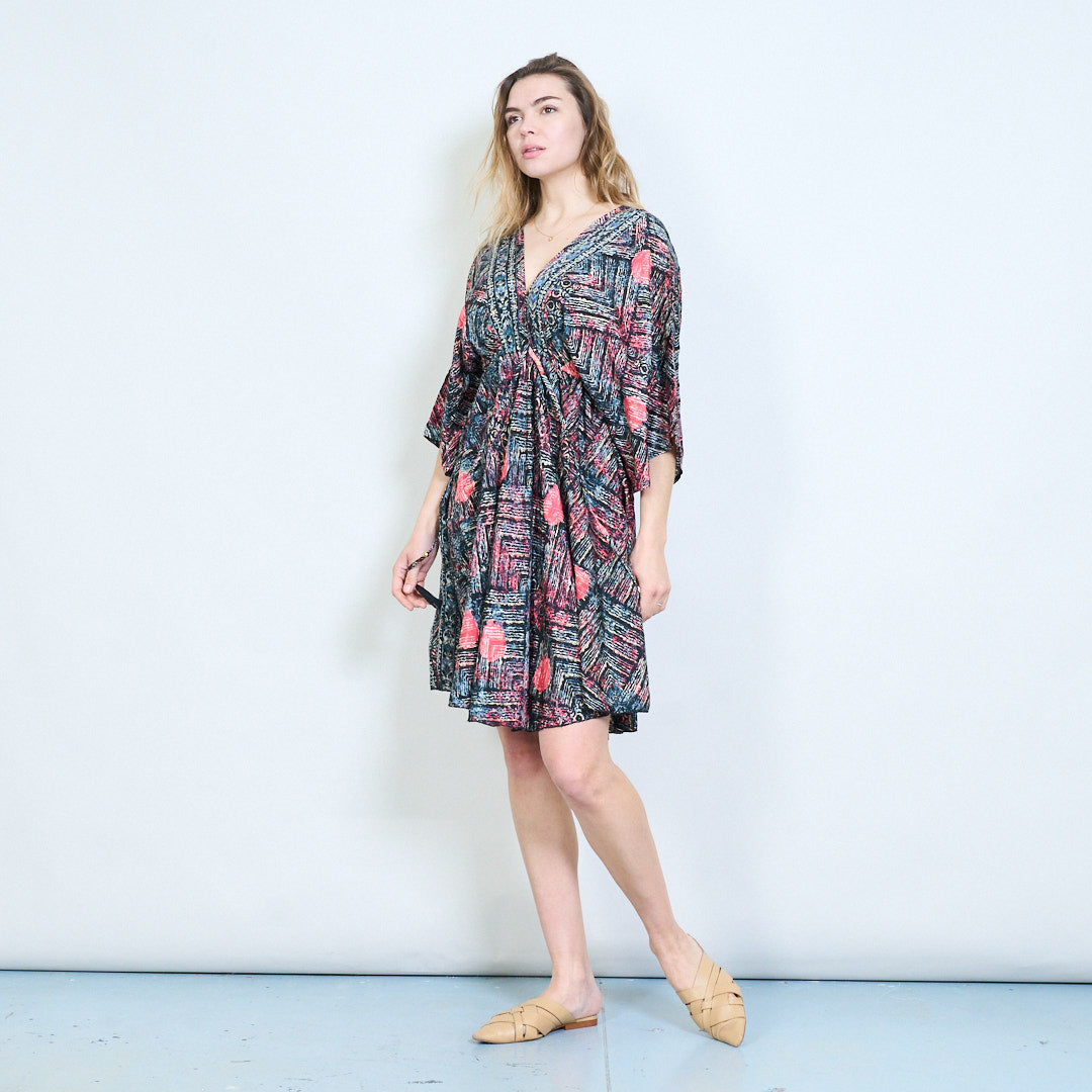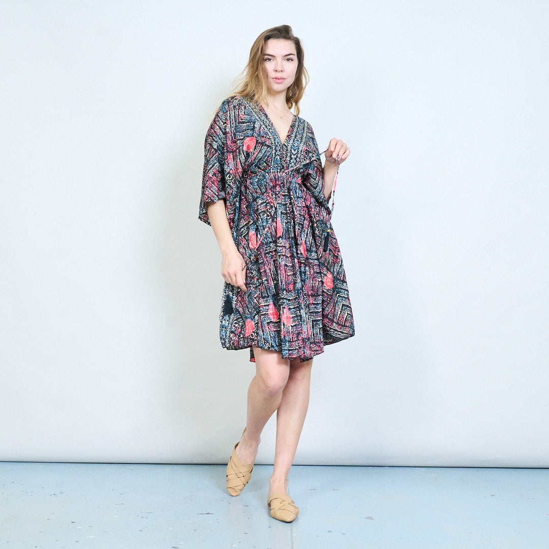 فستان ميدي مطبوع مع خط عنق على الحدود وربطة عنق شرابة بالجملة