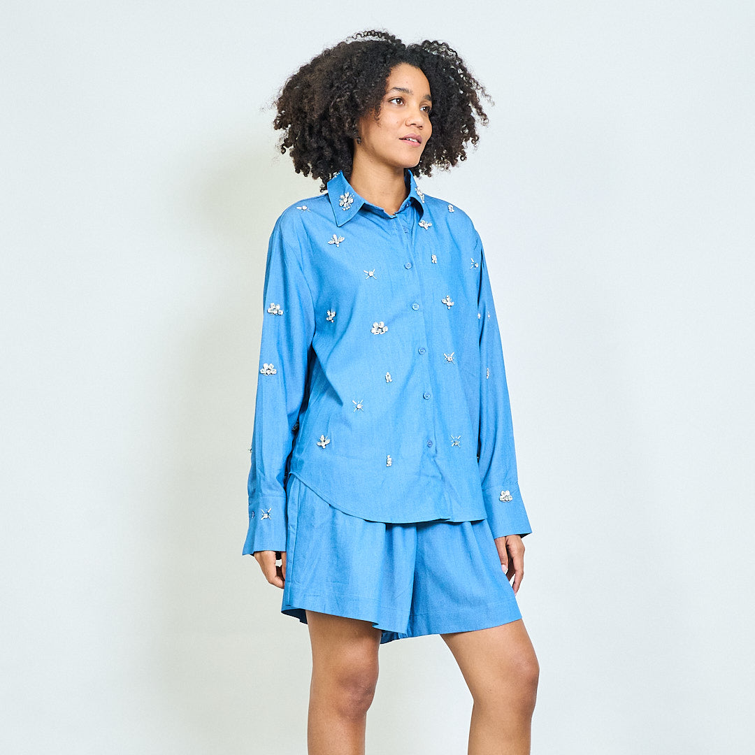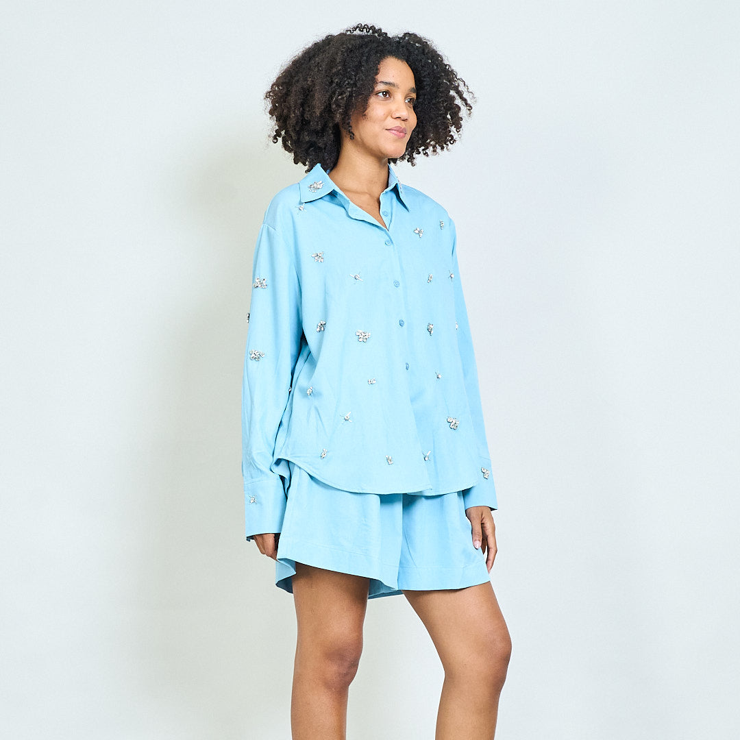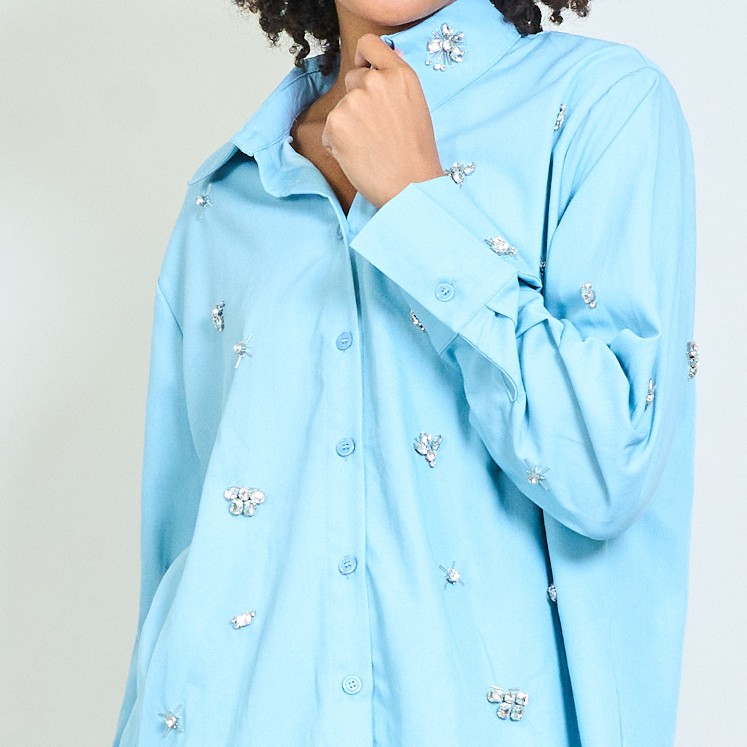 - يتميز القميص بزخارف بلورية ولهجات ذوي الياقات البيضاء