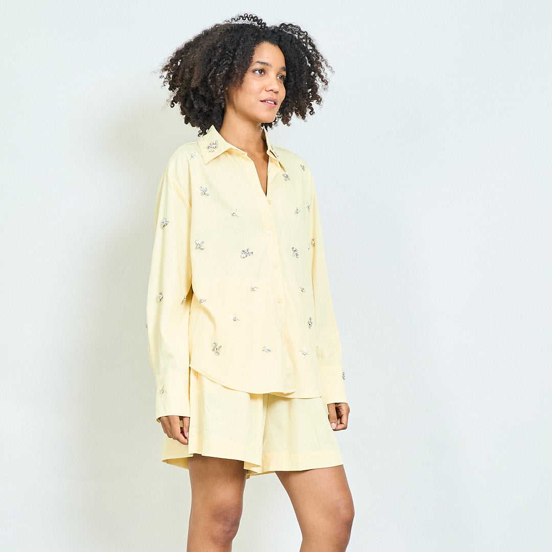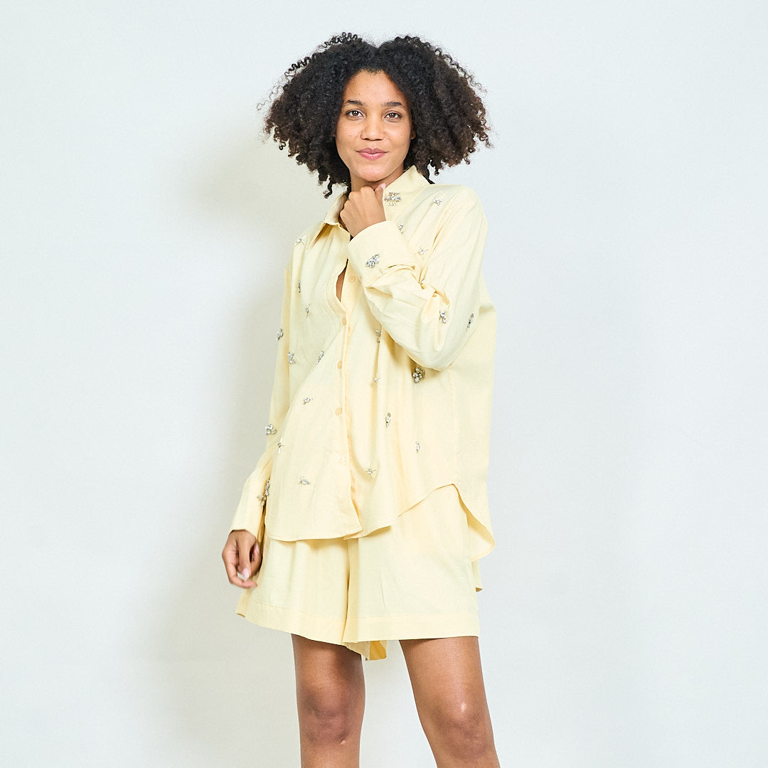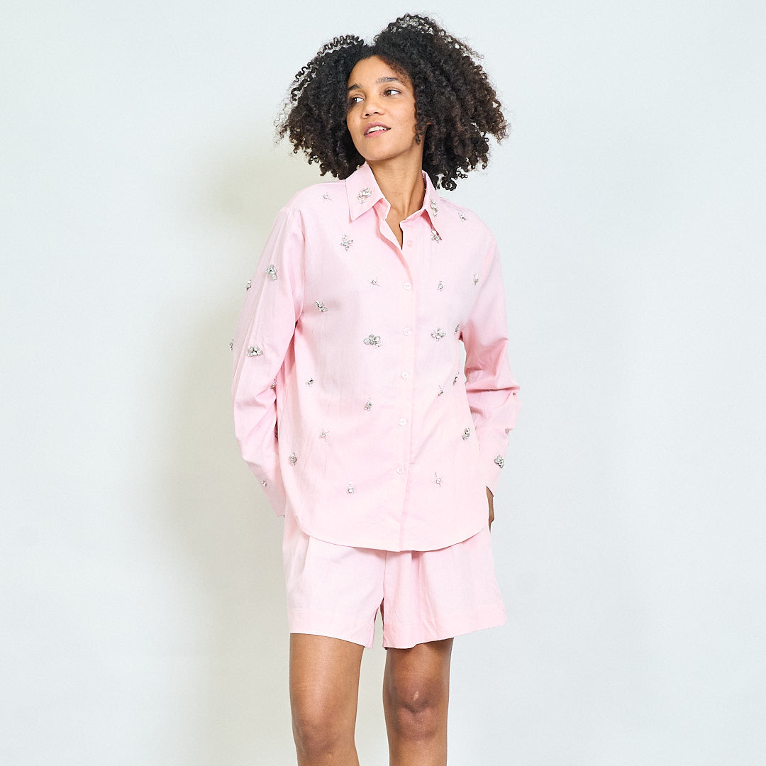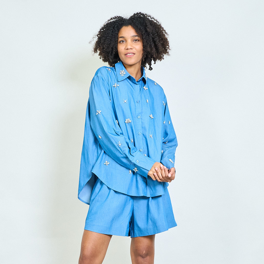 - يتميز القميص بزخارف بلورية ولهجات ذوي الياقات البيضاء