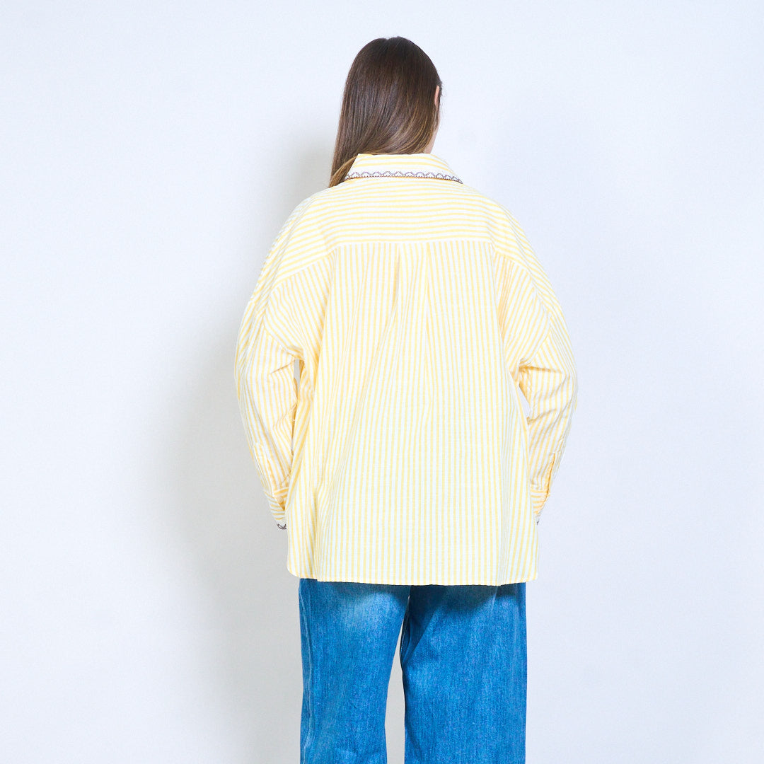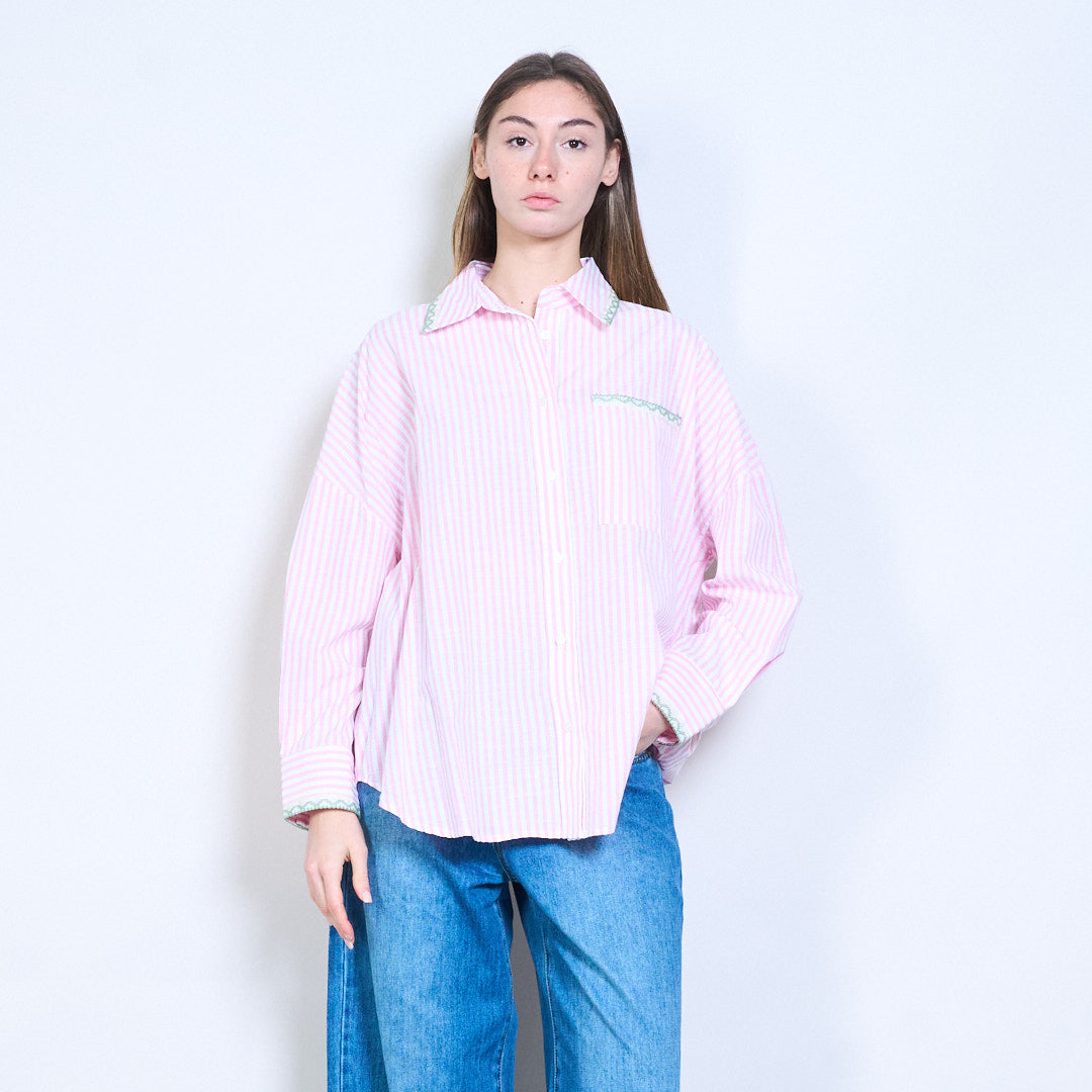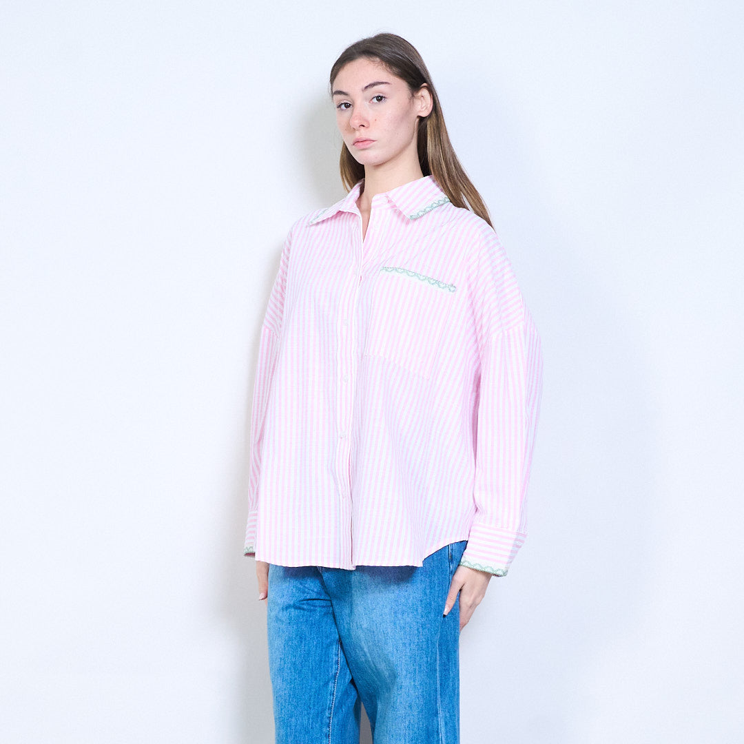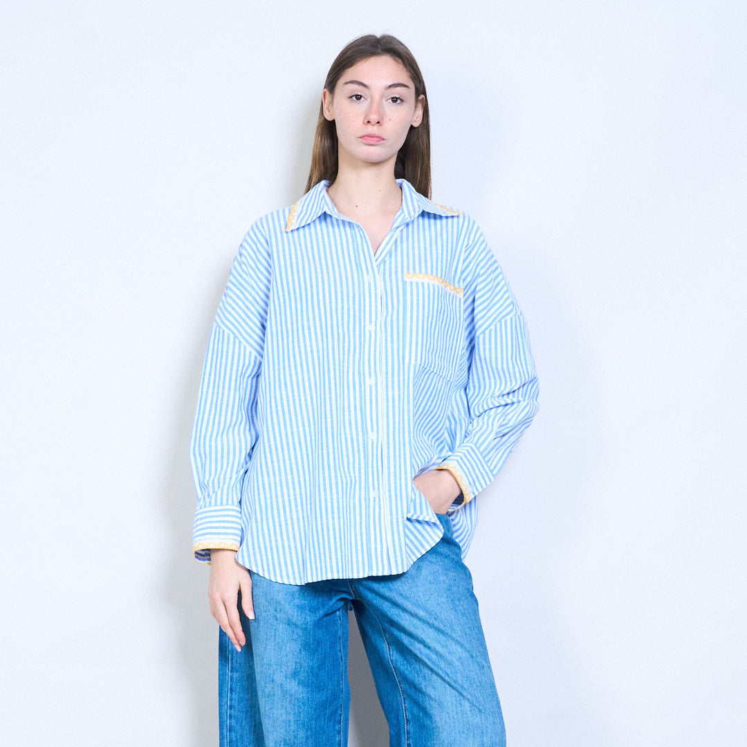 قميص بأزرار أمامية بتفاصيل مخططة ومقاس مريح للبيع بالجملة