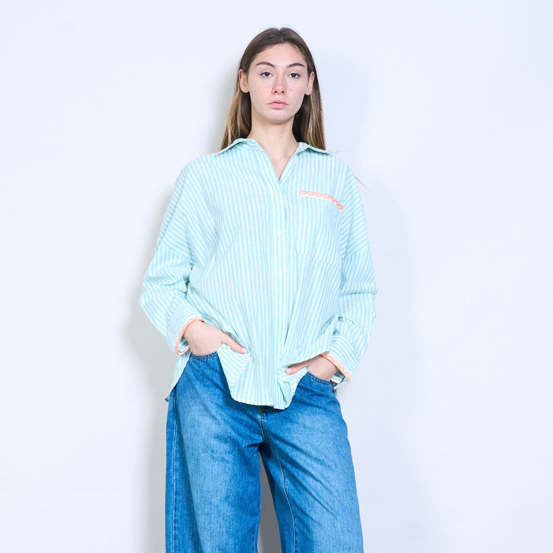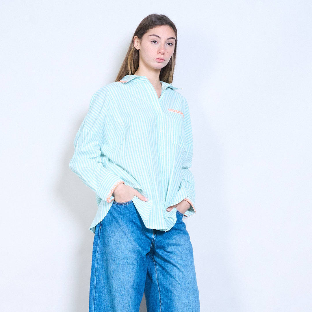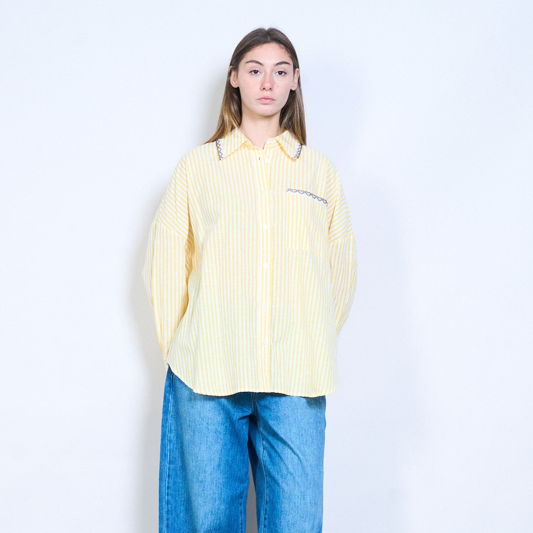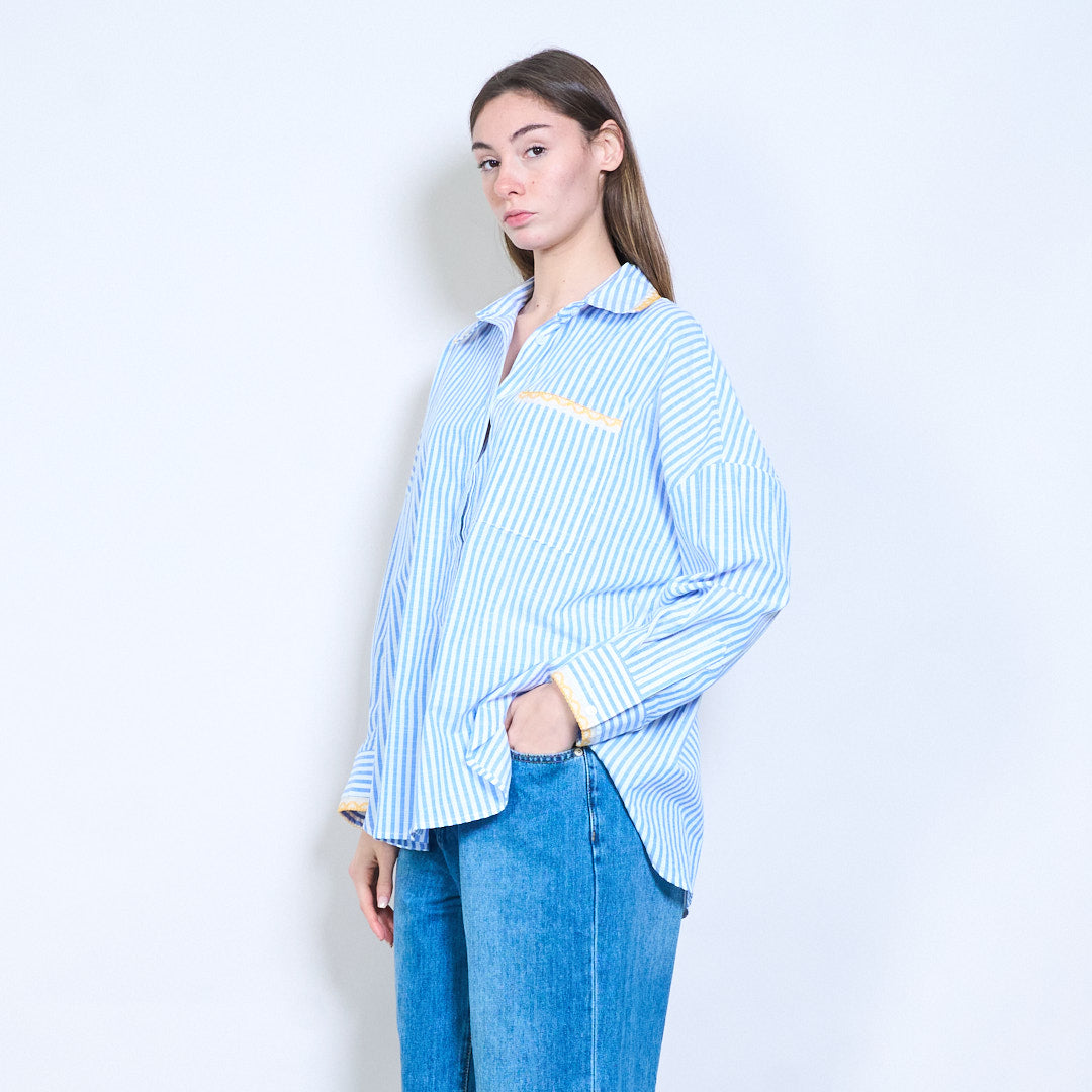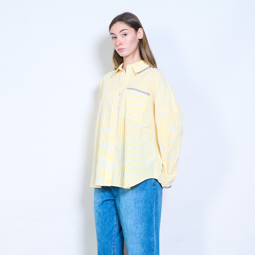 قميص بأزرار أمامية بتفاصيل مخططة ومقاس مريح للبيع بالجملة