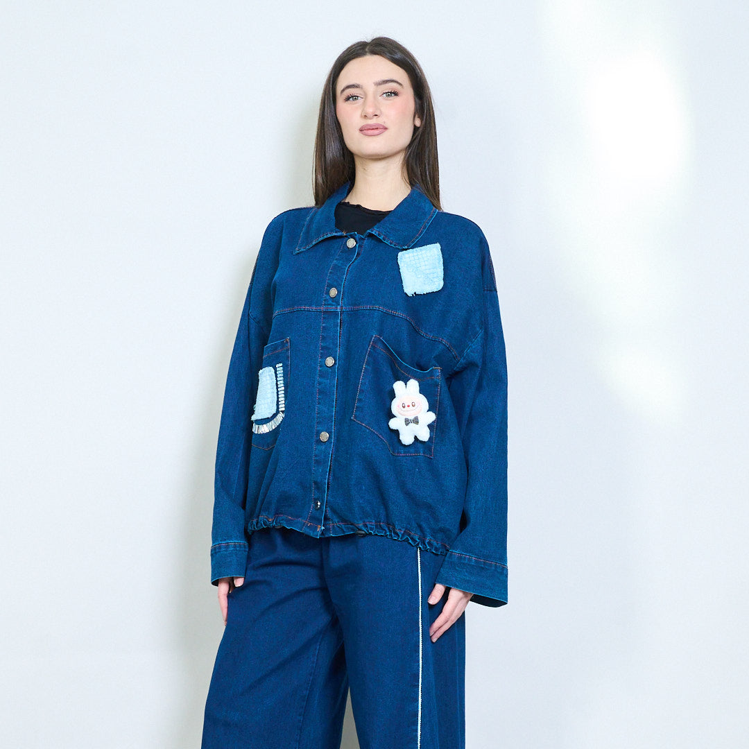 سترة من الدنيم مع رقعة مرحة وتفاصيل جيب بالجملة