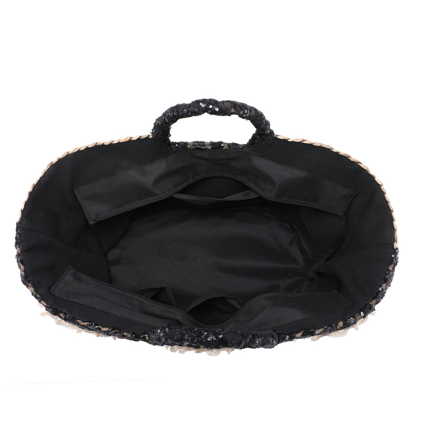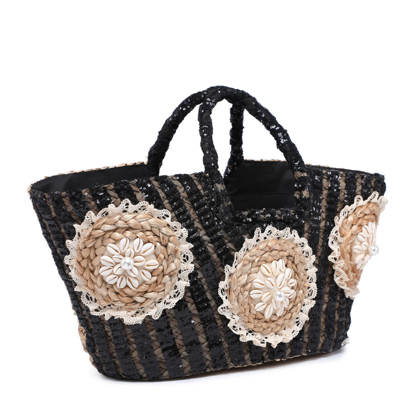 حقيبة قش ترتر مخططة مع ورود قذيفة وحدود الدانتيل بالجملة
