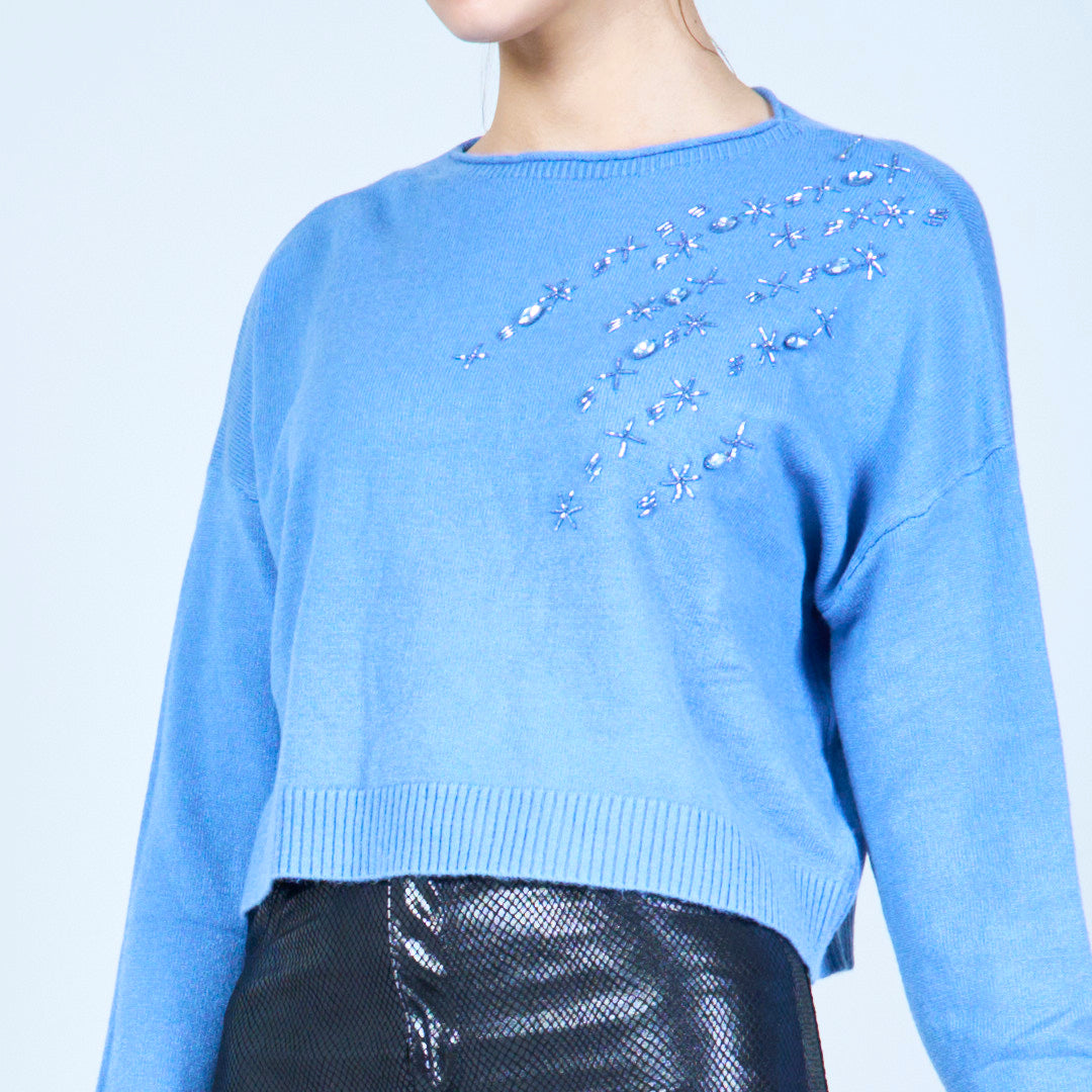 - تفاصيل مرصعة بالجواهر الدقيقة على طول خط العنق