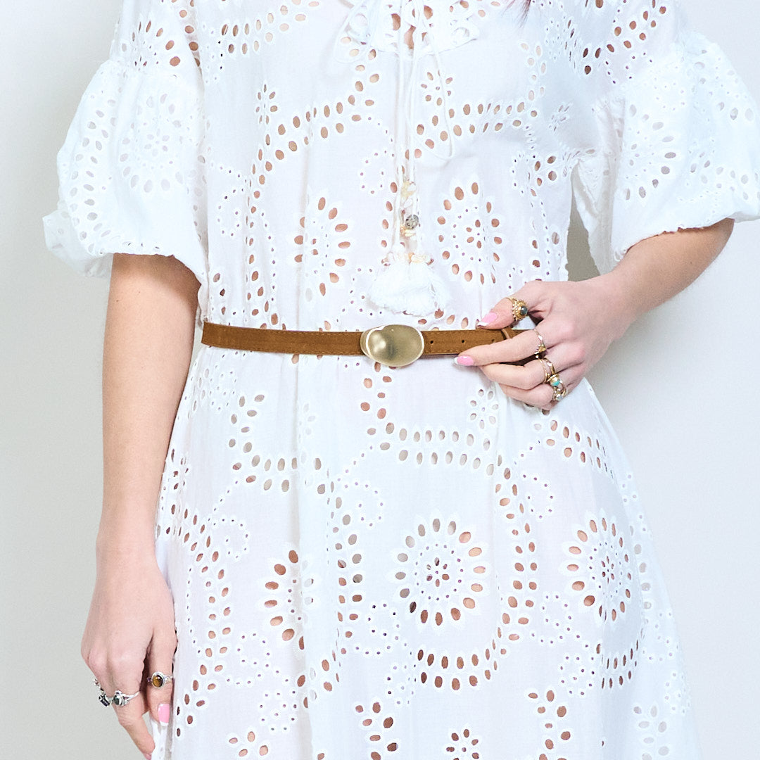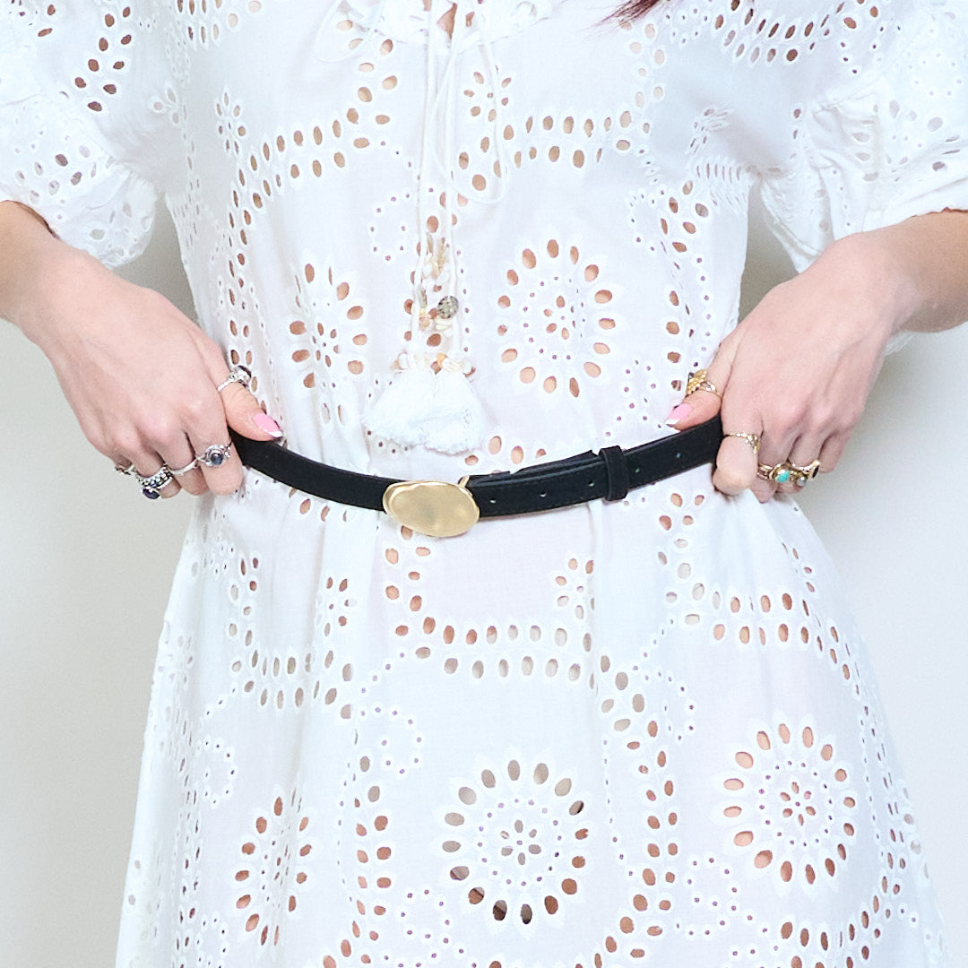 - Текстурирани кръгли метални шипове, поставени по дължината на колана