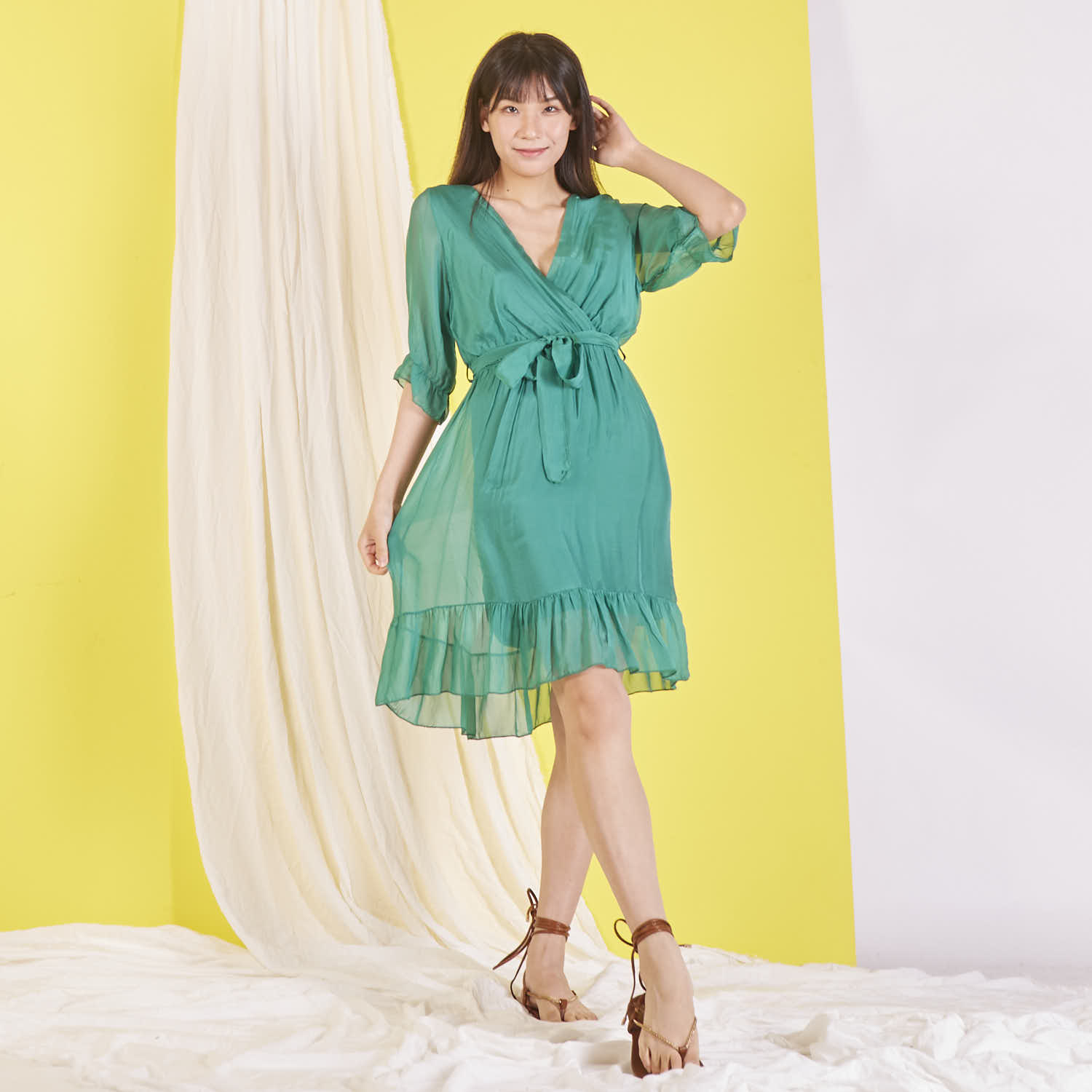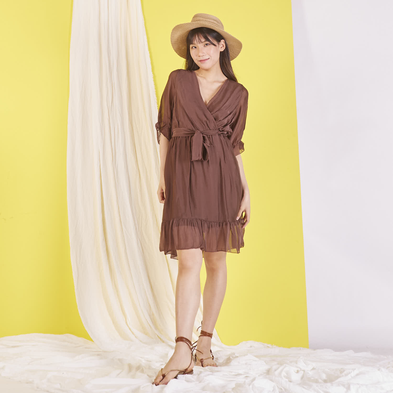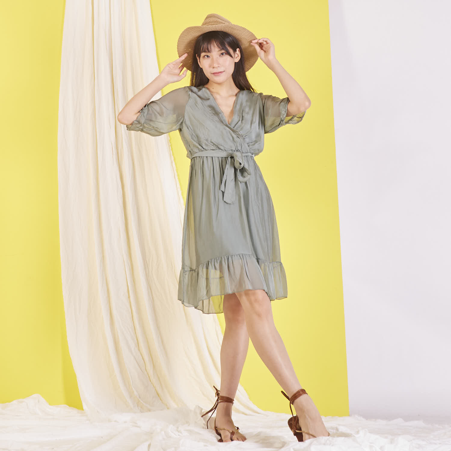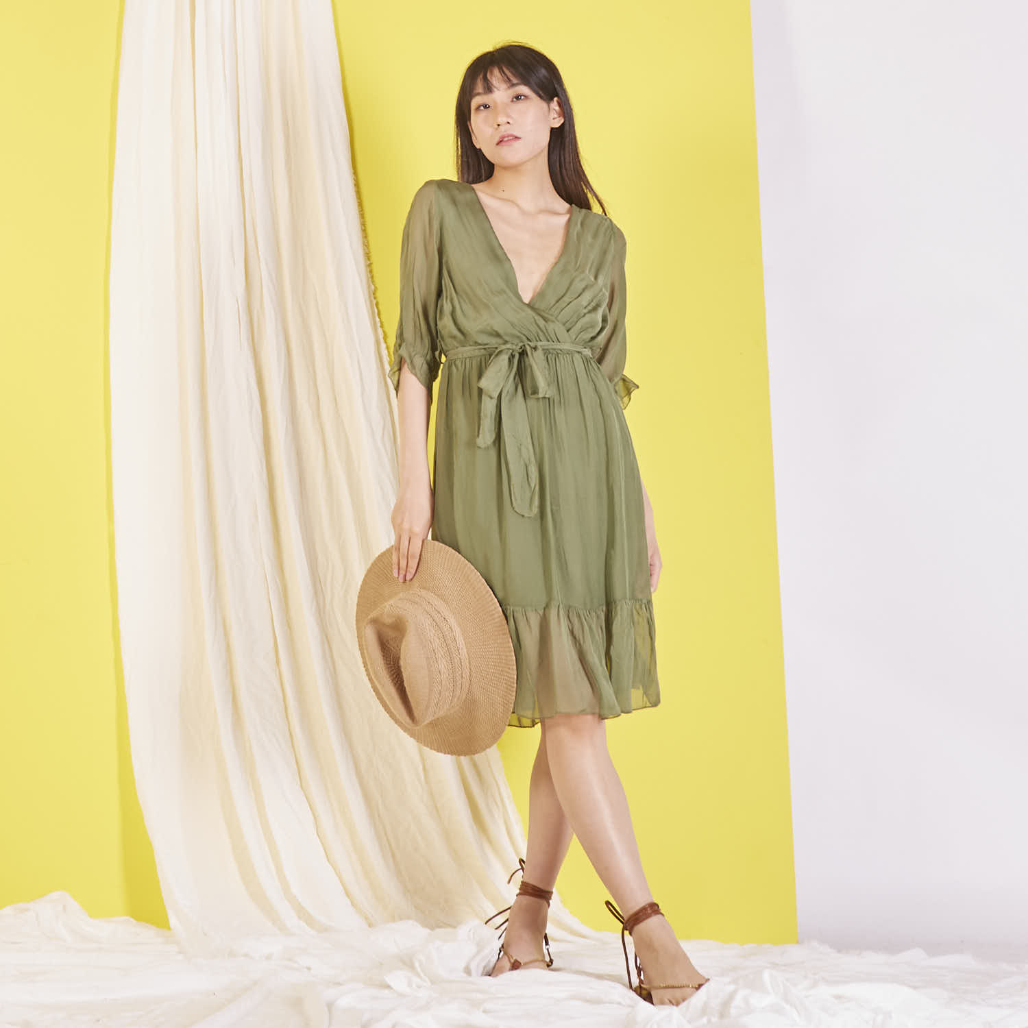 Рокля на коприна на коприна на едро с кръстосано деколте