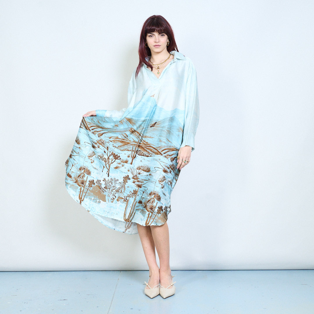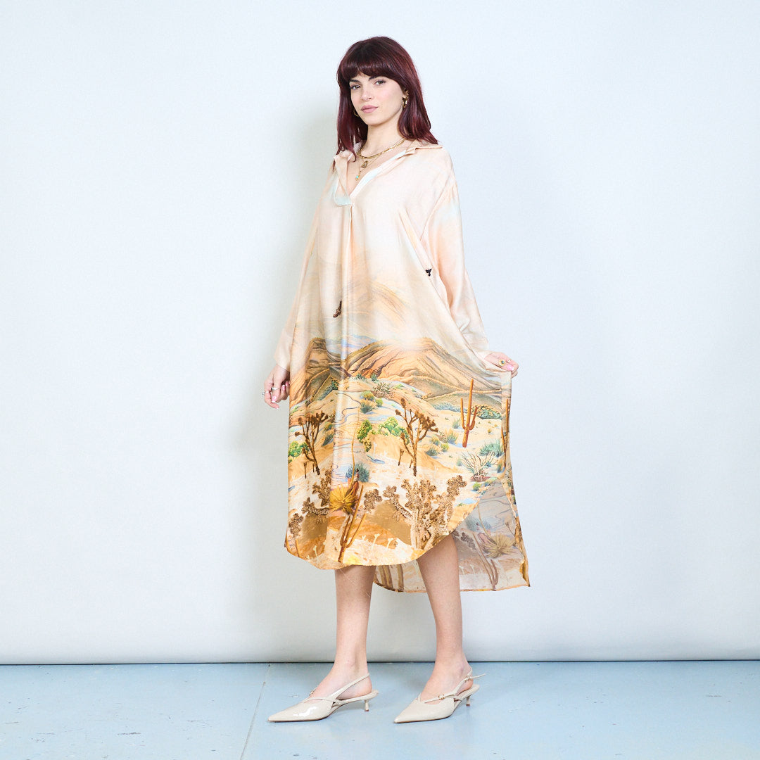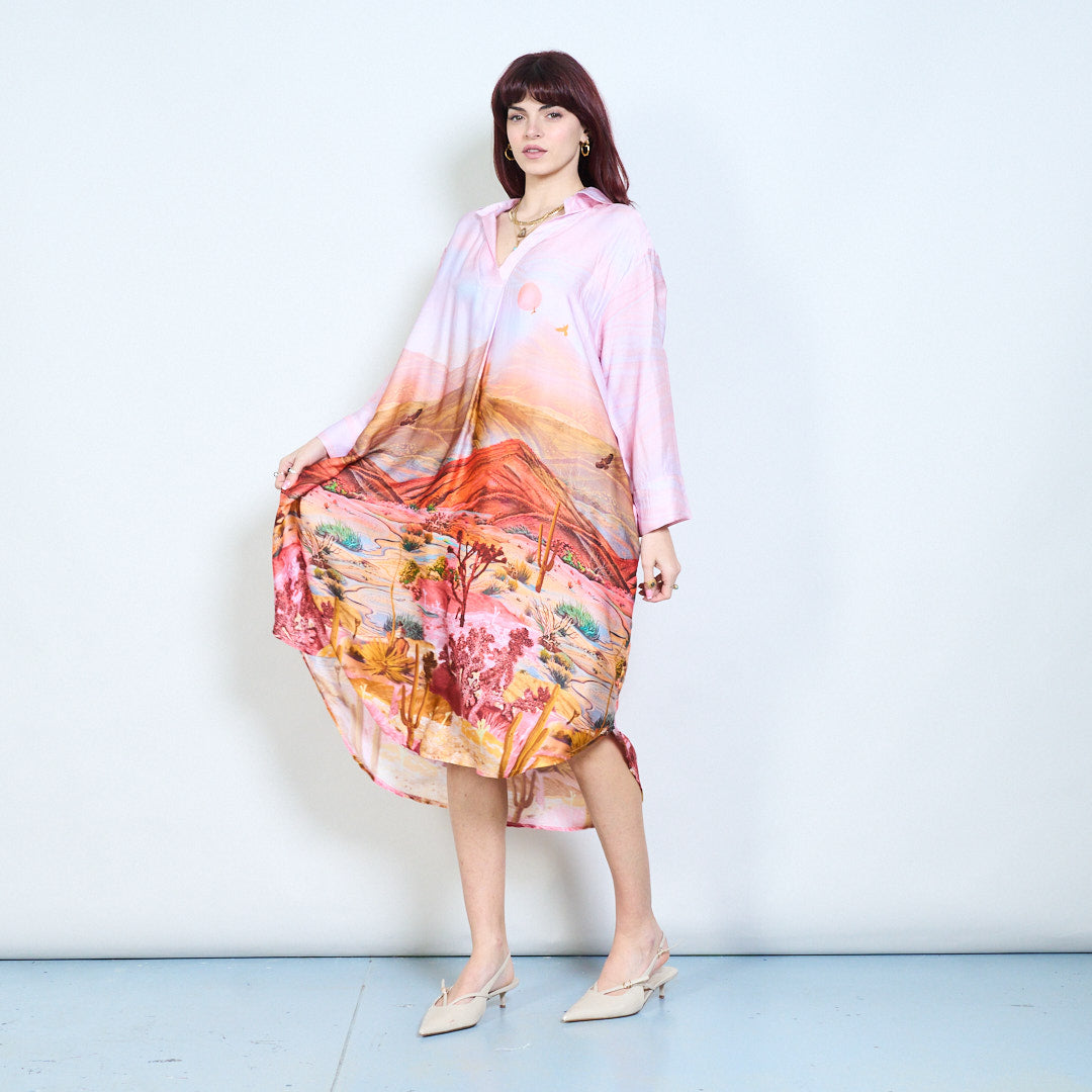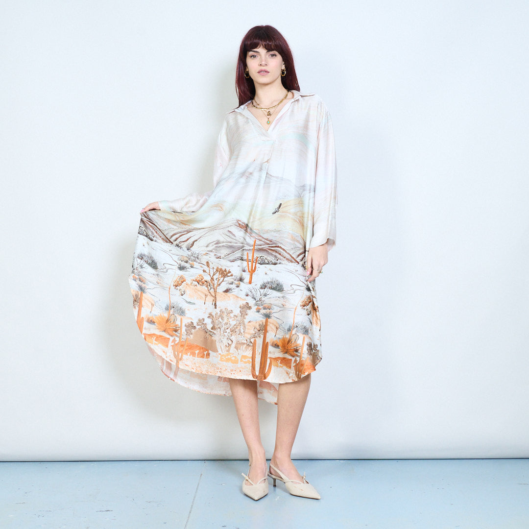 Рокля с риза с дълъг ръкав с принт на живописен пейзаж на едро