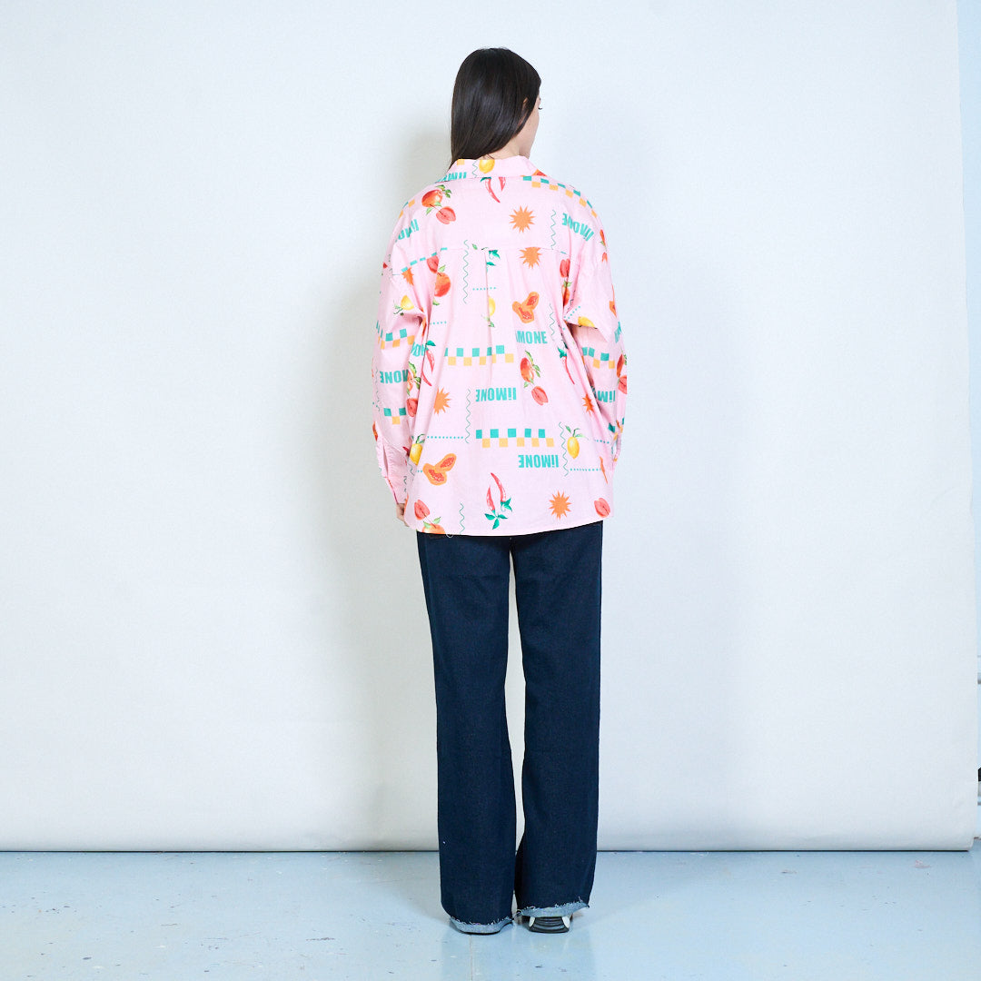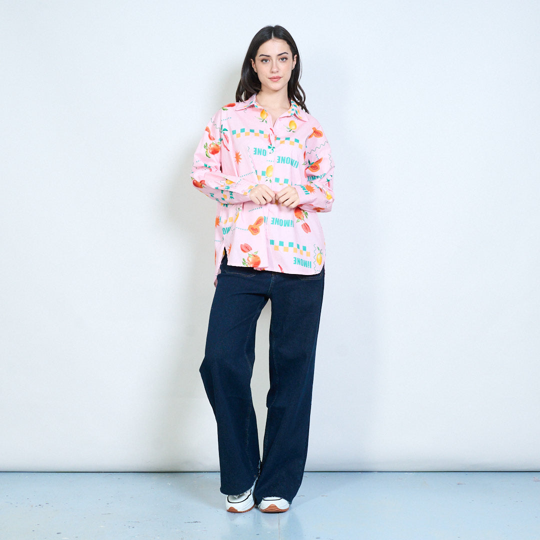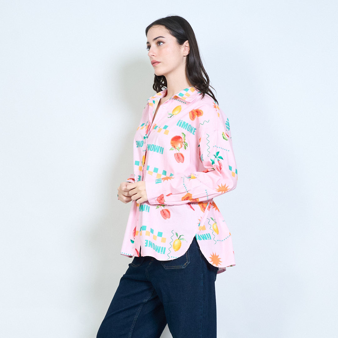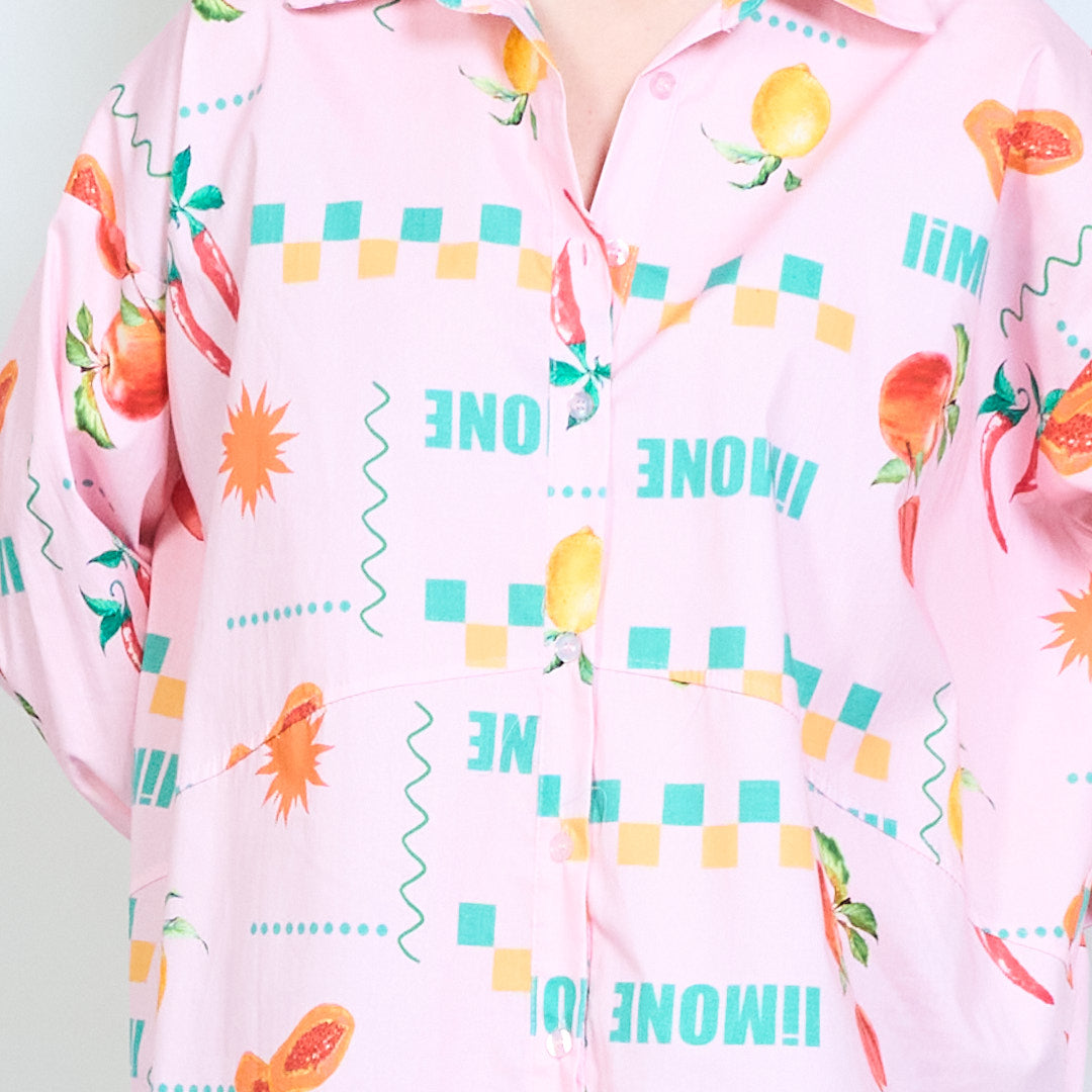Спокойна риза с копчета с принт на плодове и лозунги на едро