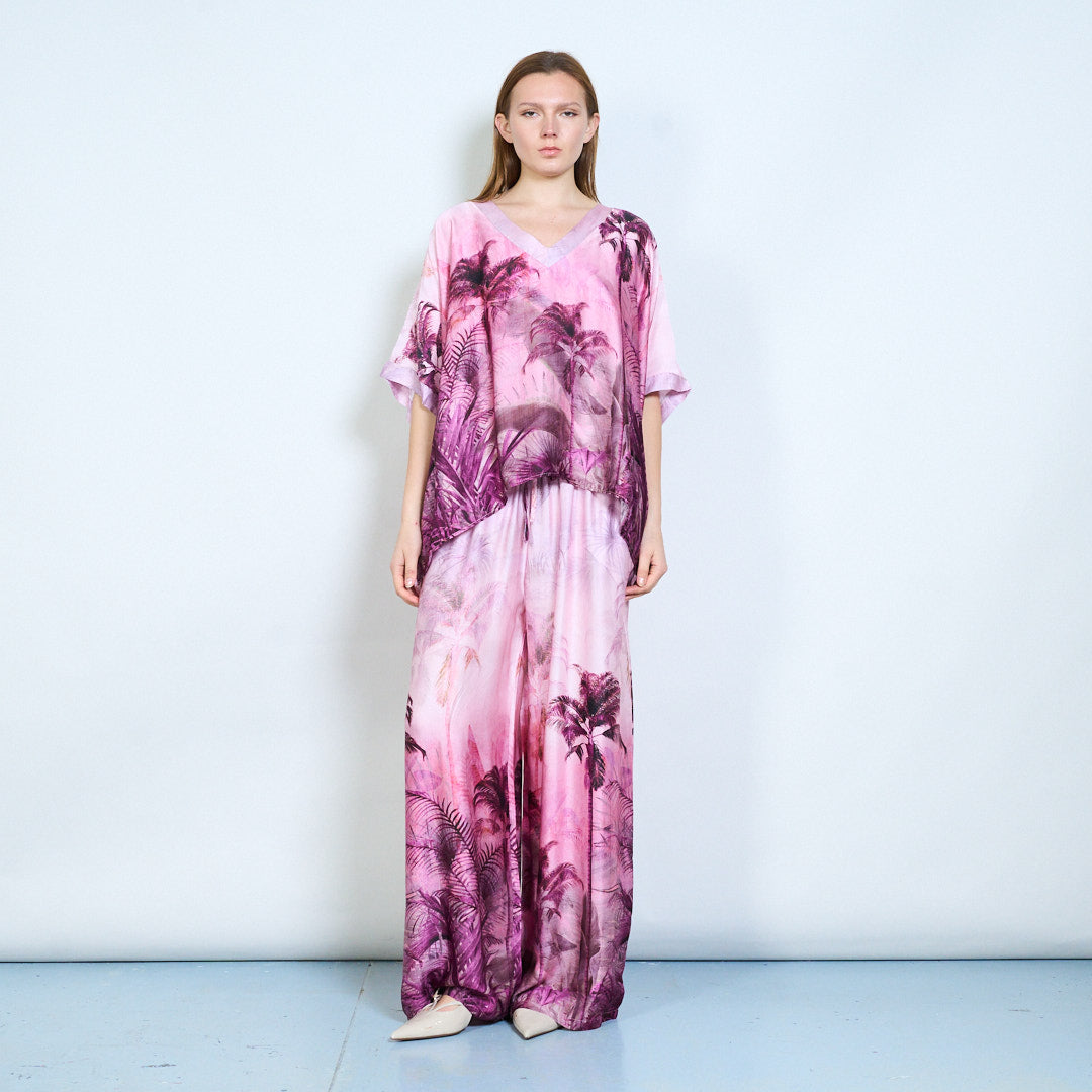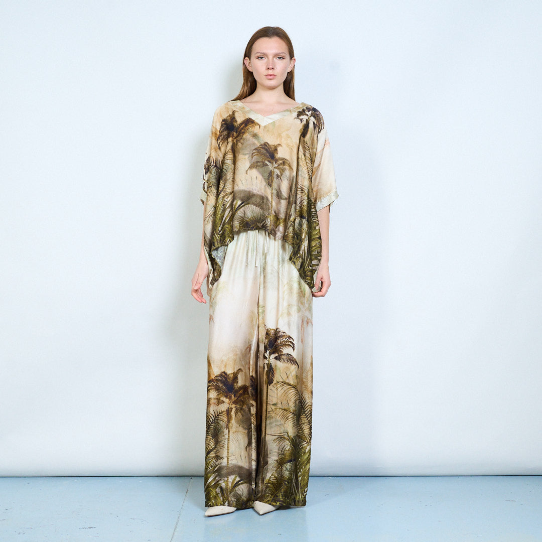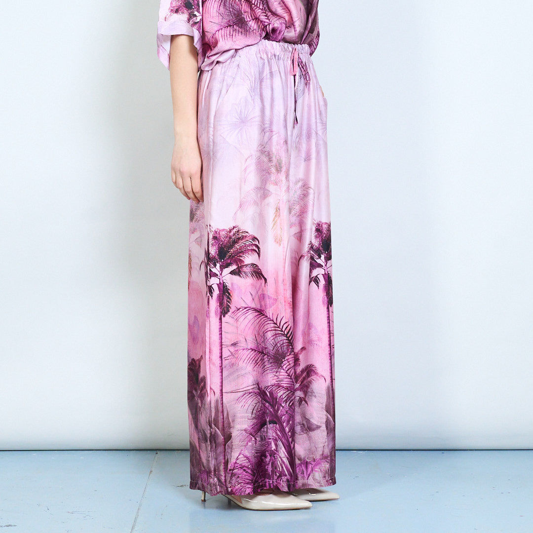 Спокойни панталони с щампа на флорални палми и еластична талия на едро
