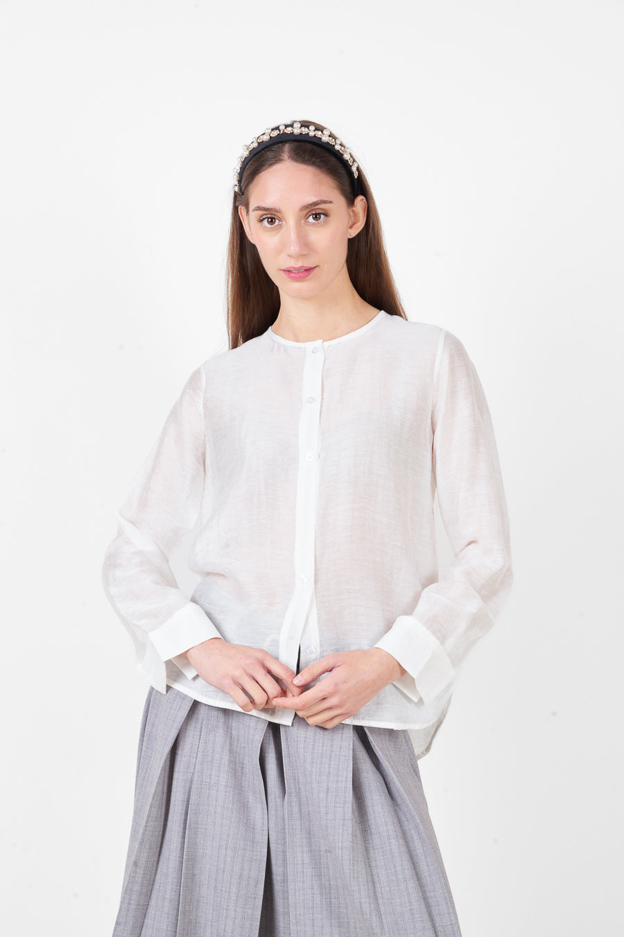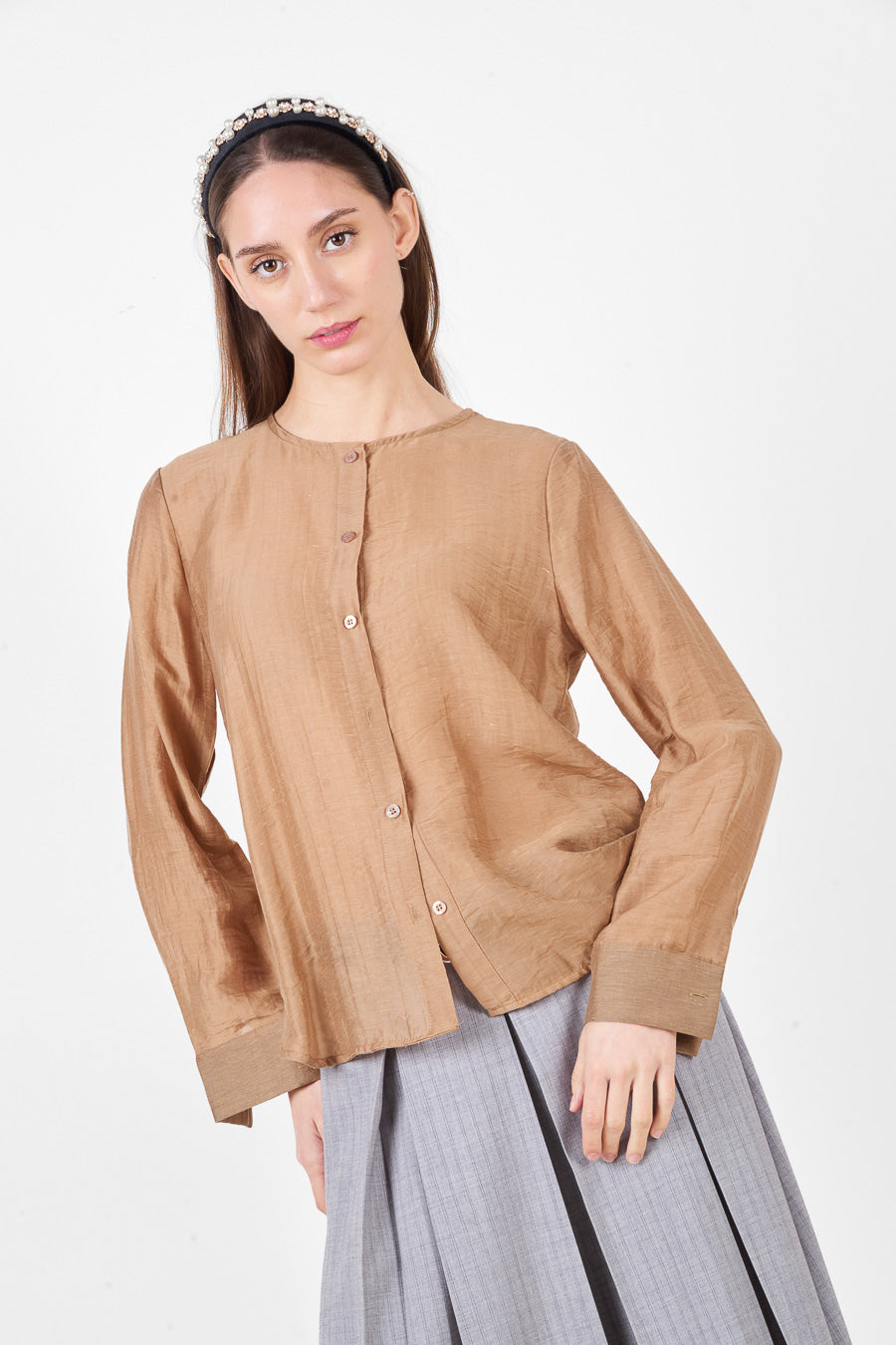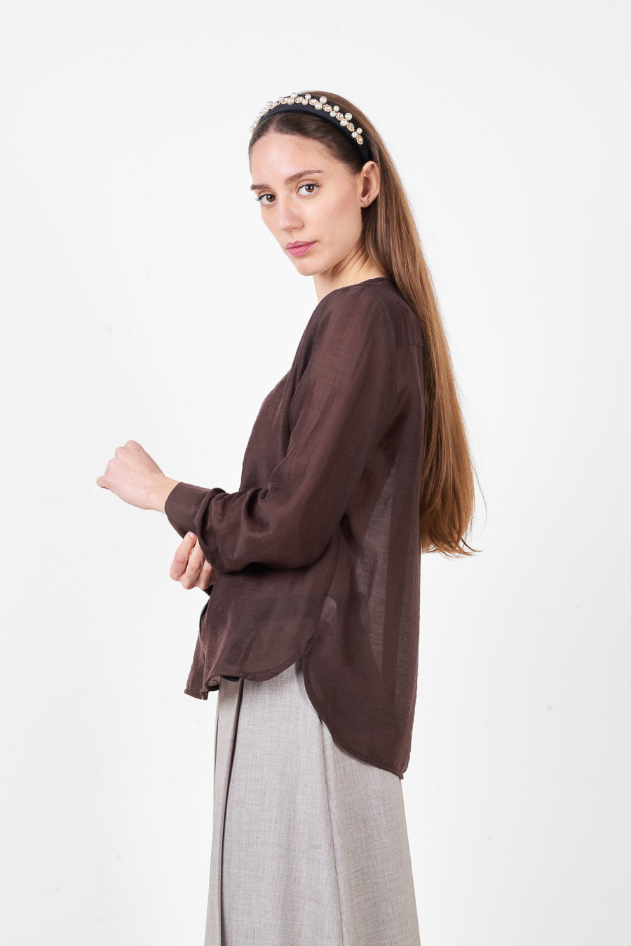 Лека риза с копчета и обло деколте с дълги ръкави на едро