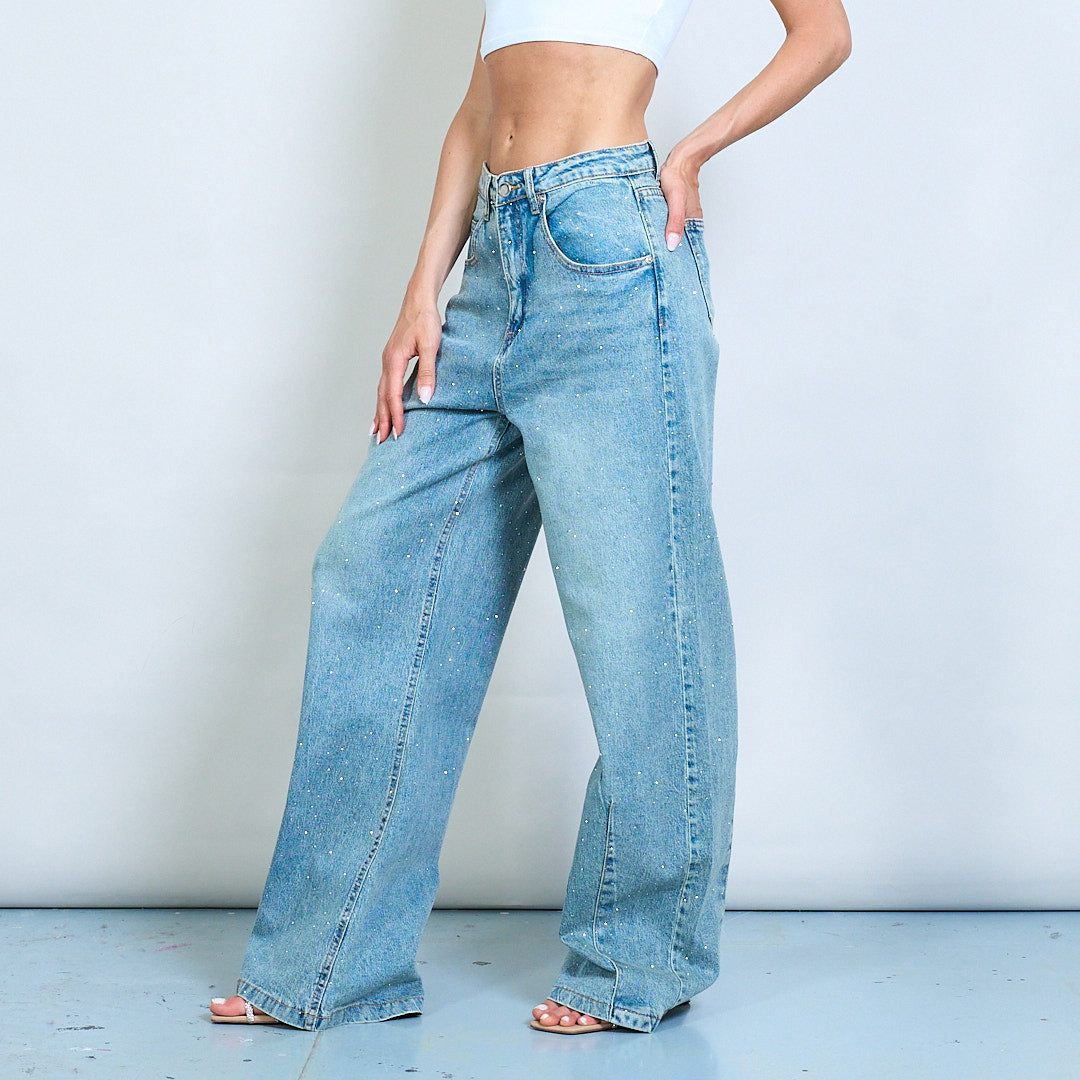- Класически дънки с прав крак с разкрасяване на кристален прах