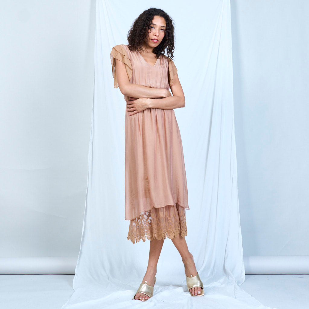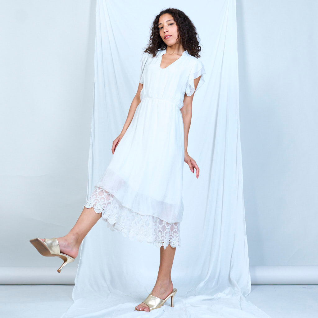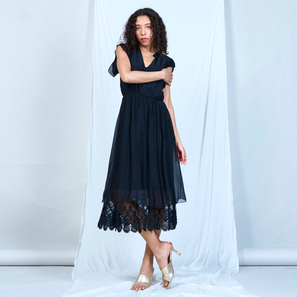 Рокля с ръкав от копринен шифон с дантелен подгъва на едро