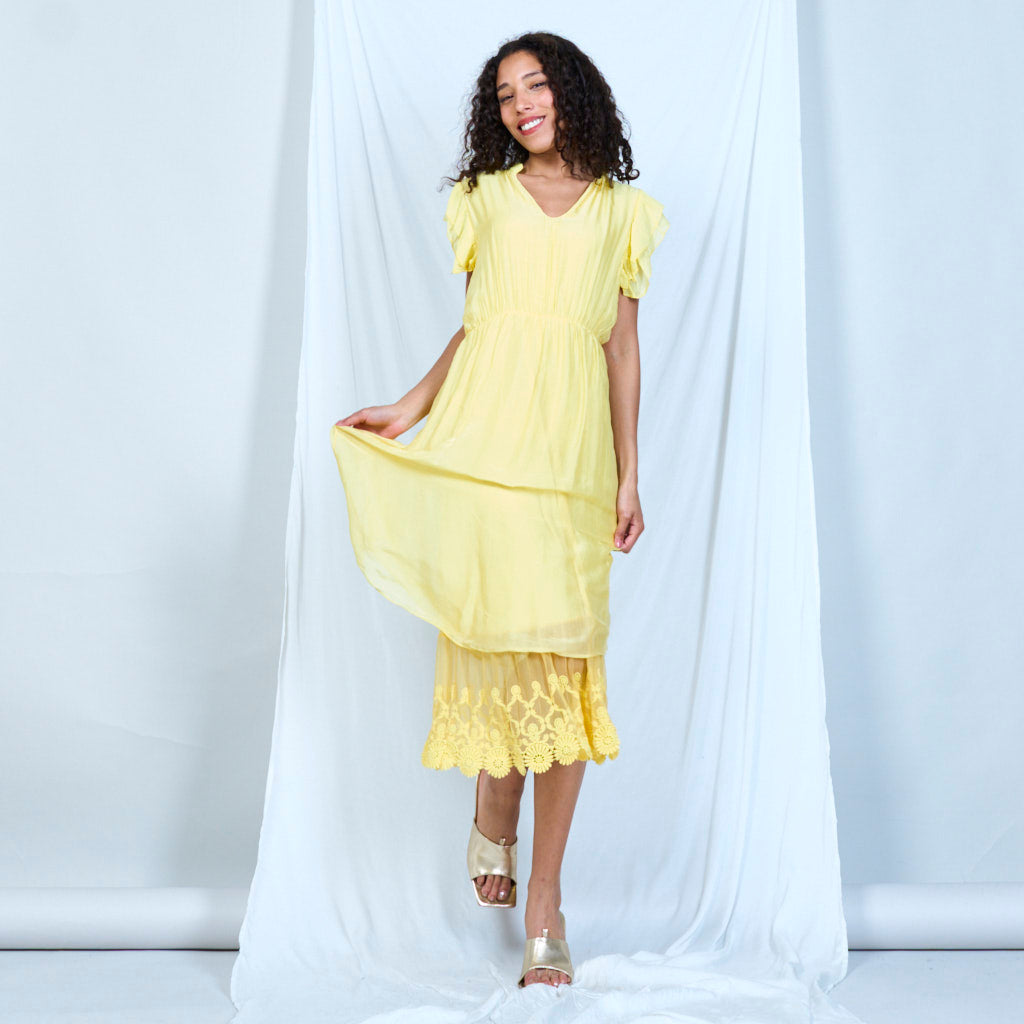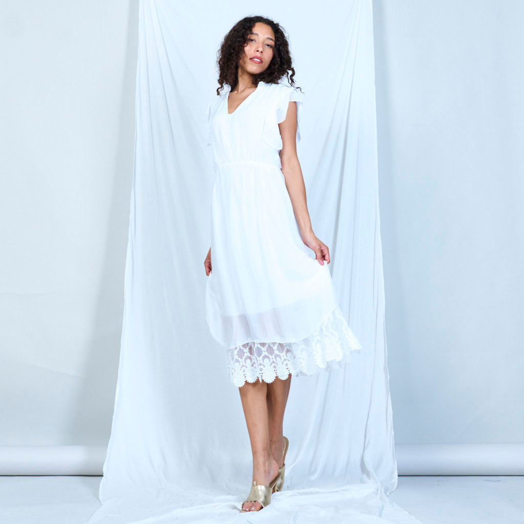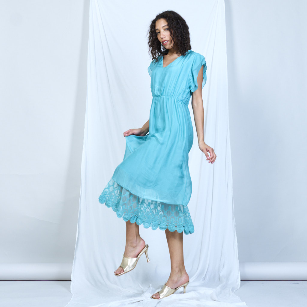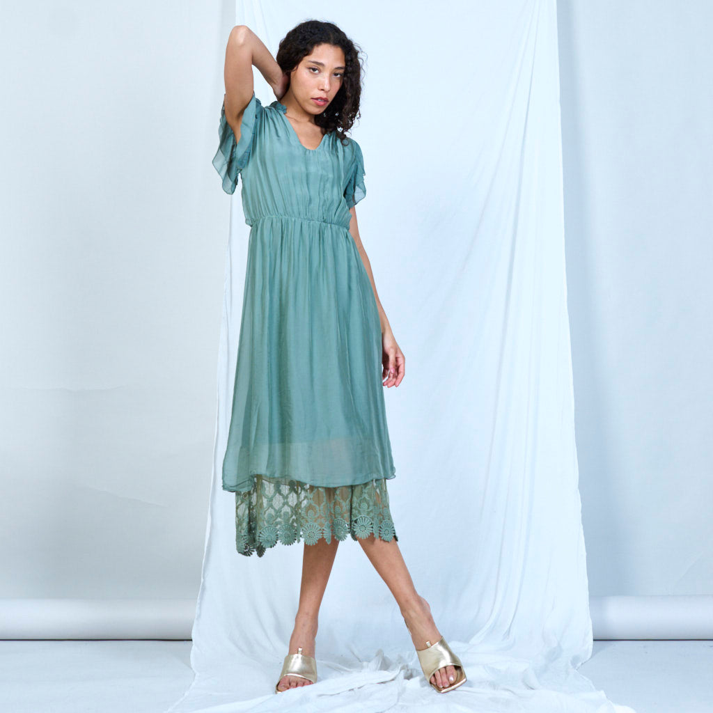Рокля с ръкав от копринен шифон с дантелен подгъва на едро