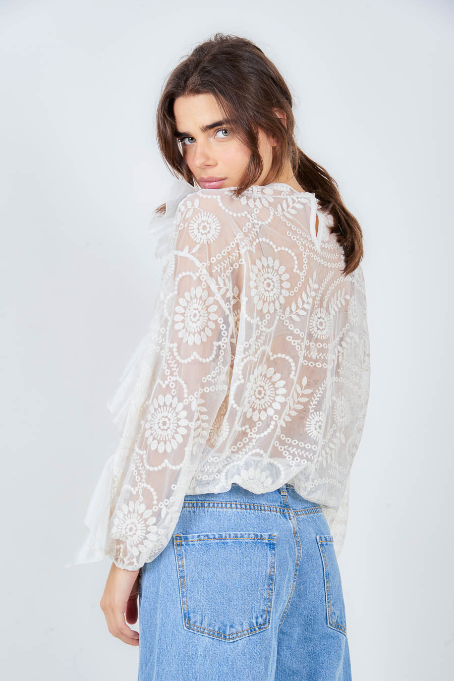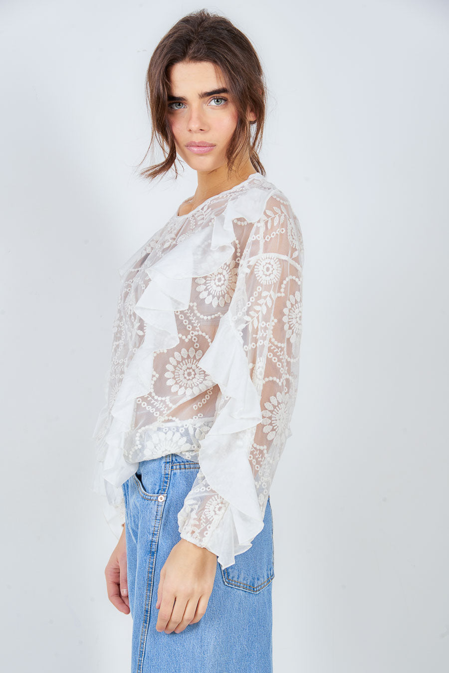 Прозрачна блуза с бродирани цветя с волани и балонени ръкави на едро
