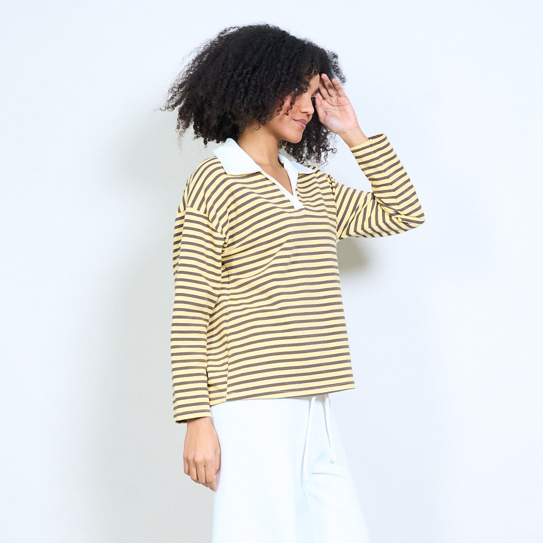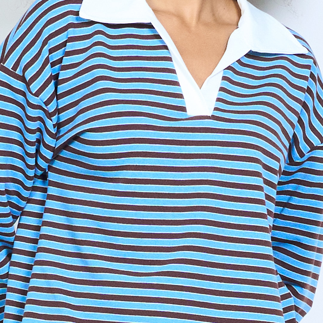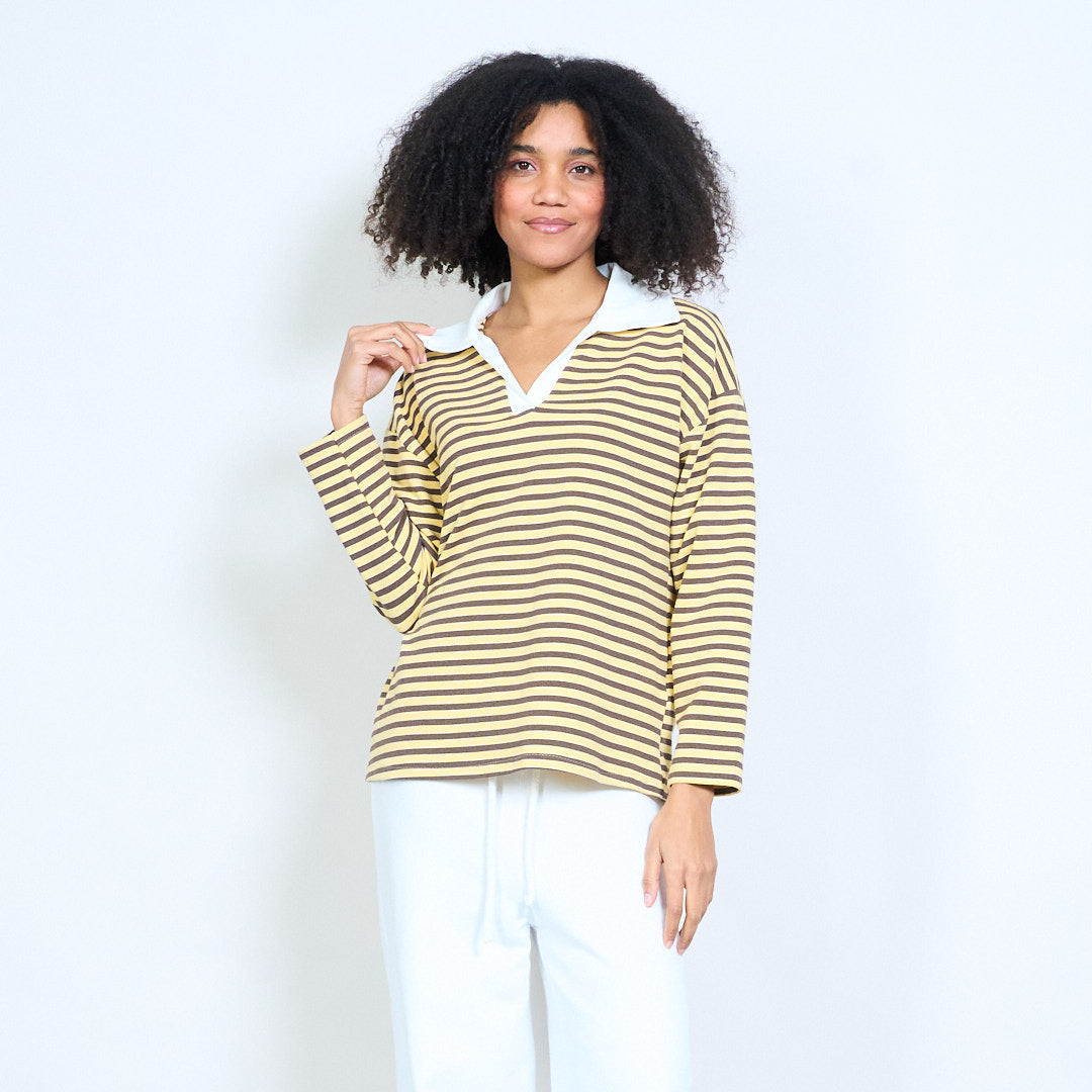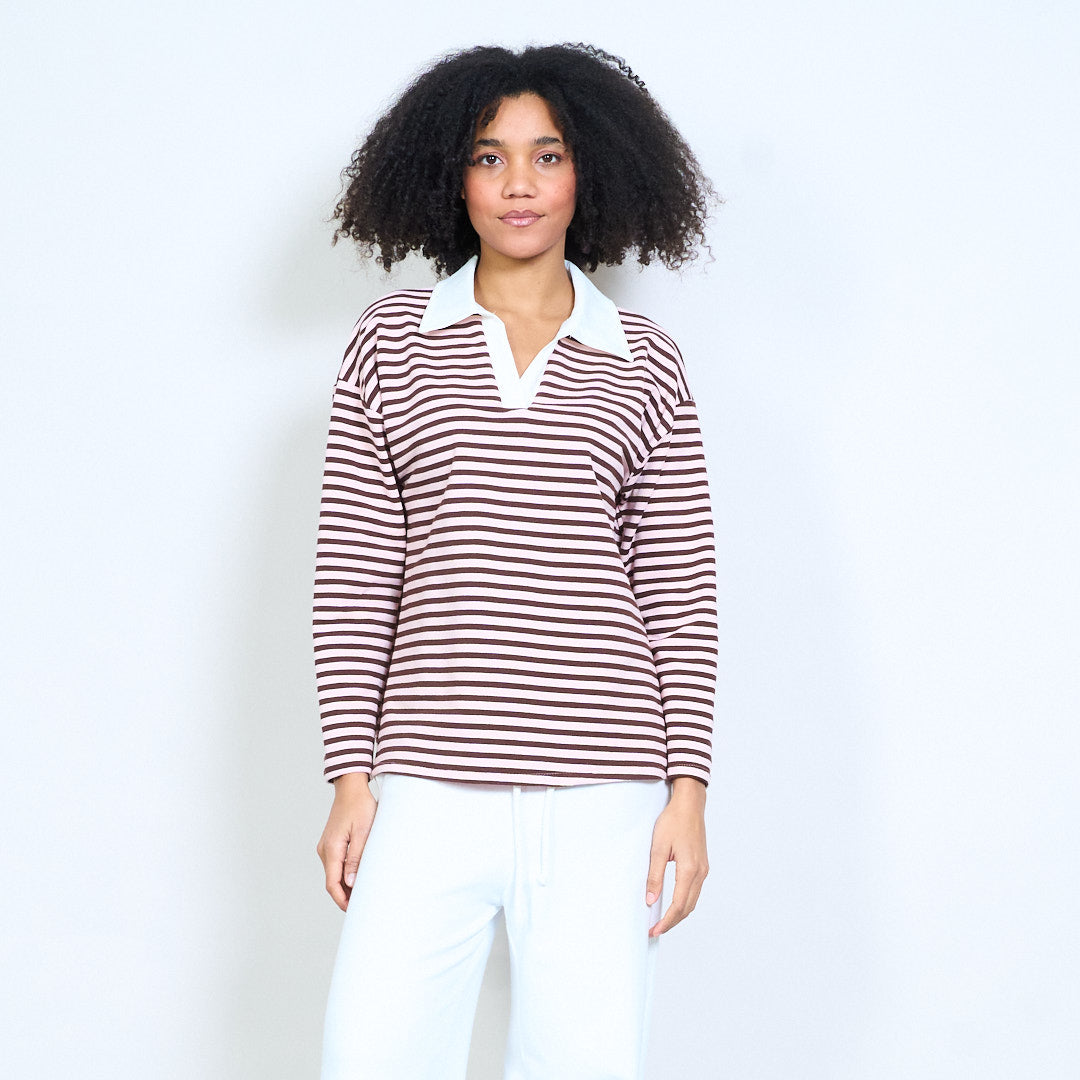 Блуза със спокойна кройка с контрастна яка с раирана деколте на едро