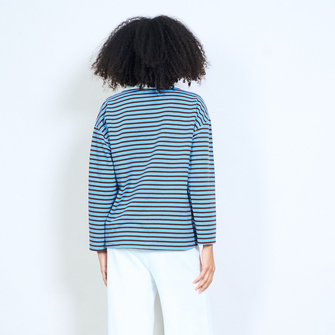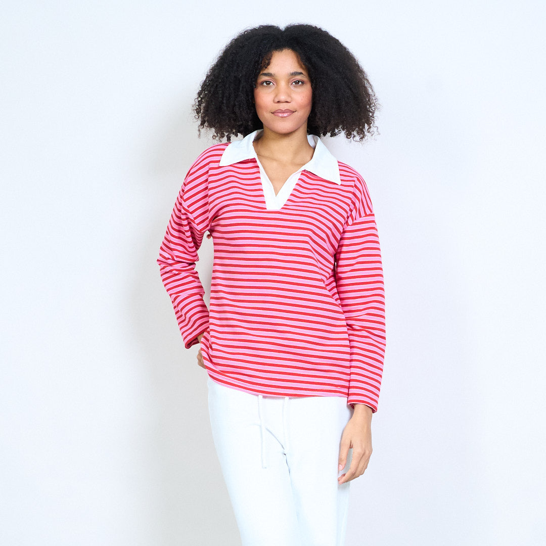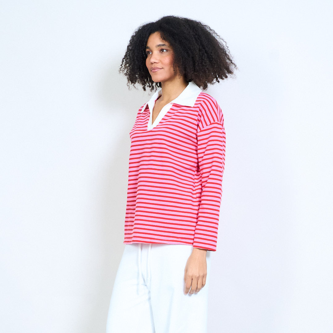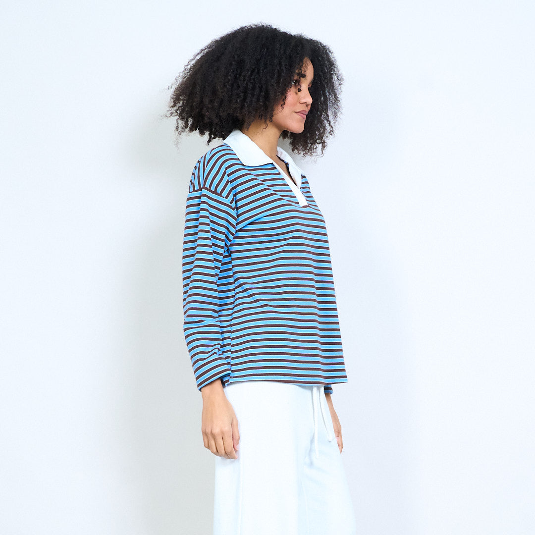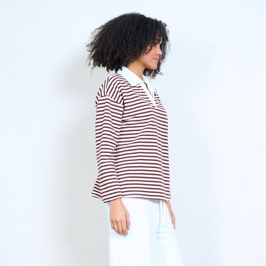 Блуза със спокойна кройка с контрастна яка с раирана деколте на едро