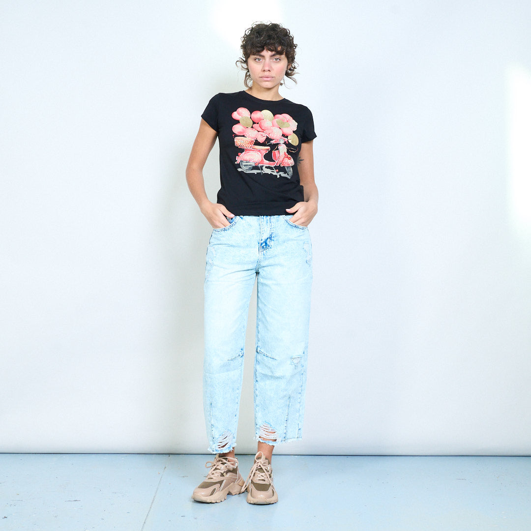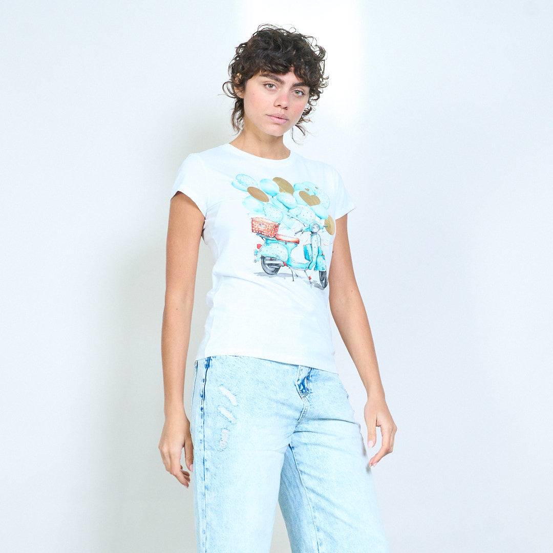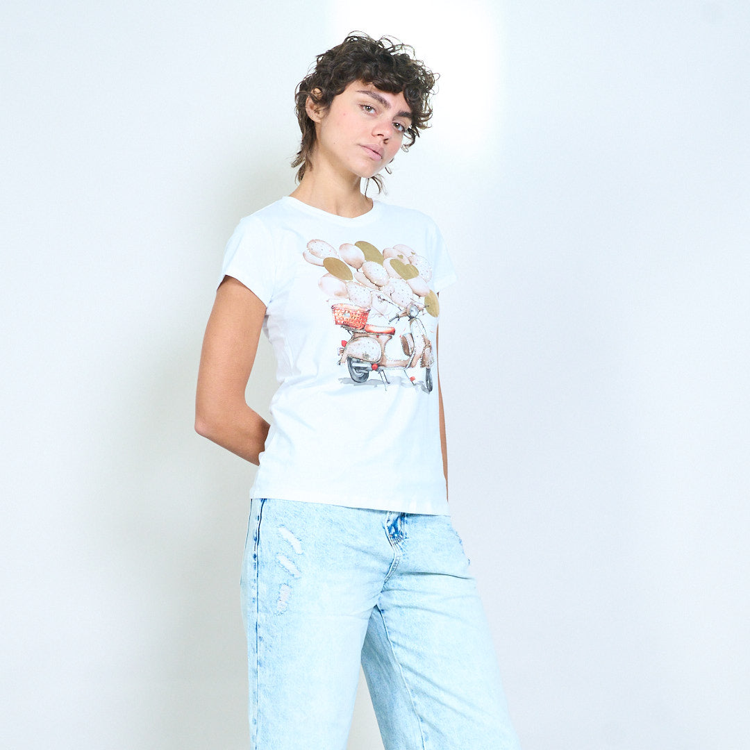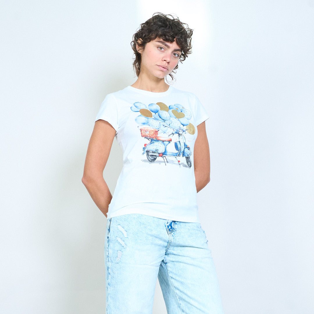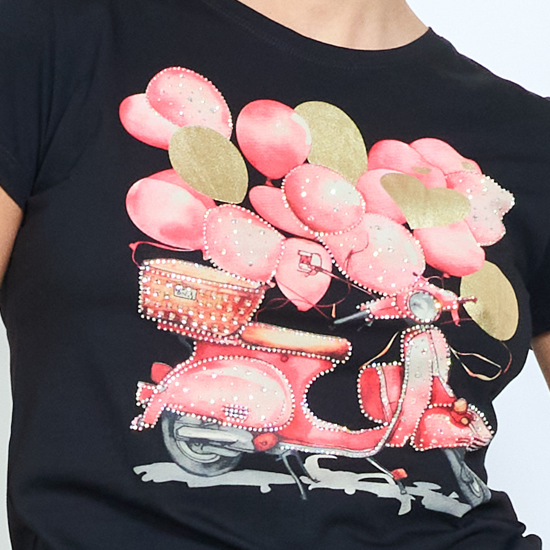 Скутер с украсена вталена тениска със сърце и балон на едро