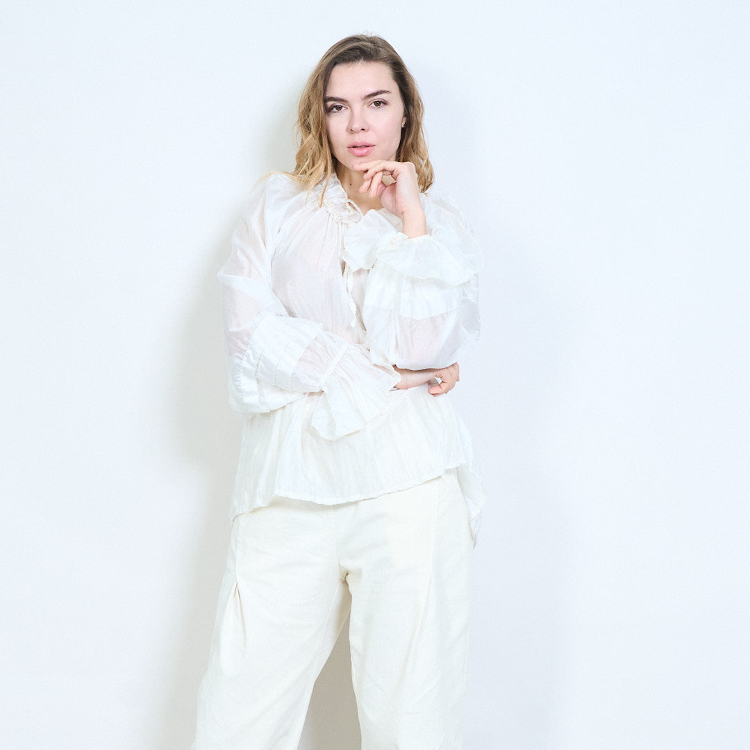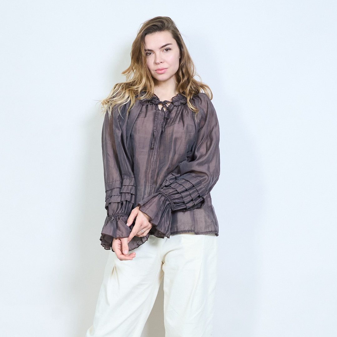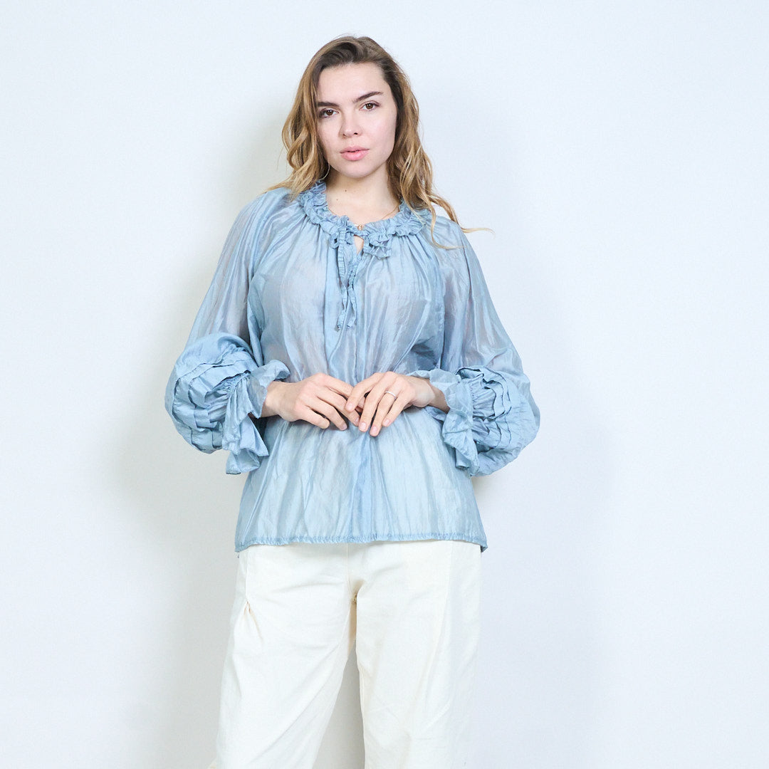 - Дълги ръкави, завършени с набрани маншети за допълнителна форма