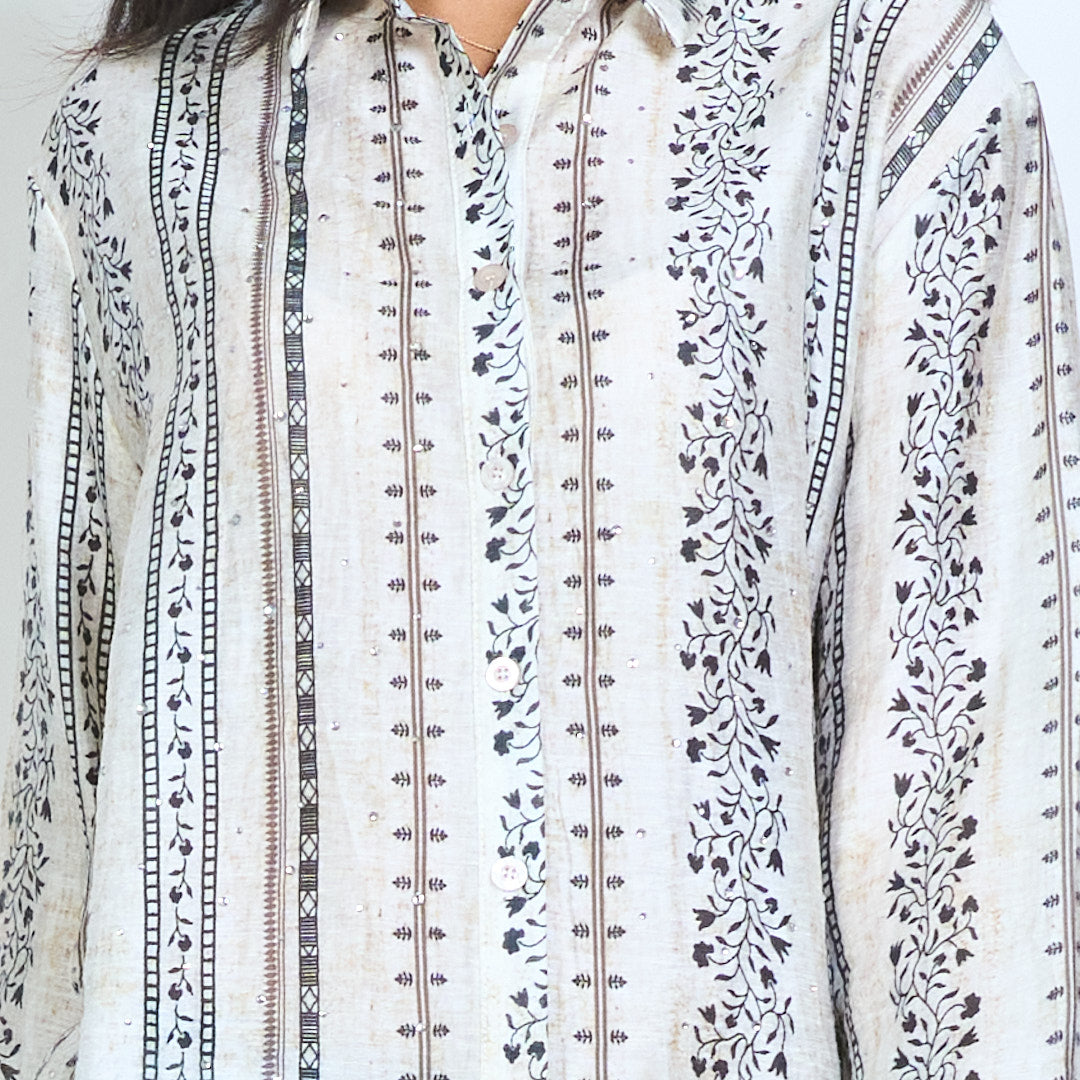 - Комбинацията от щампи на цветя и райета добавя детайлен и занаятчийски вид