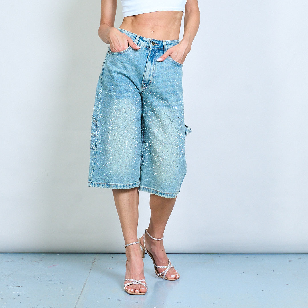 - Дънкови шорти с винтидж ефект на измиване и разпръснати кристални разкрасявания