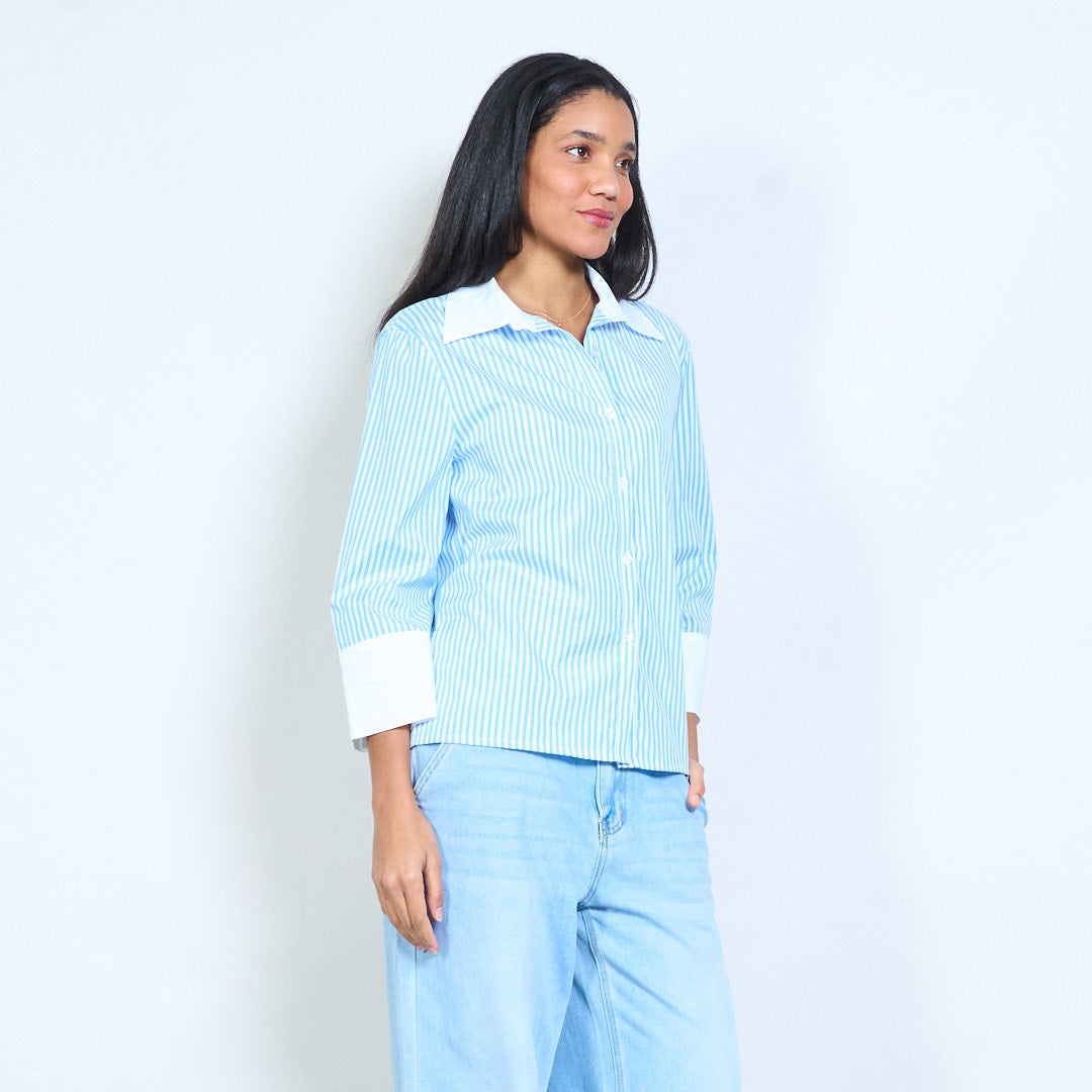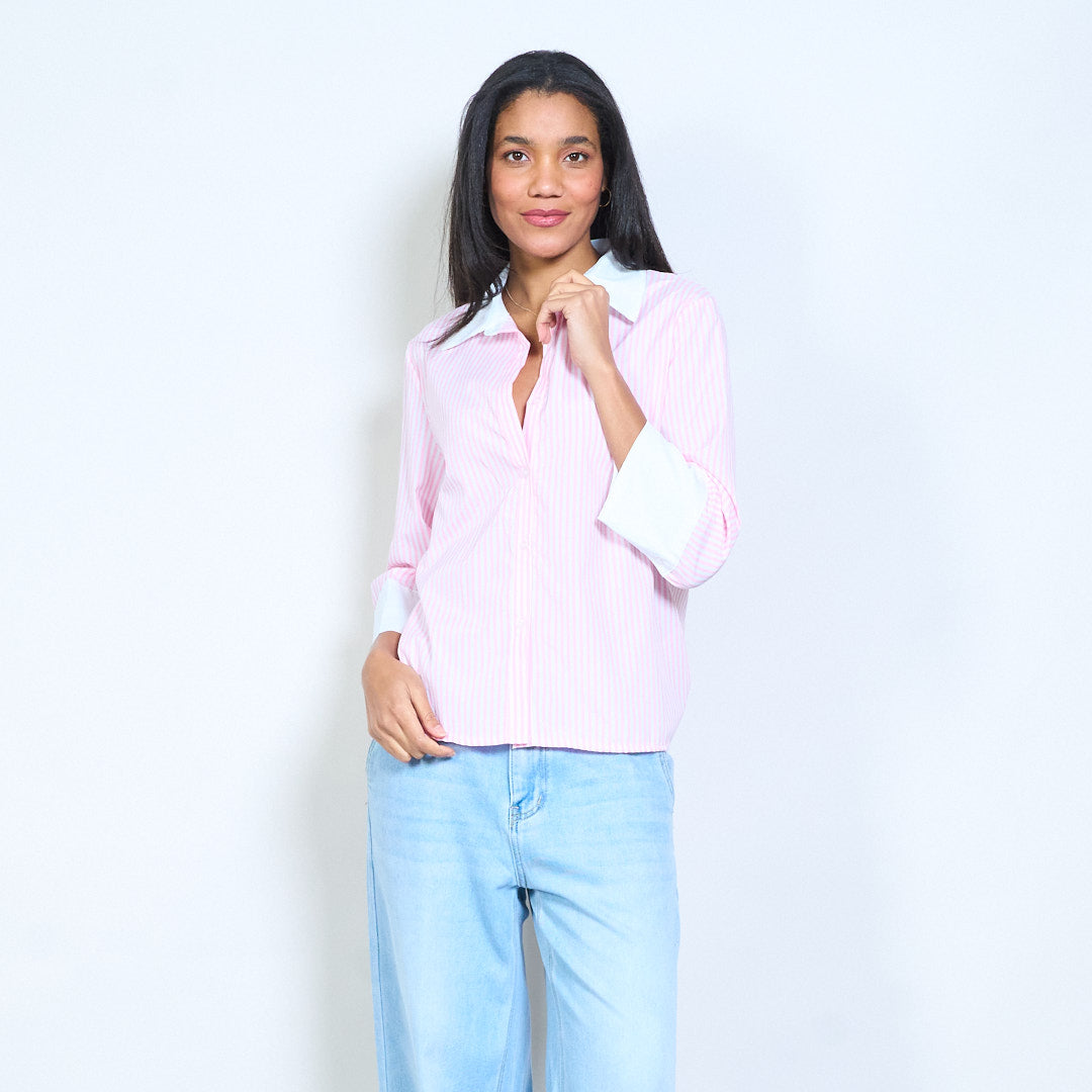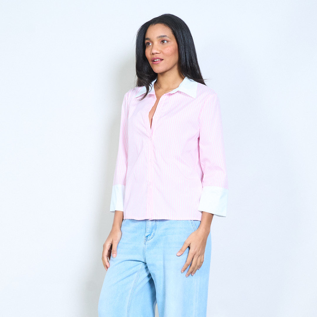 Раирана риза с копчета отпред с контрастна класическа яка и маншет с детайли на едро
